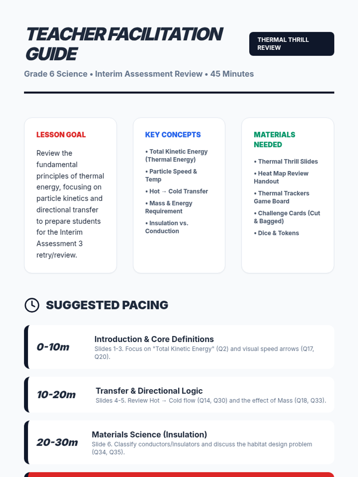 A comprehensive 45-minute review lesson focusing on thermal energy, particle movement, and heat transfer. Students revisit key concepts from their interim assessment through interactive slides and a collaborative board game.