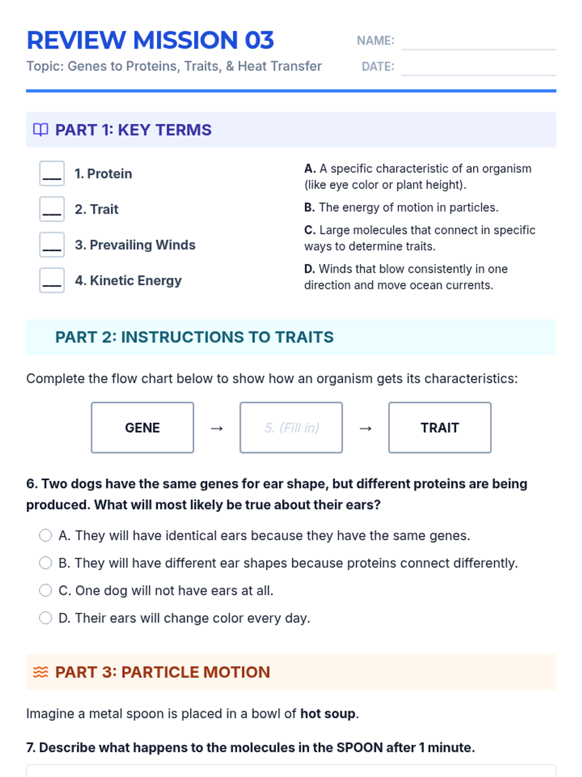 The third review mission focusing on the gene-protein-trait connection and the behavior of particles during heat transfer.
