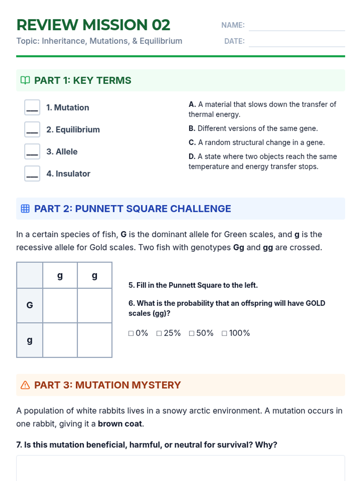 The second review mission covering genetic inheritance patterns, mutations, and thermal equilibrium.