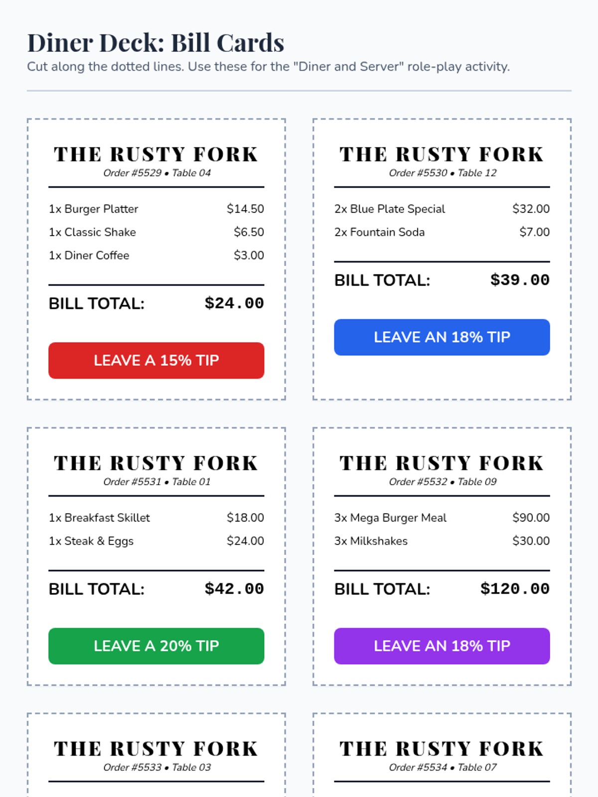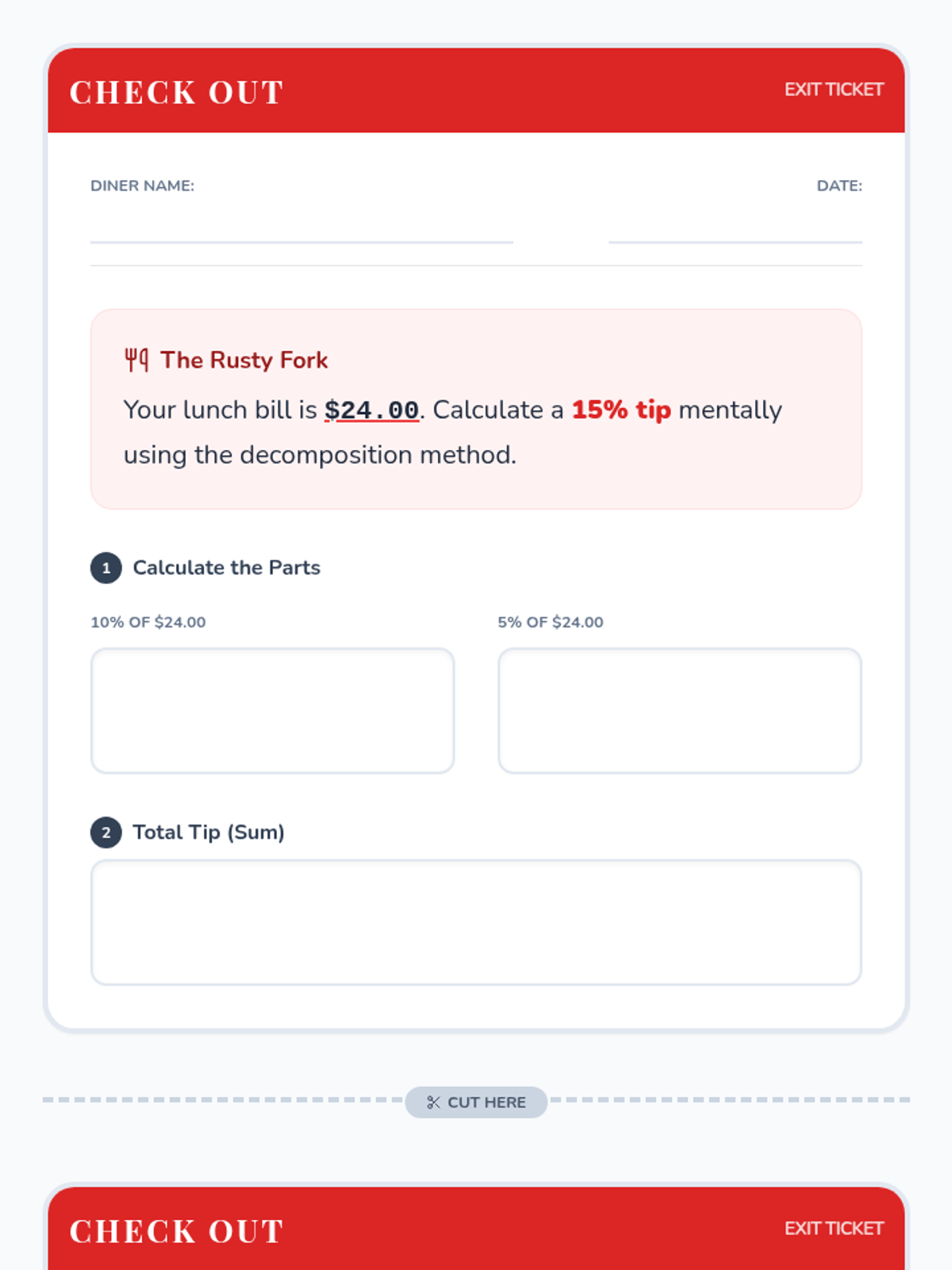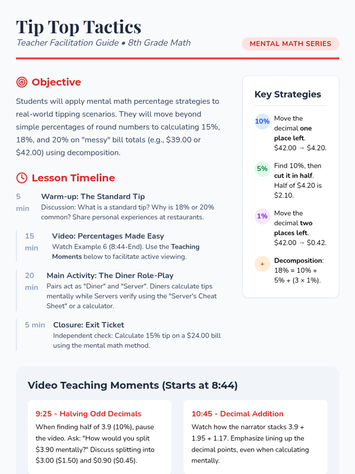 Students master mental math strategies to calculate percentages in real-world tipping scenarios, using decomposition methods (10%, 5%, 1%) to handle messy numbers.