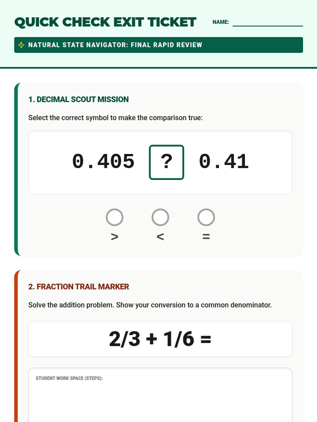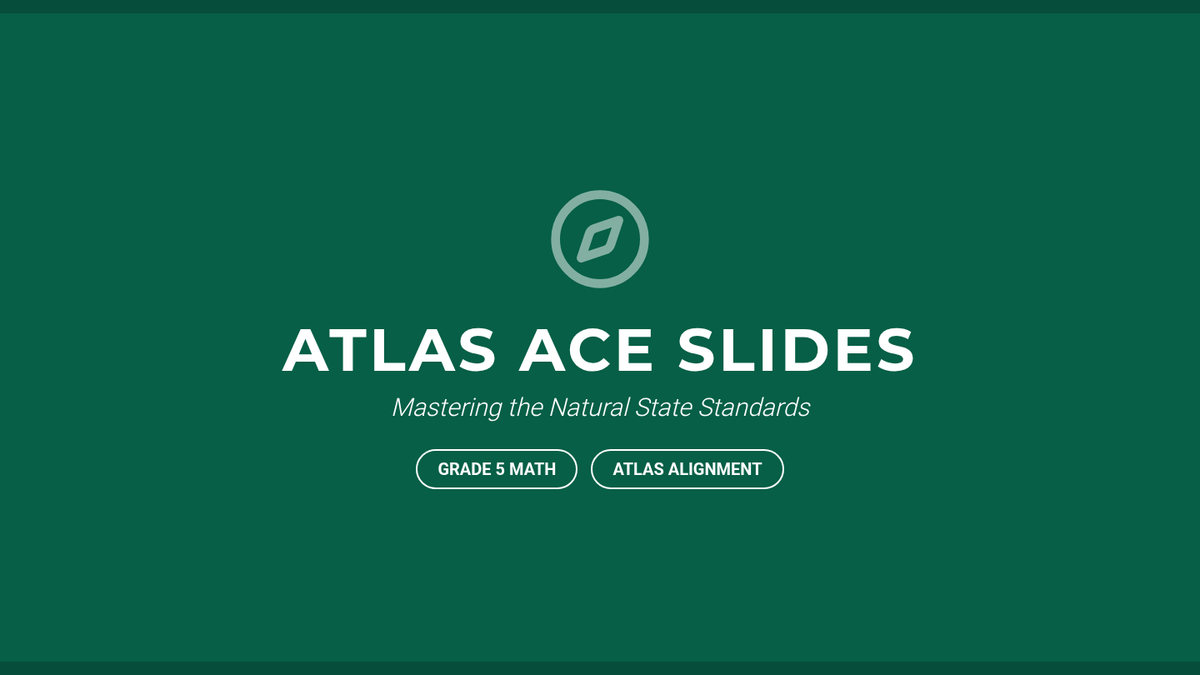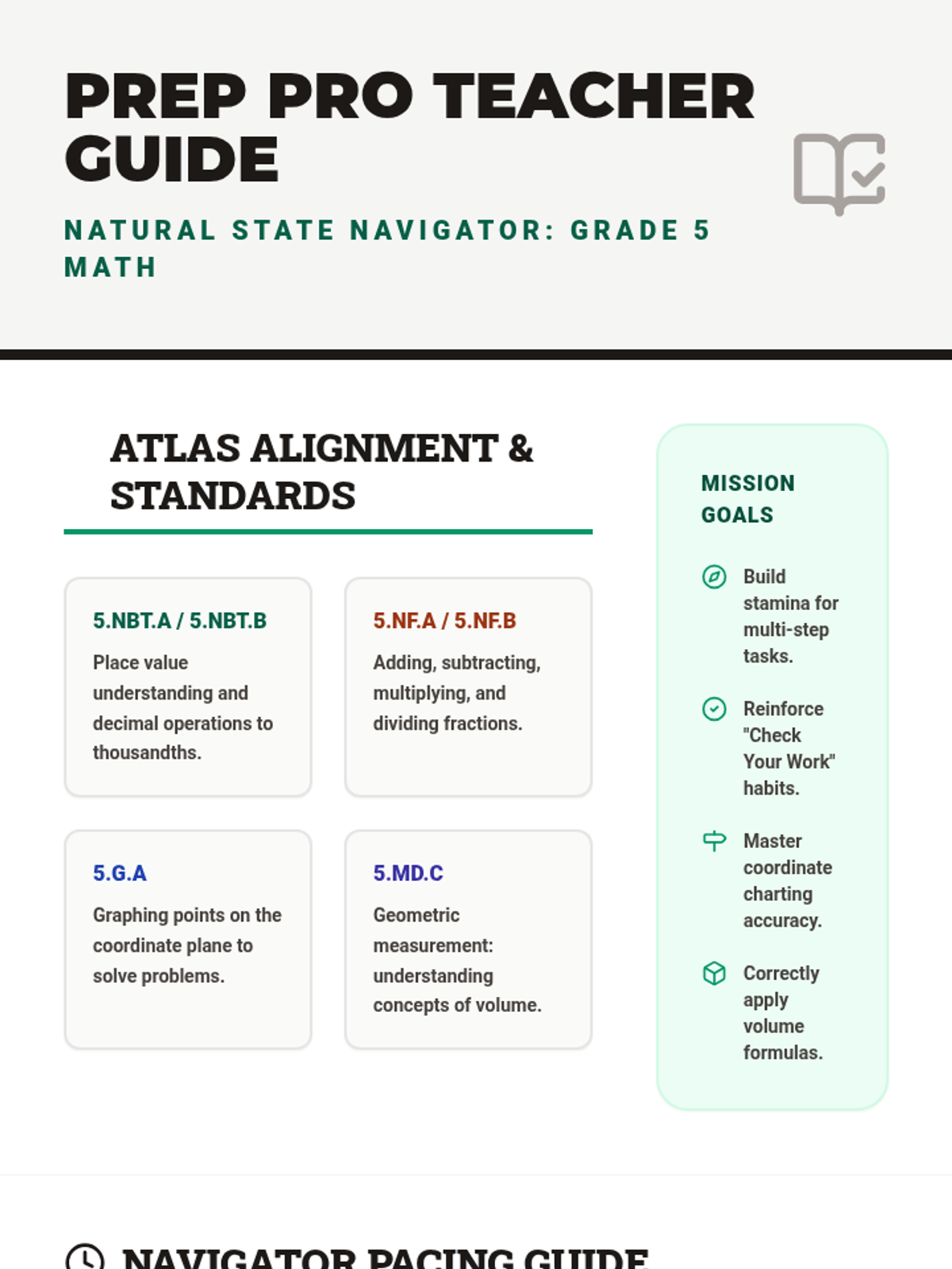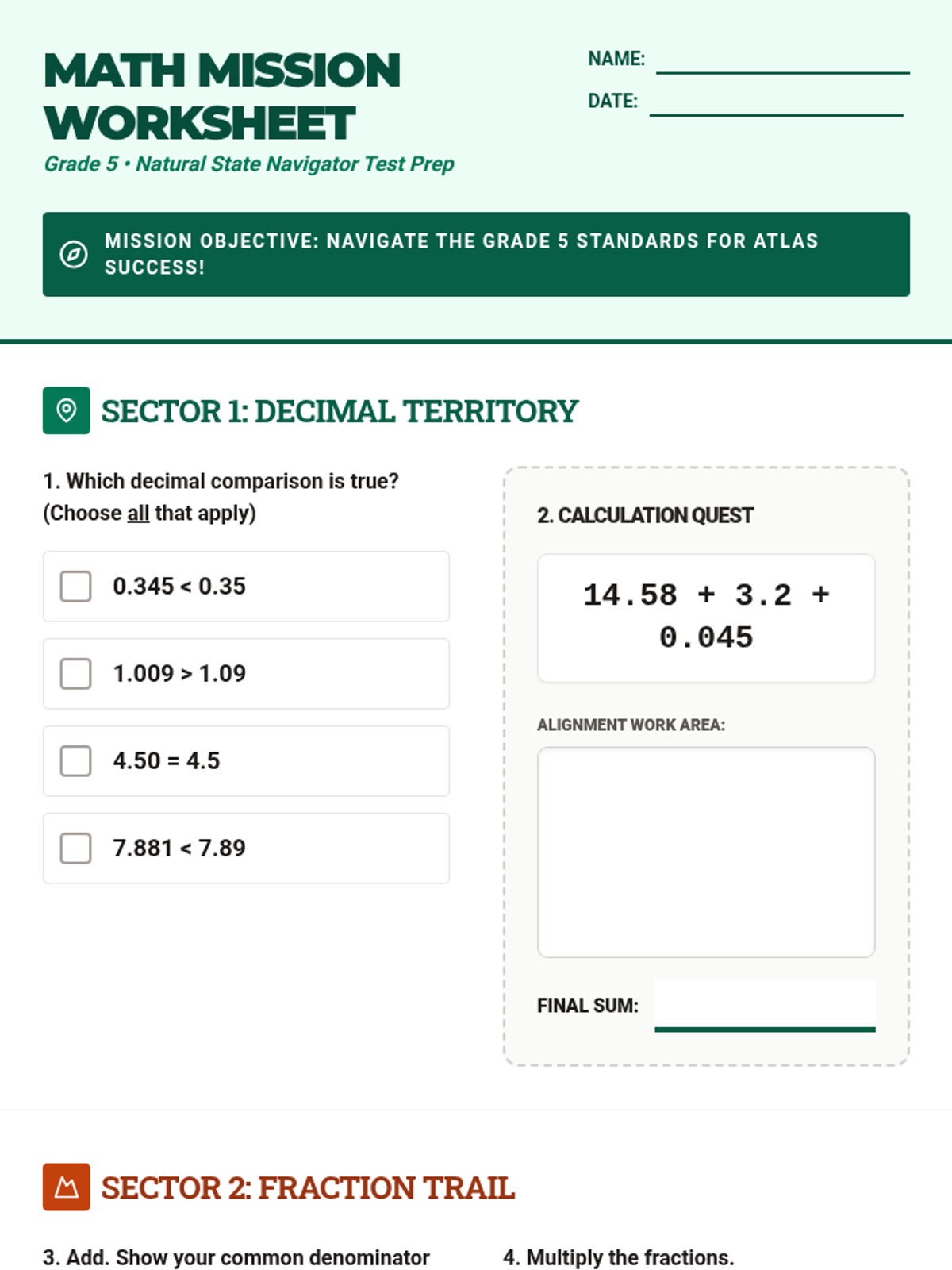 A comprehensive Grade 5 Math test prep lesson focused on Arkansas ATLAS standards, covering fractions, decimals, coordinate planes, and volume through a "Natural State Navigator" wilderness theme.