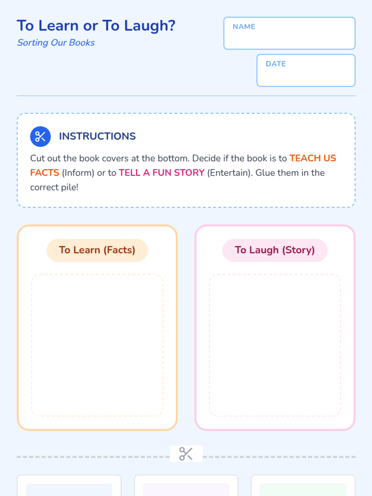 Students are introduced to the concepts of 'informing' (teaching facts) and 'entertaining' (telling a fun story) by sorting books into piles.