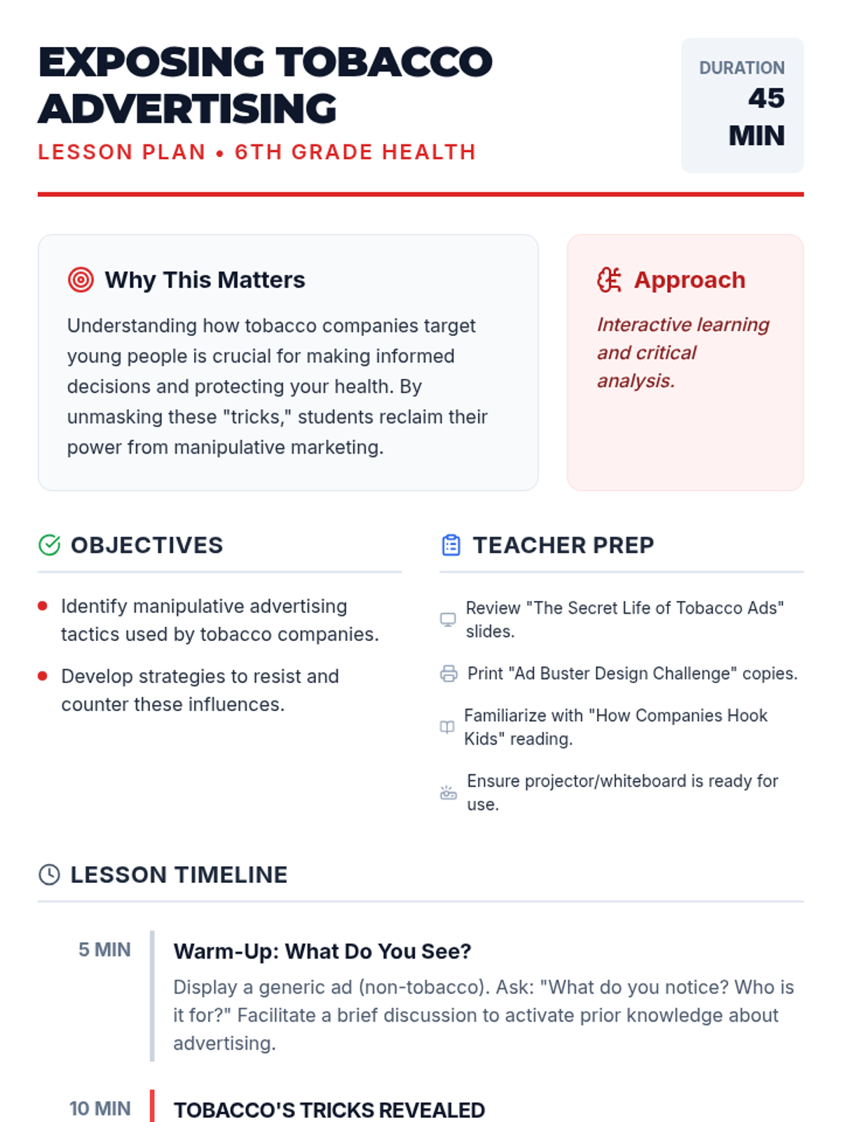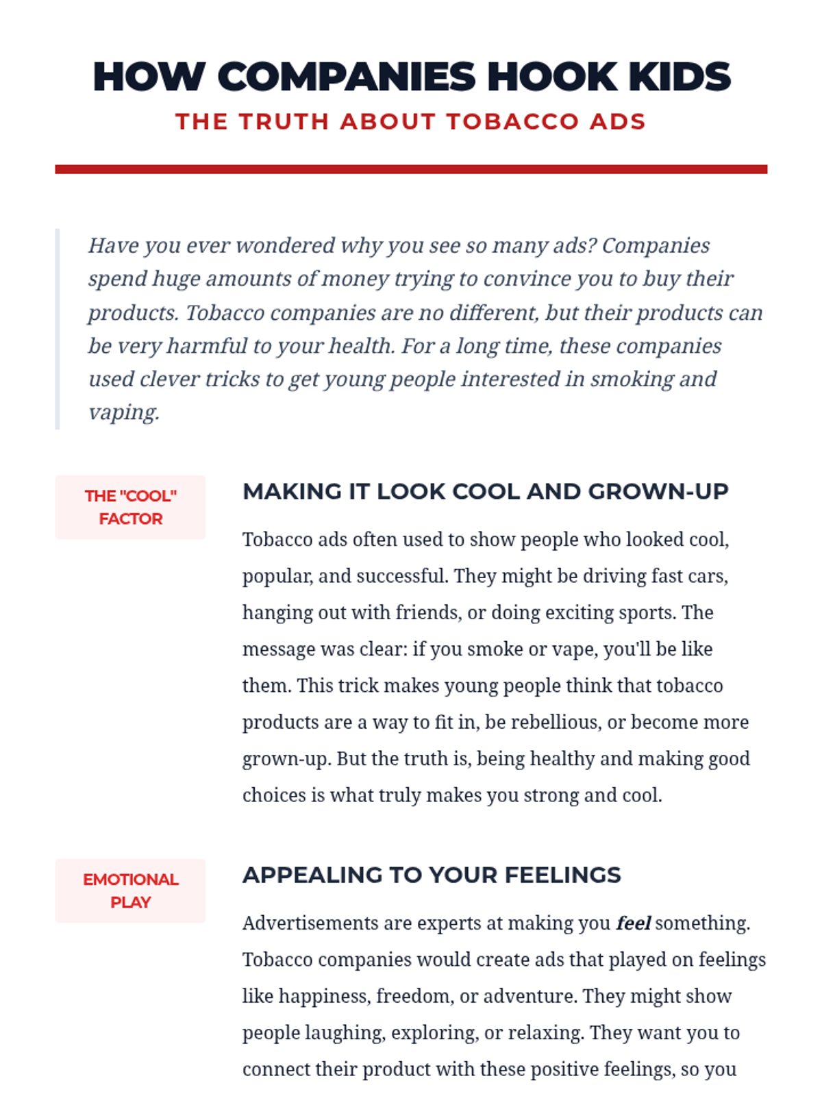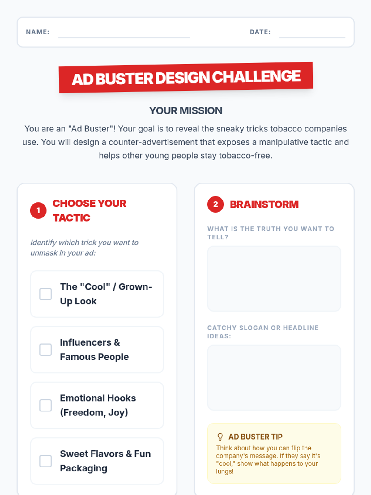 This lesson unmasks the sneaky tactics tobacco companies use to target young people. Students will develop critical thinking skills to identify and resist manipulative advertising through a reading, discussion, and creative design challenge.