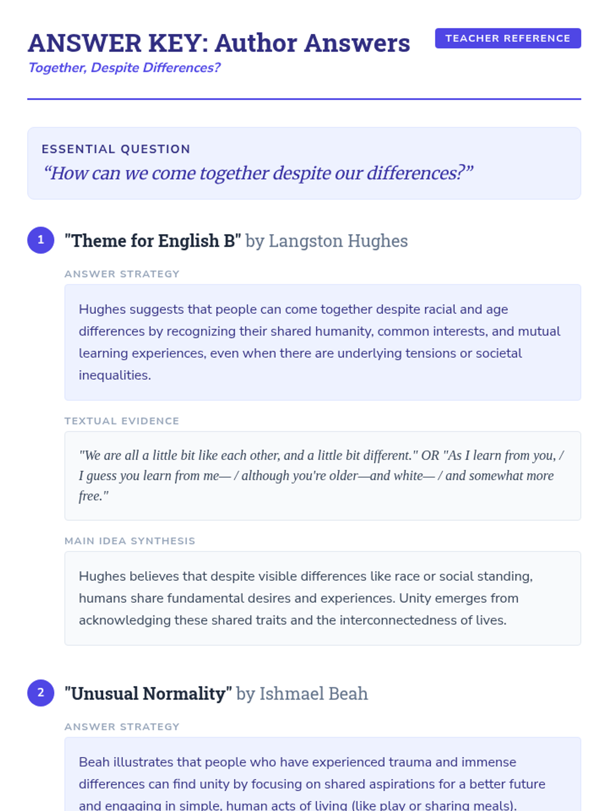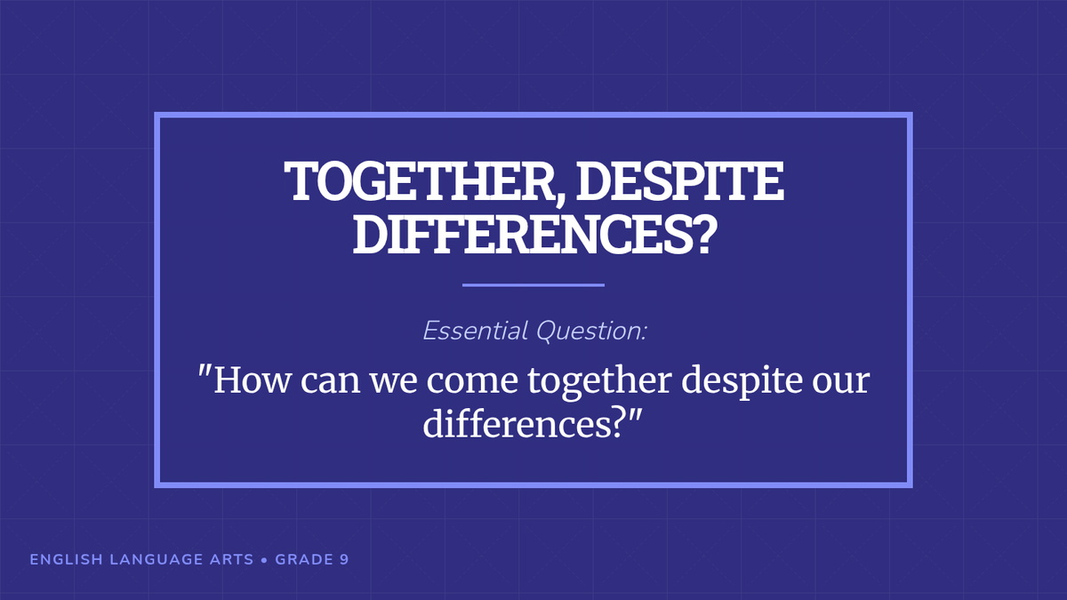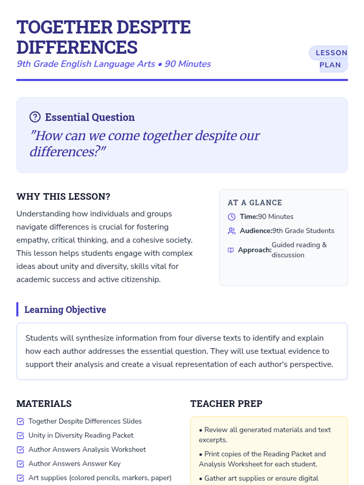 A 90-minute 9th-grade English Language Arts lesson exploring unity and diversity through four major texts: Langston Hughes, Ishmael Beah, Anna Quindlen, and Abraham Lincoln. Students analyze authorial perspectives, discuss the essential question of coming together, and synthesize their learning through visual metaphors.