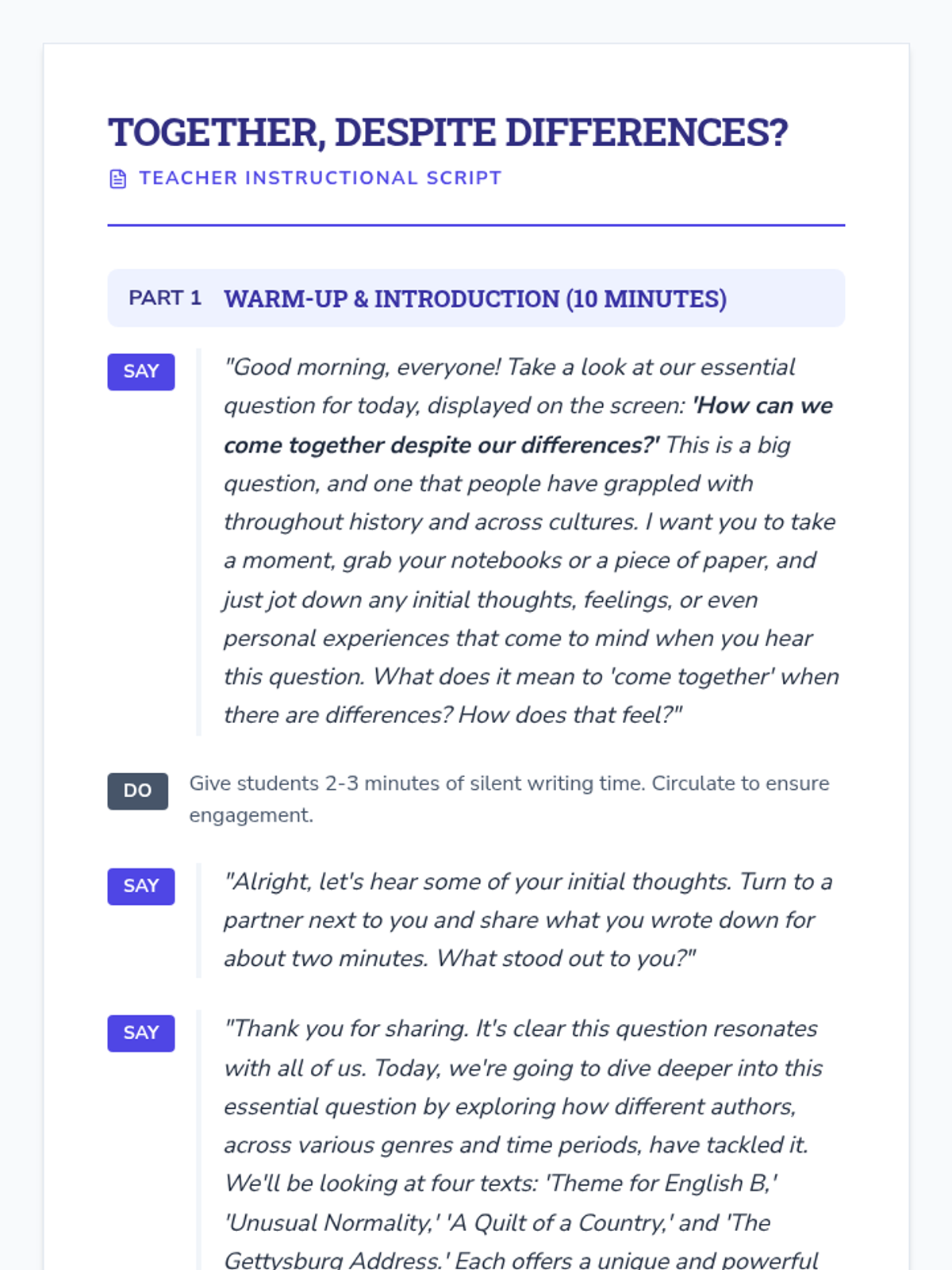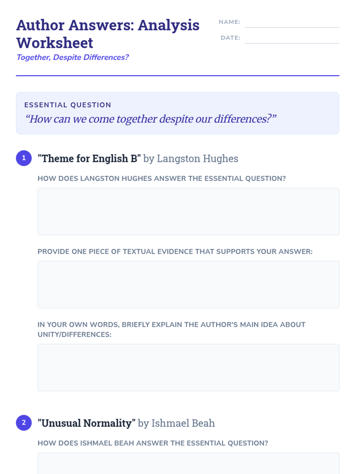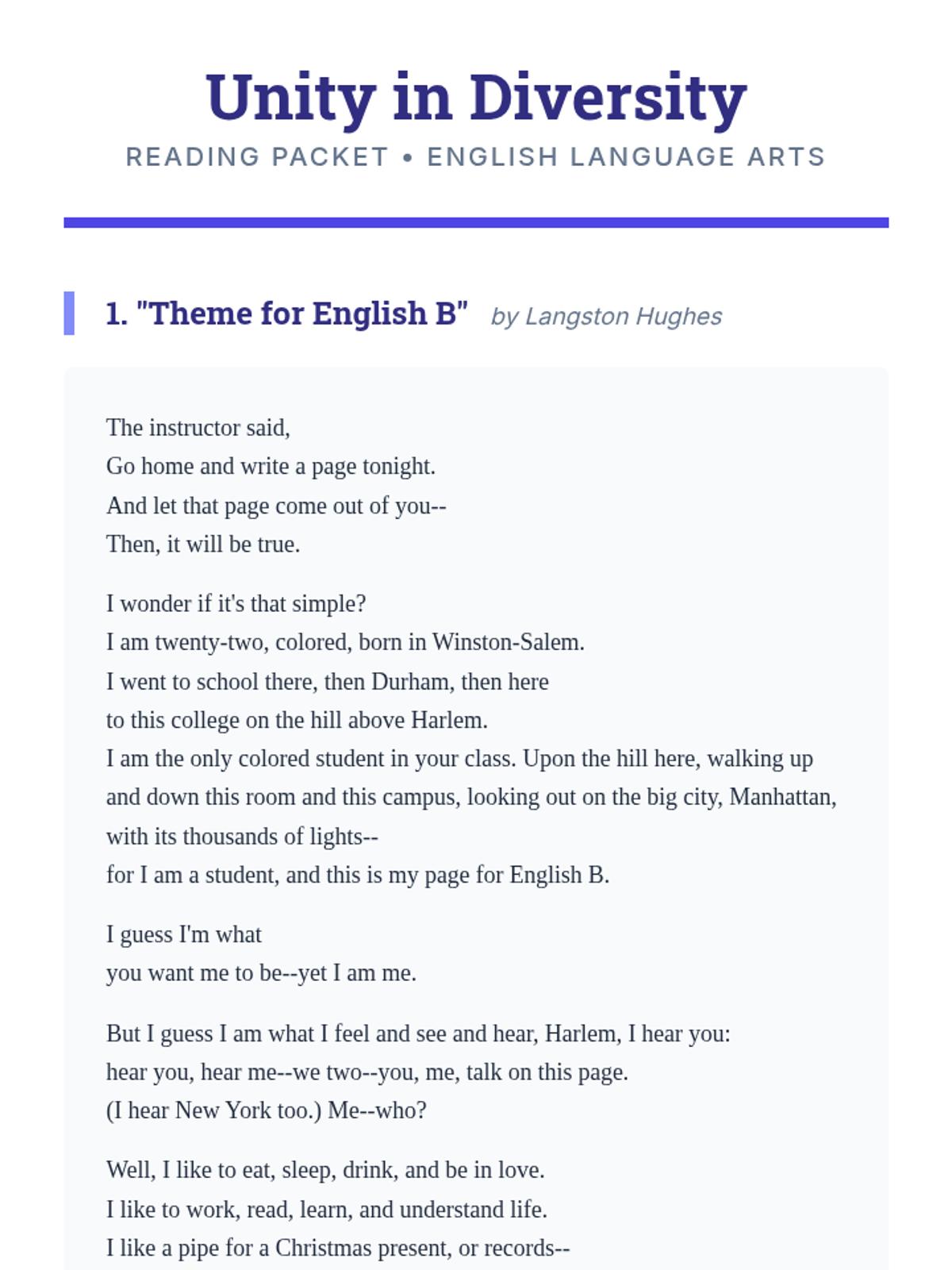 A 90-minute 9th-grade English Language Arts lesson exploring unity and diversity through four major texts: Langston Hughes, Ishmael Beah, Anna Quindlen, and Abraham Lincoln. Students analyze authorial perspectives, discuss the essential question of coming together, and synthesize their learning through visual metaphors.