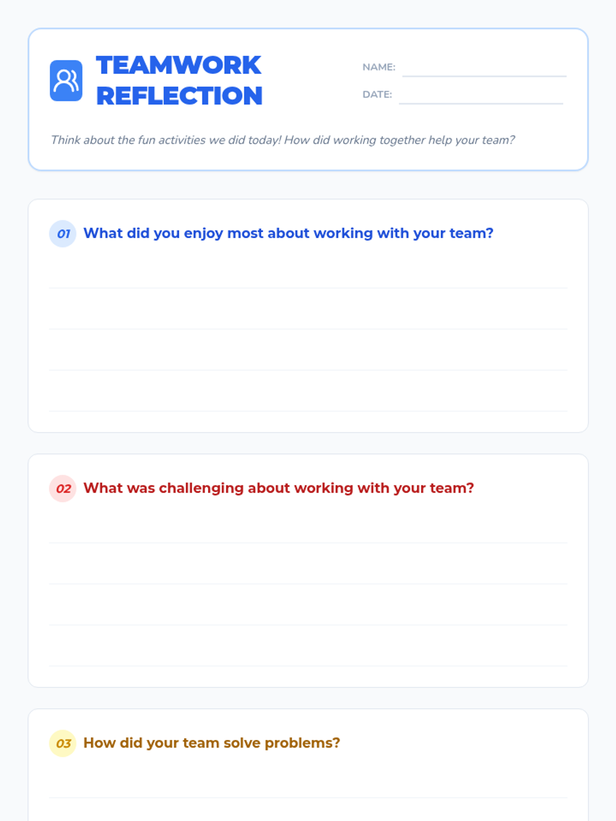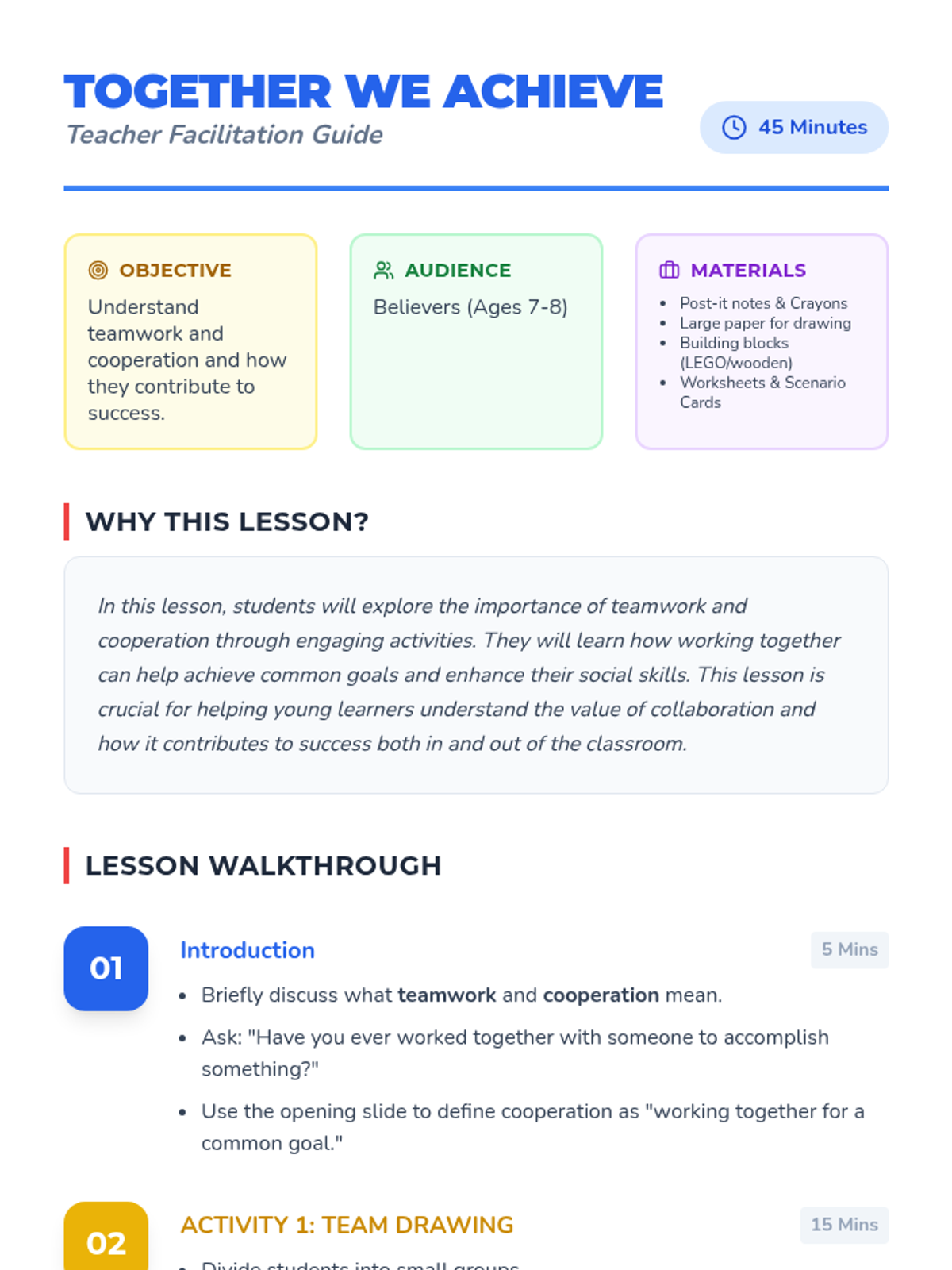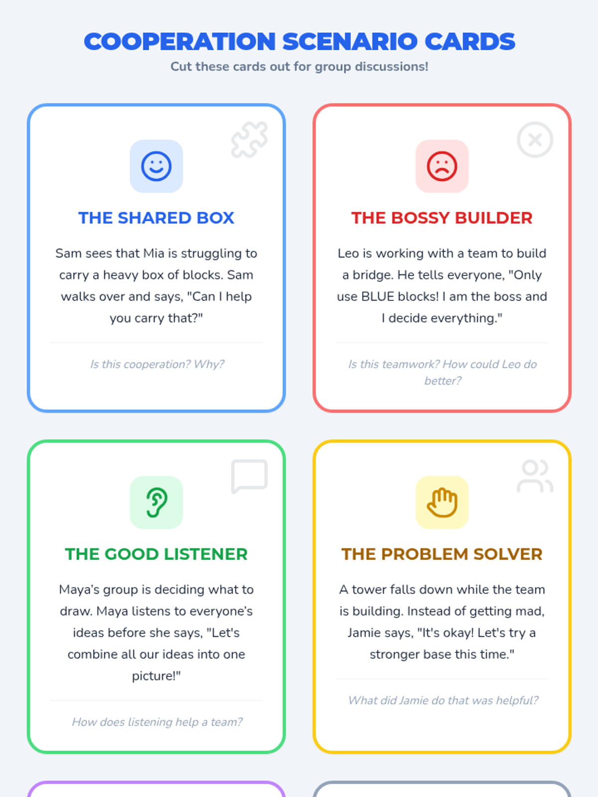 Students explore the importance of teamwork and cooperation through drawing and building activities, learning how to achieve common goals together.