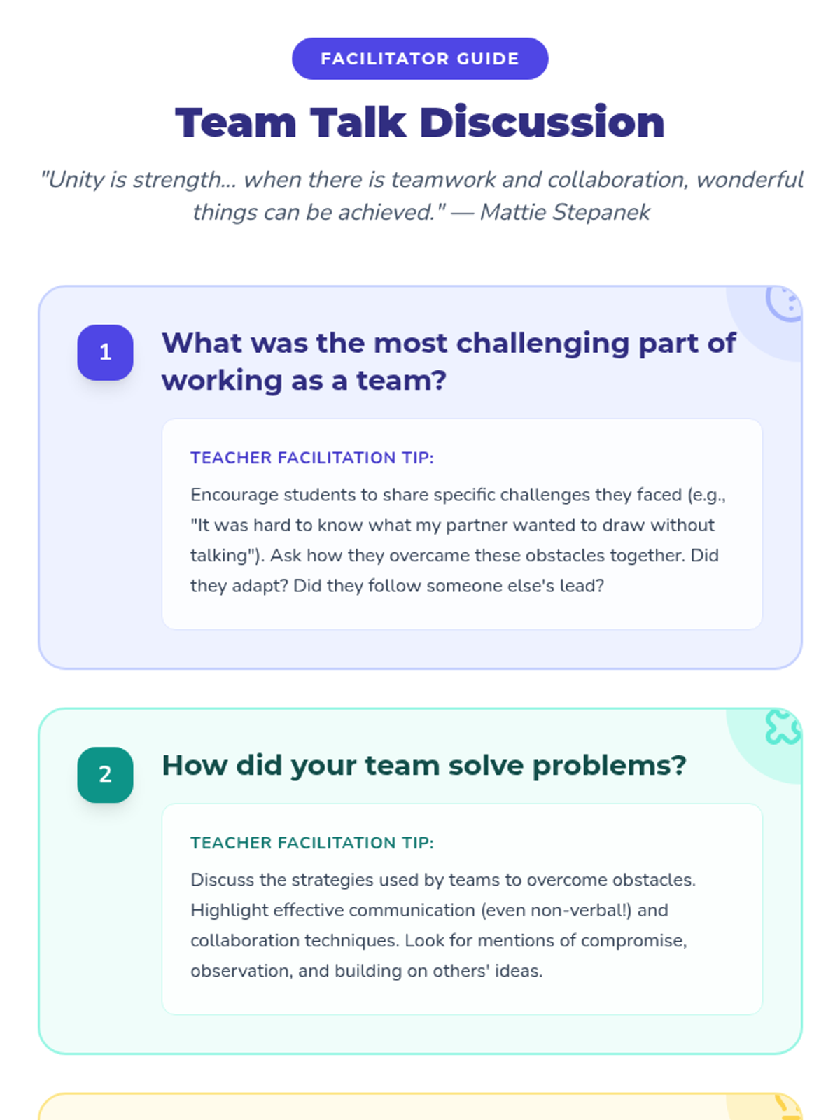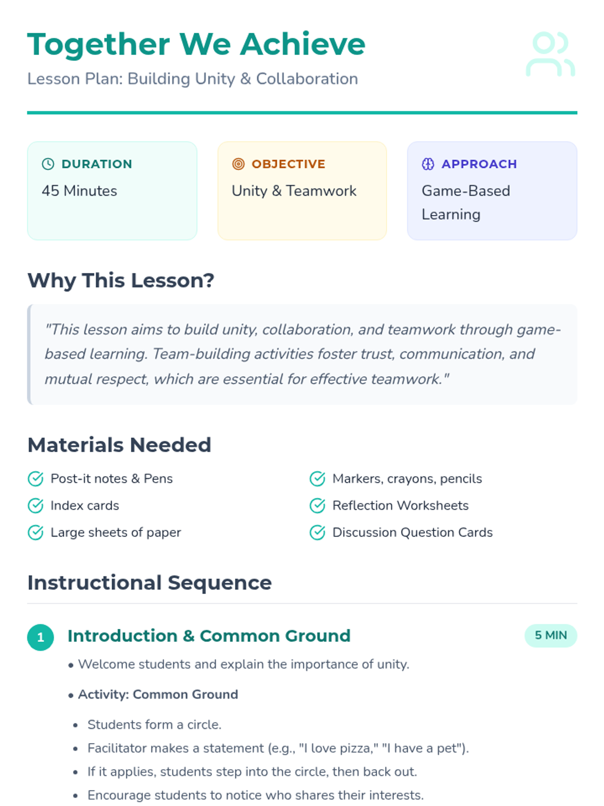 A game-based lesson focused on building unity, collaboration, and teamwork through interactive activities and reflection. Students explore shared commonalities and experience the challenges and rewards of silent collaboration.