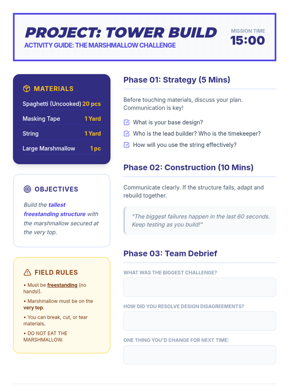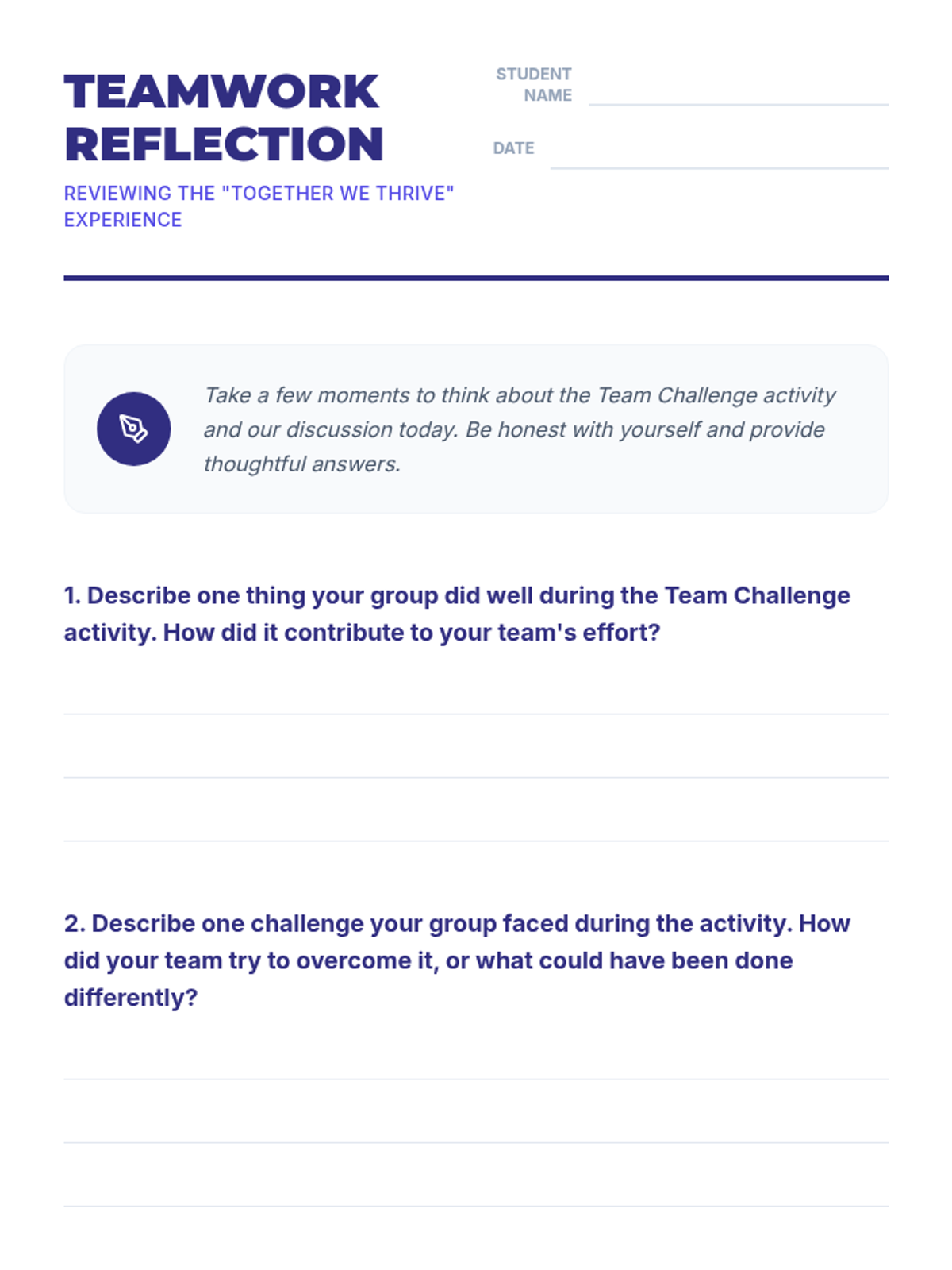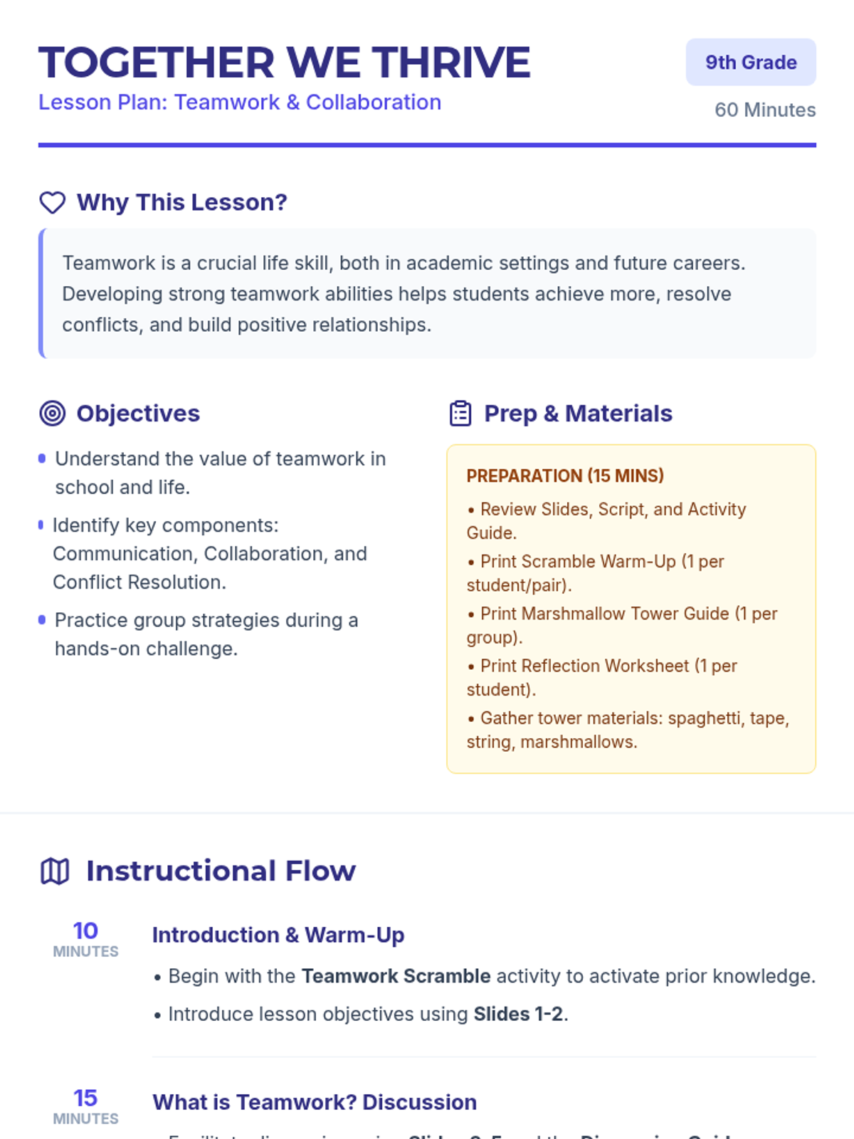 A 60-minute lesson for 9th graders exploring the power of teamwork through interactive discussion, a hands-on Marshmallow Tower challenge, and individual reflection. Students develop practical skills in communication, collaboration, and conflict resolution.