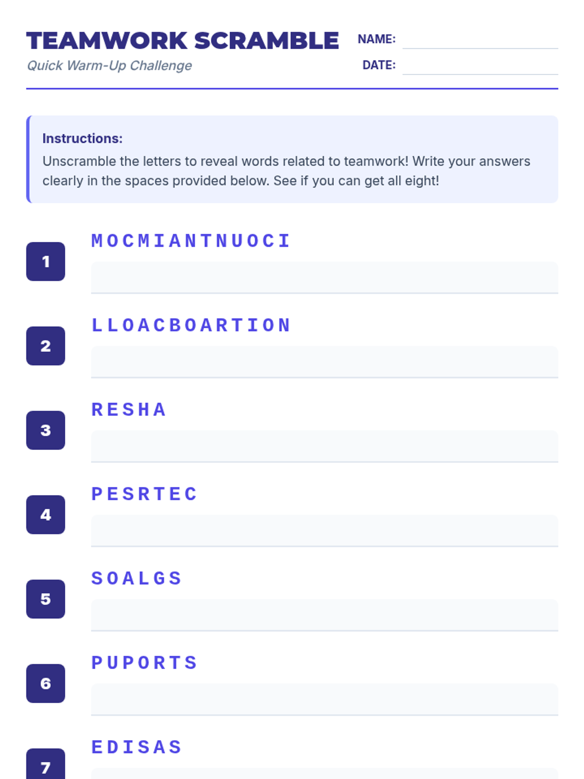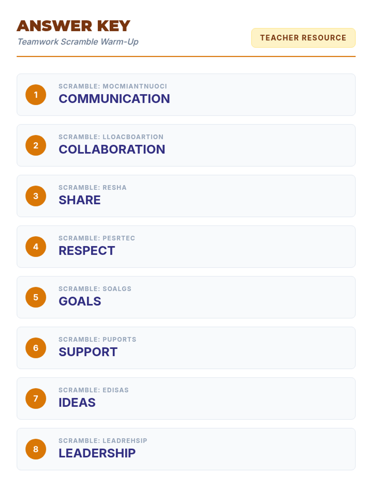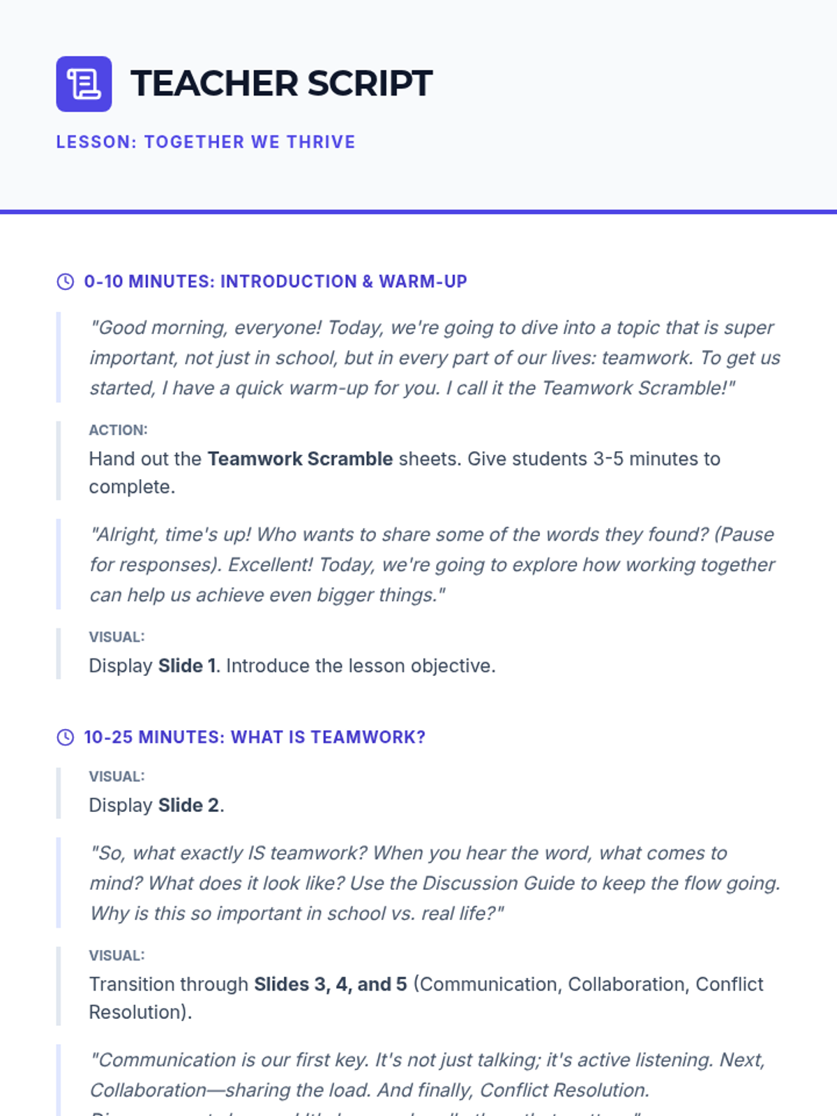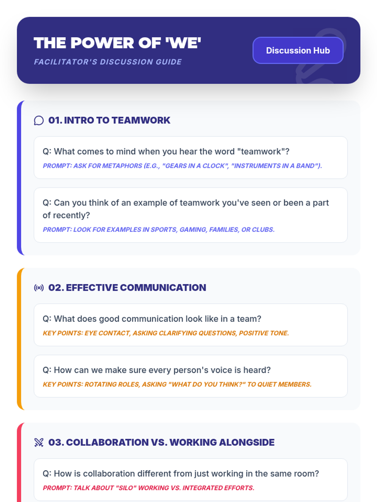 A 60-minute lesson for 9th graders exploring the power of teamwork through interactive discussion, a hands-on Marshmallow Tower challenge, and individual reflection. Students develop practical skills in communication, collaboration, and conflict resolution.