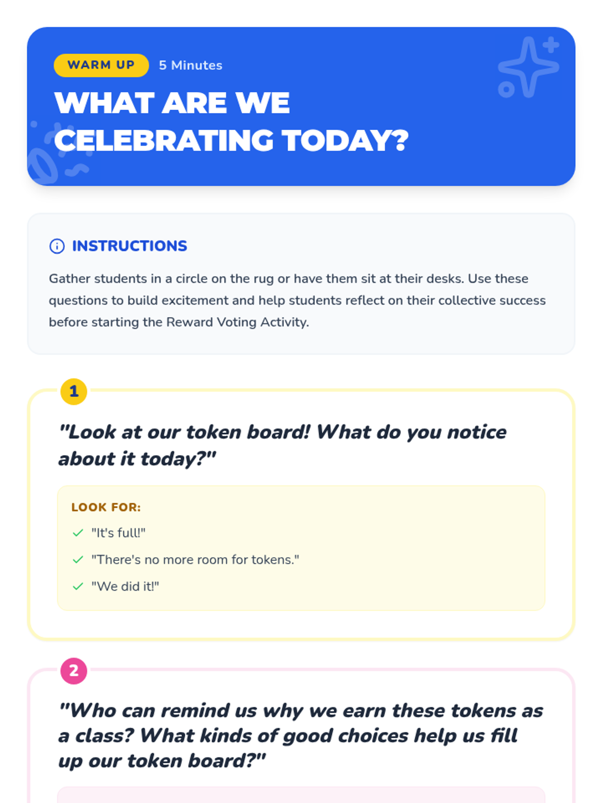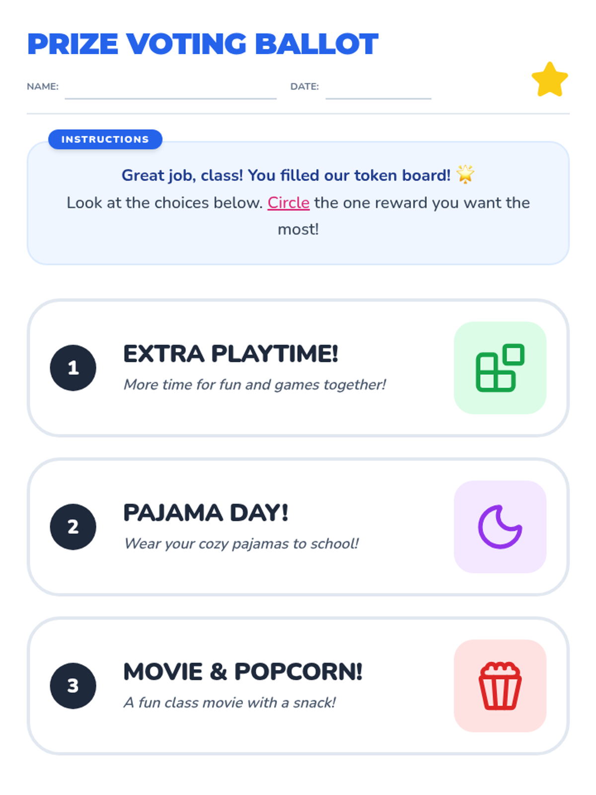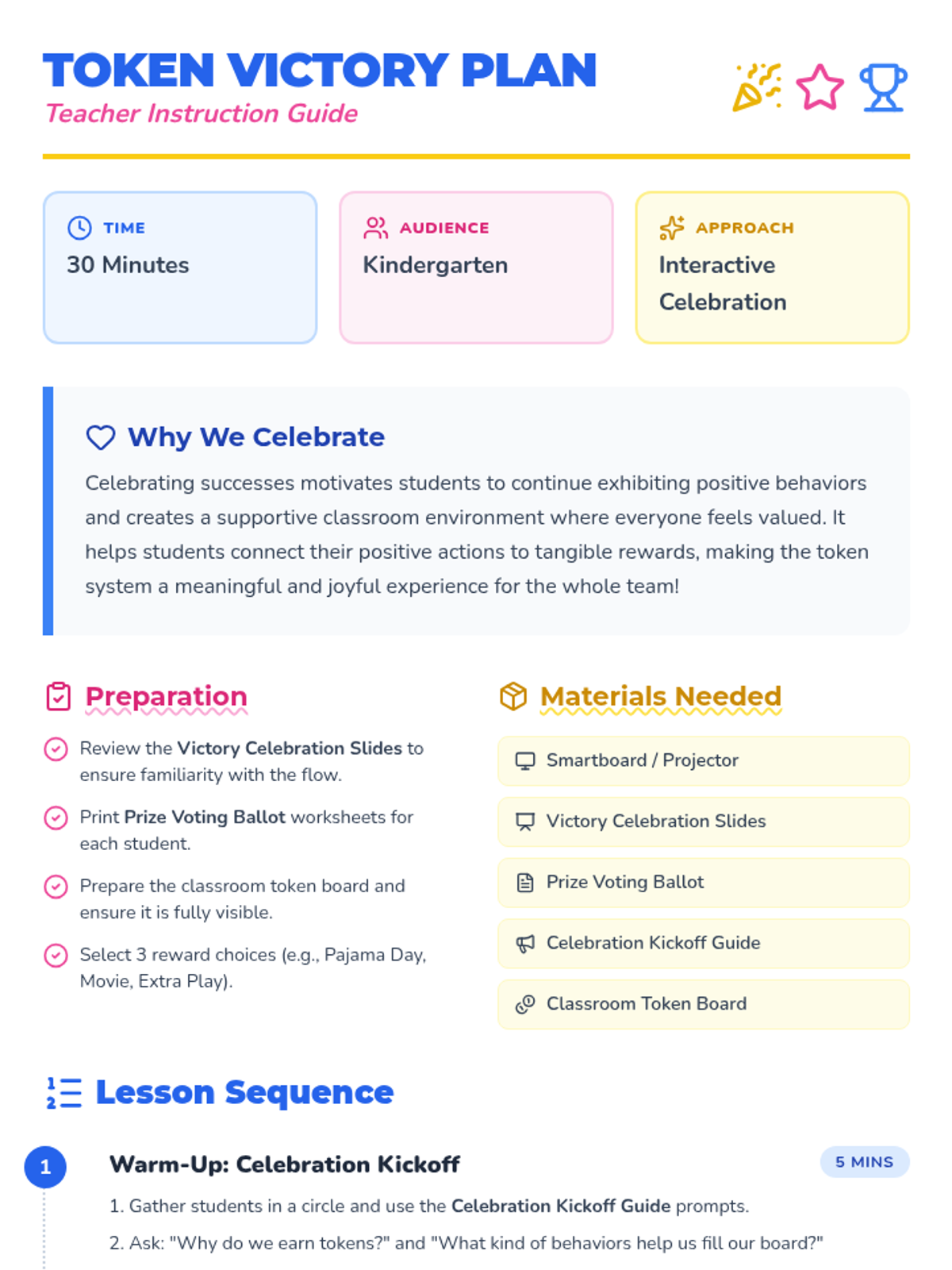 A fun and engaging lesson for Kindergarten students to celebrate their collective achievements through the classroom token system, featuring a collaborative voting activity for their earned reward.