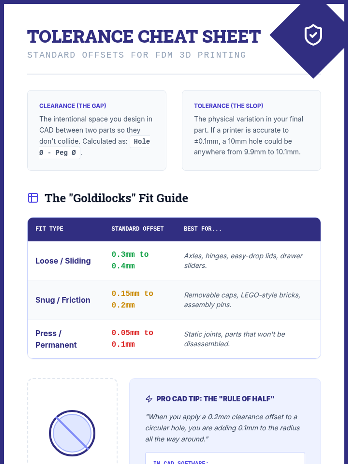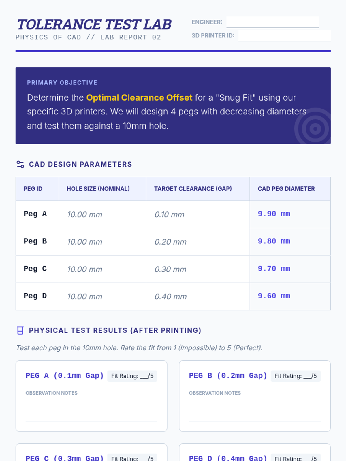 Exploration of tolerance and clearance through the design of a test block, teaching students how to account for manufacturing gaps in digital designs.