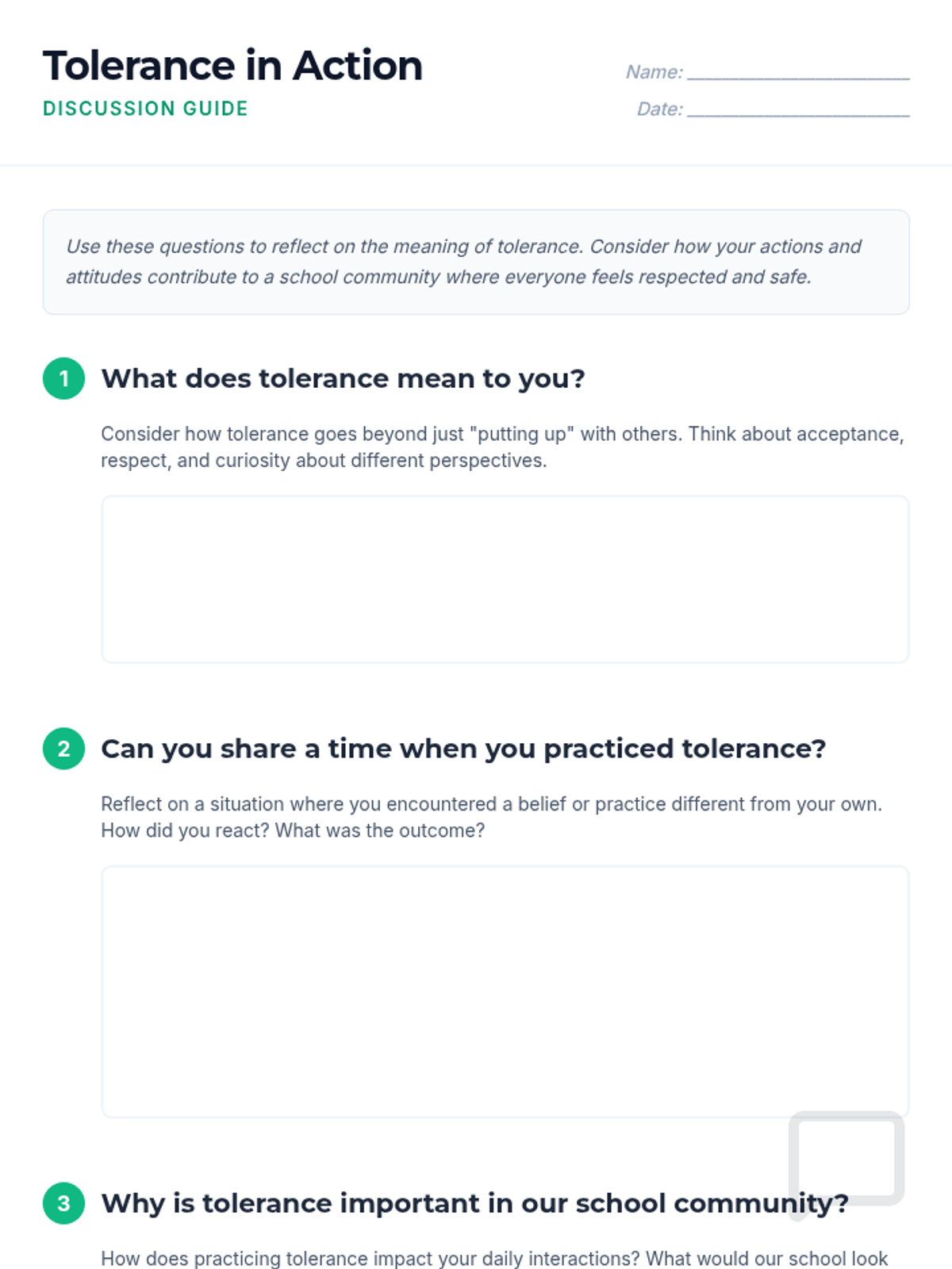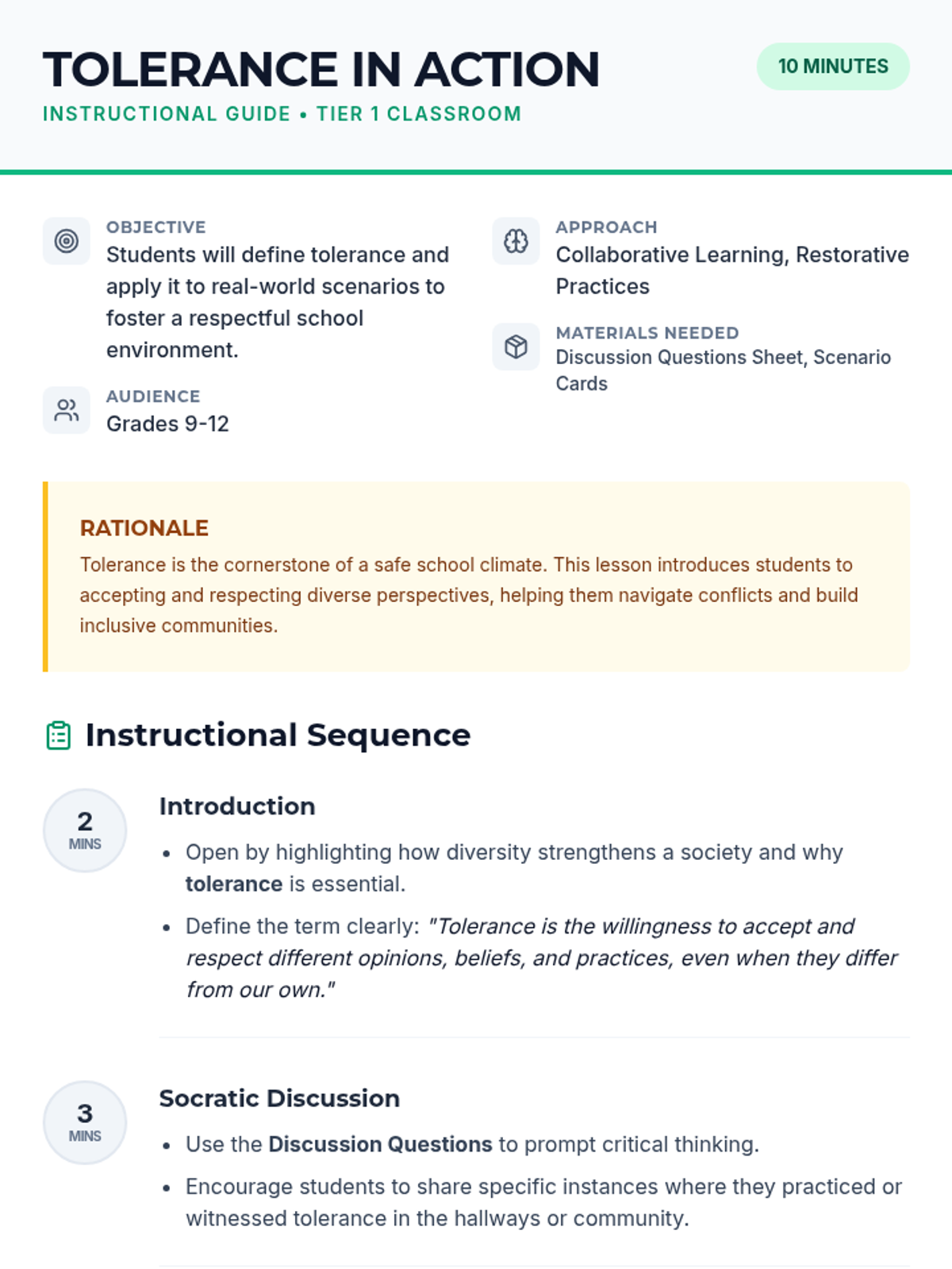 A concise 10-minute lesson for high school students to explore tolerance through dialogue and collaborative scenario-based problem solving.