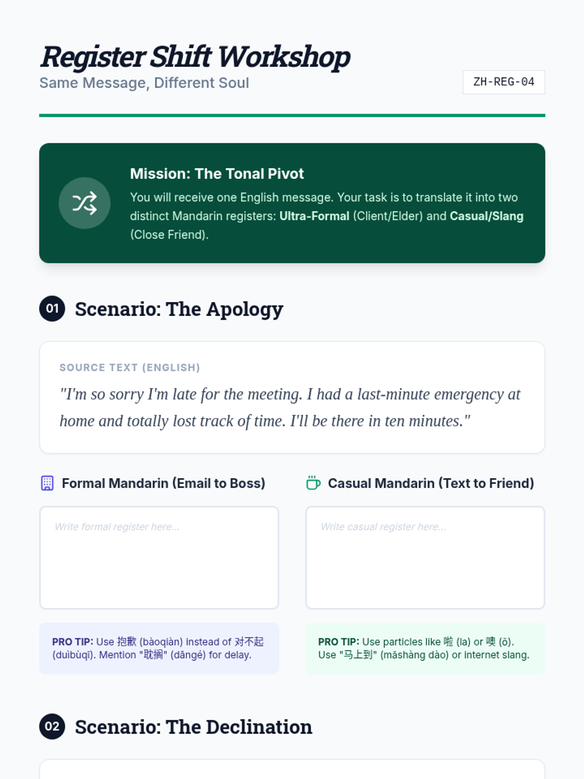 This lesson focuses on maintaining the formality of the original text. Students translate messages across different registers to observe how vocabulary choices shift between formal and casual contexts.