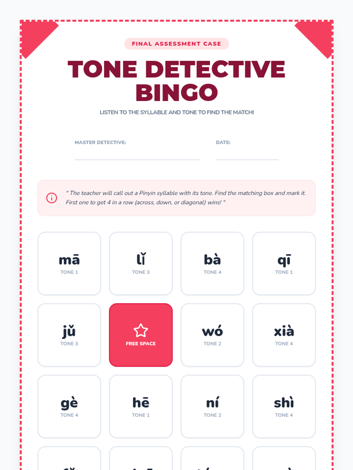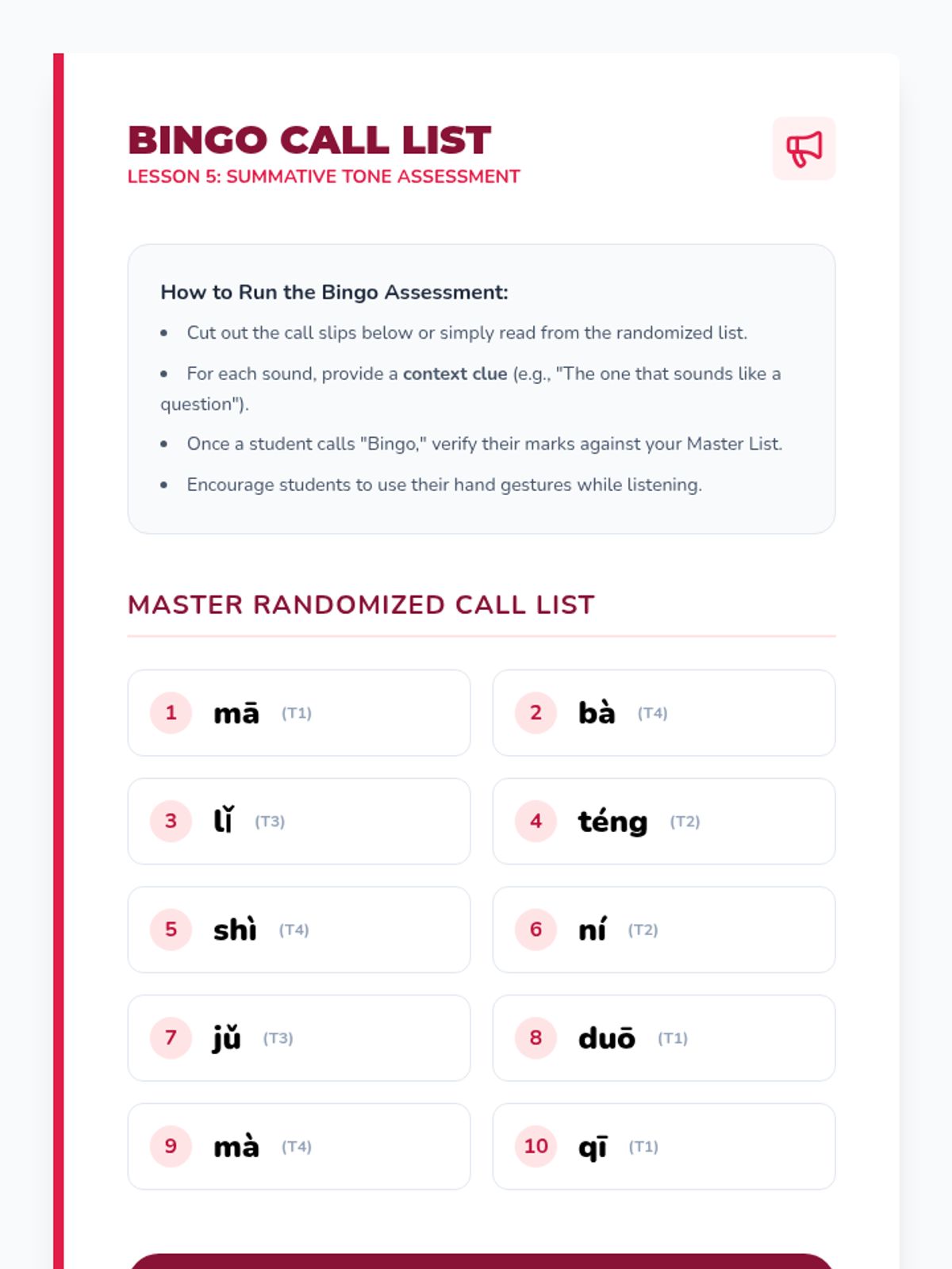 A gamified assessment where students identify syllables and tones to fill a Bingo board, serving as a summative check for auditory accuracy.