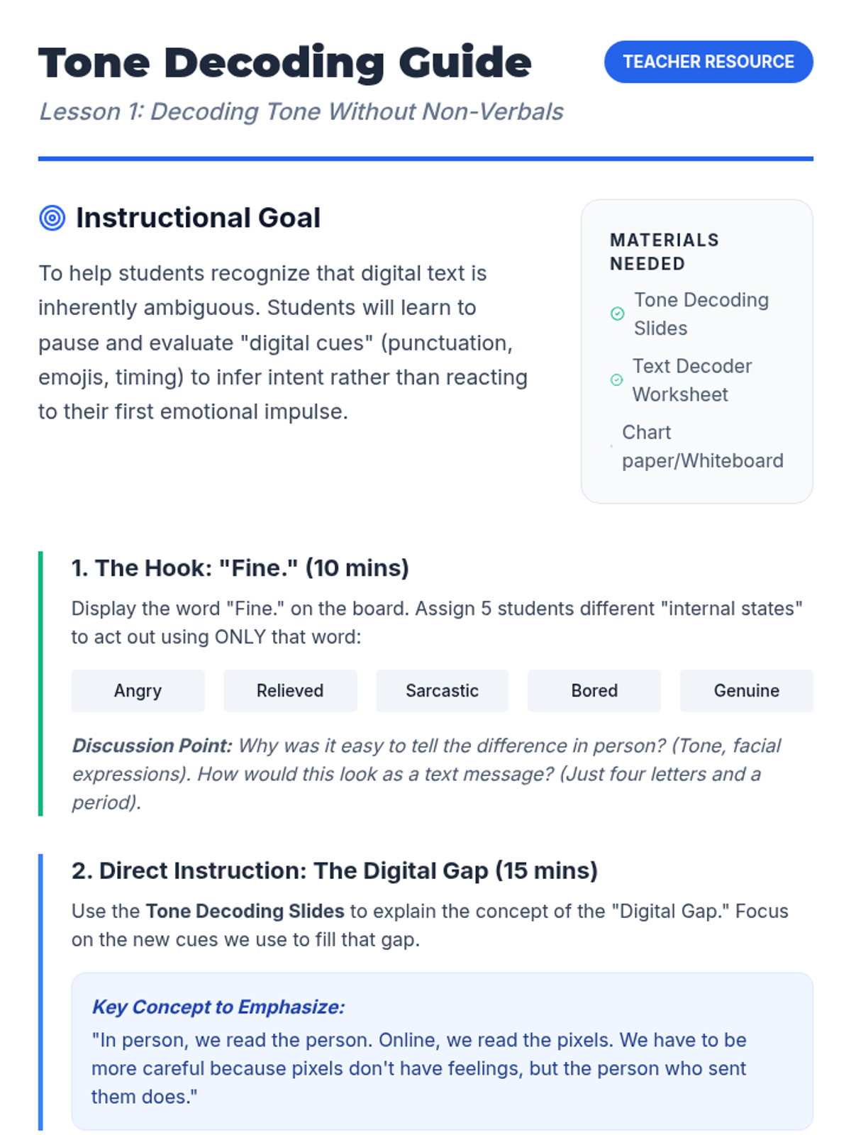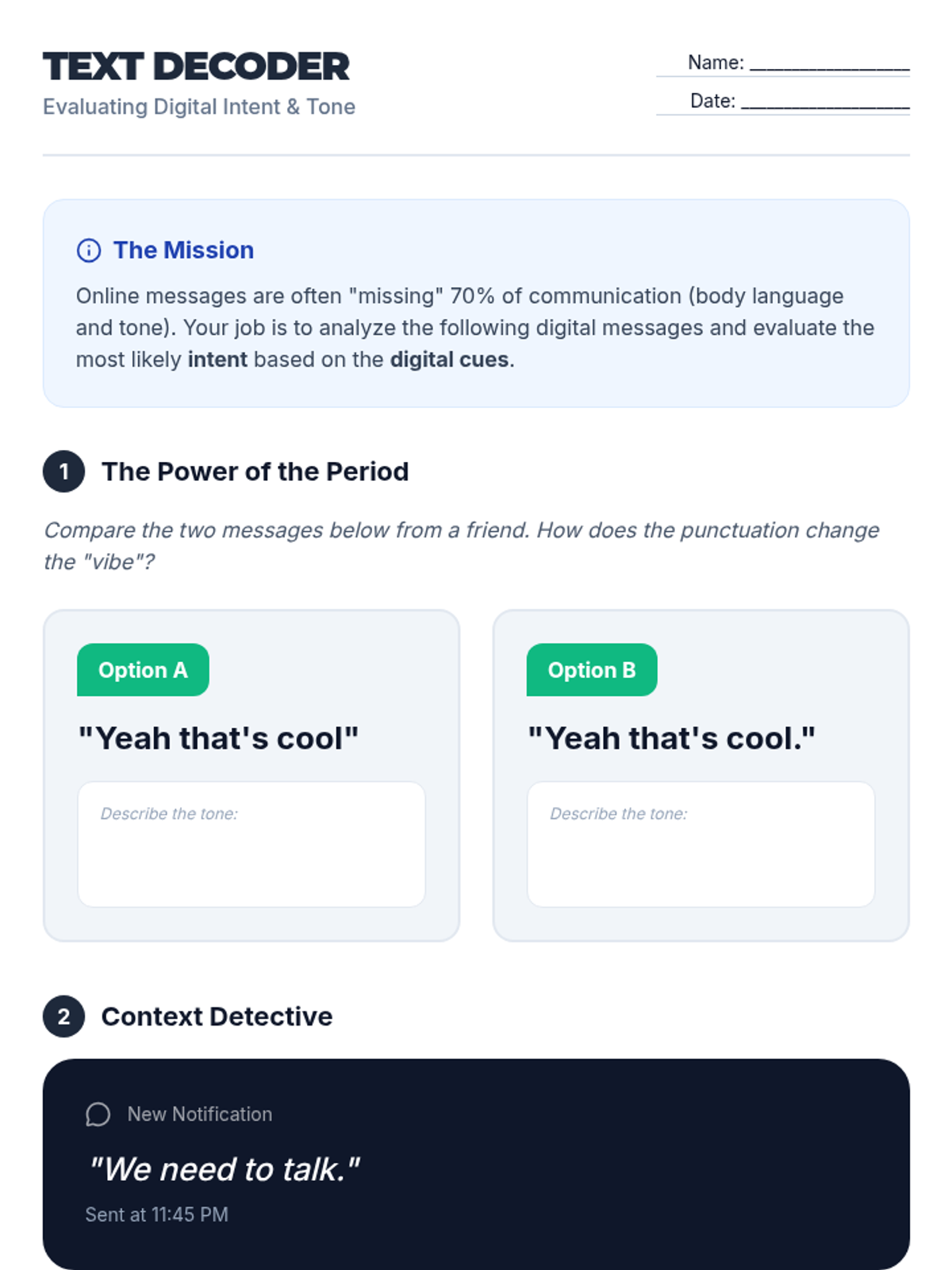 Students explore how the lack of physical cues in digital text leads to misunderstandings and practice decoding intent through context.