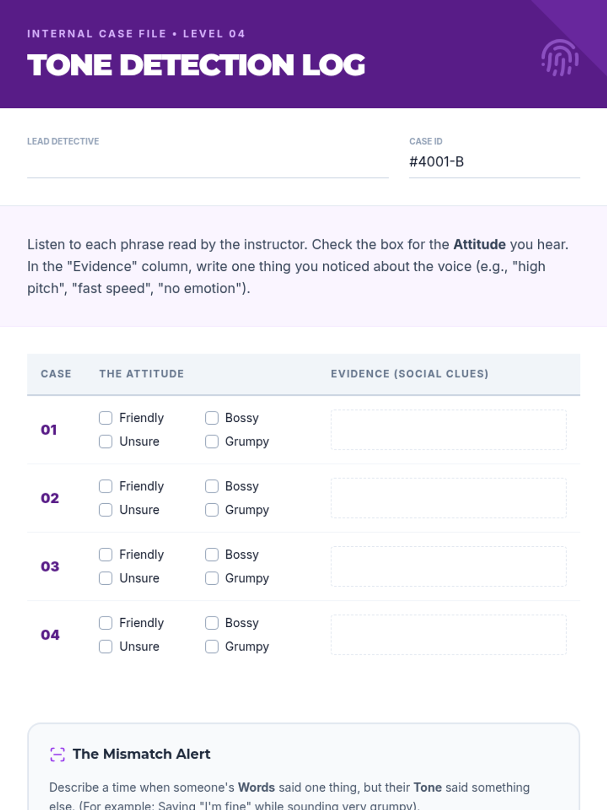 A listening-focused game where students identify social tones and the attitudes behind ambiguous phrases.