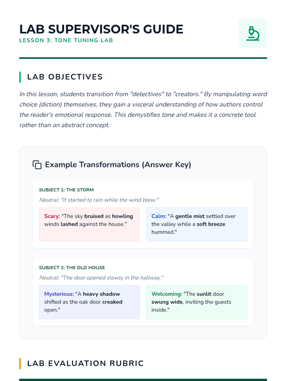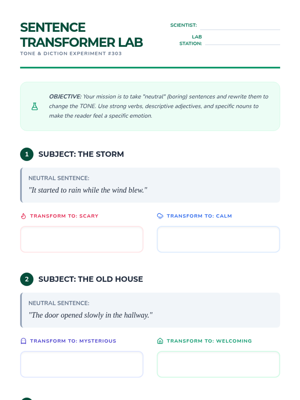In this simulation-based activity, students experiment with word choice to modulate tone and voice. They practice rewriting neutral sentences to evoke specific emotions in the reader.