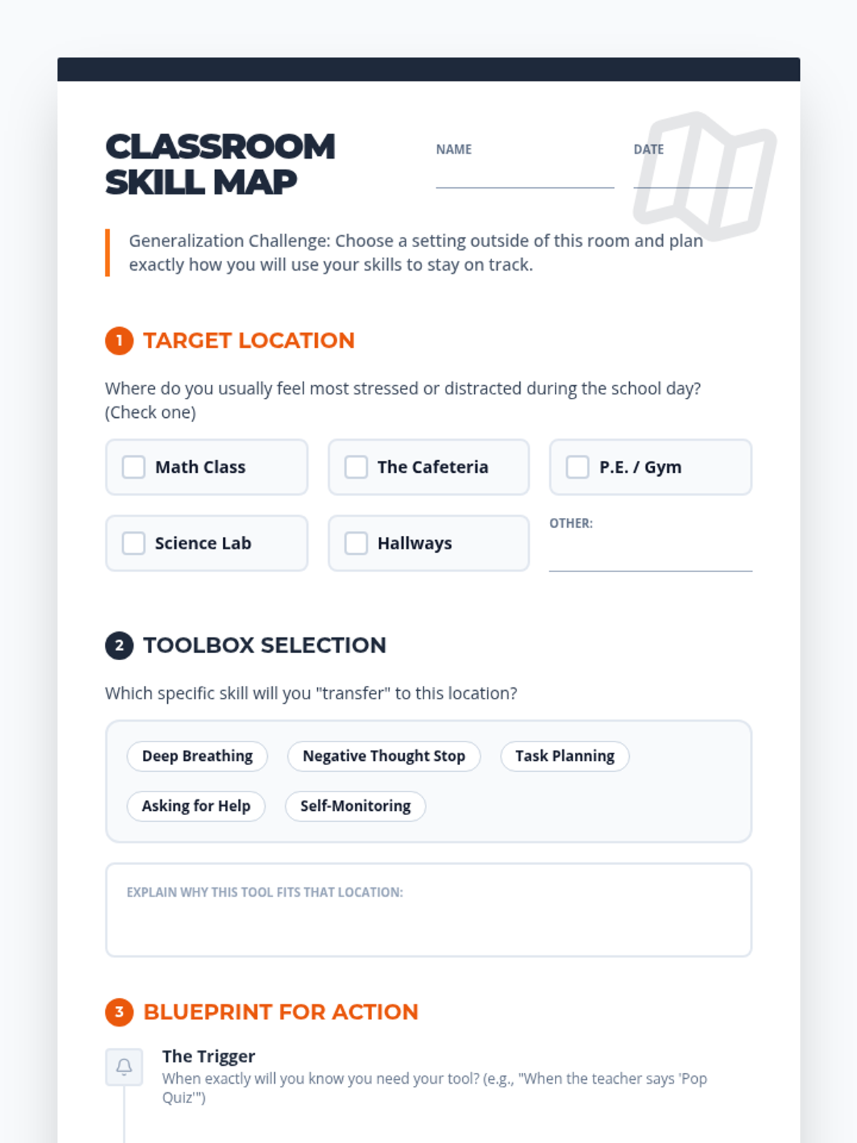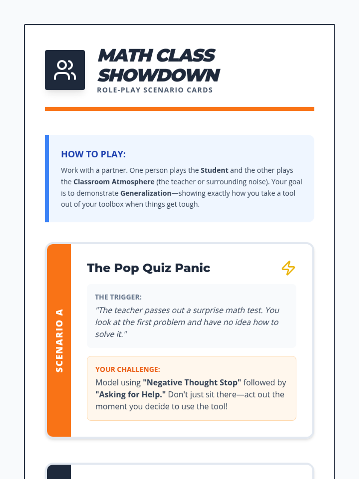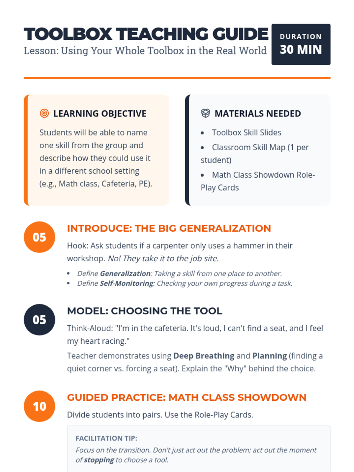 A 30-minute lesson focused on generalizing and transferring social-emotional skills and coping strategies to various school environments, such as math class or the cafeteria. Students will learn to plan and self-monitor their skill usage across different contexts.
