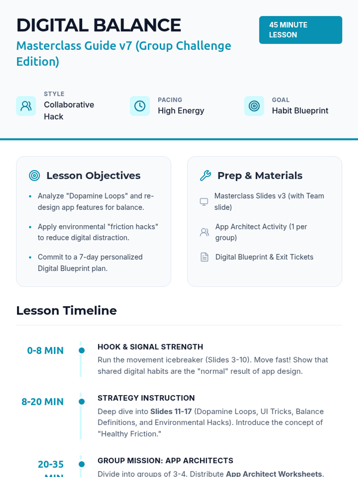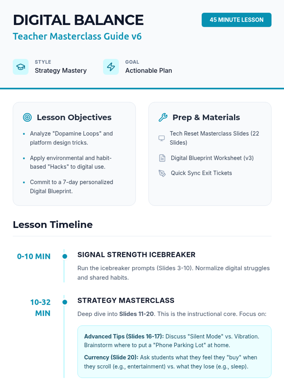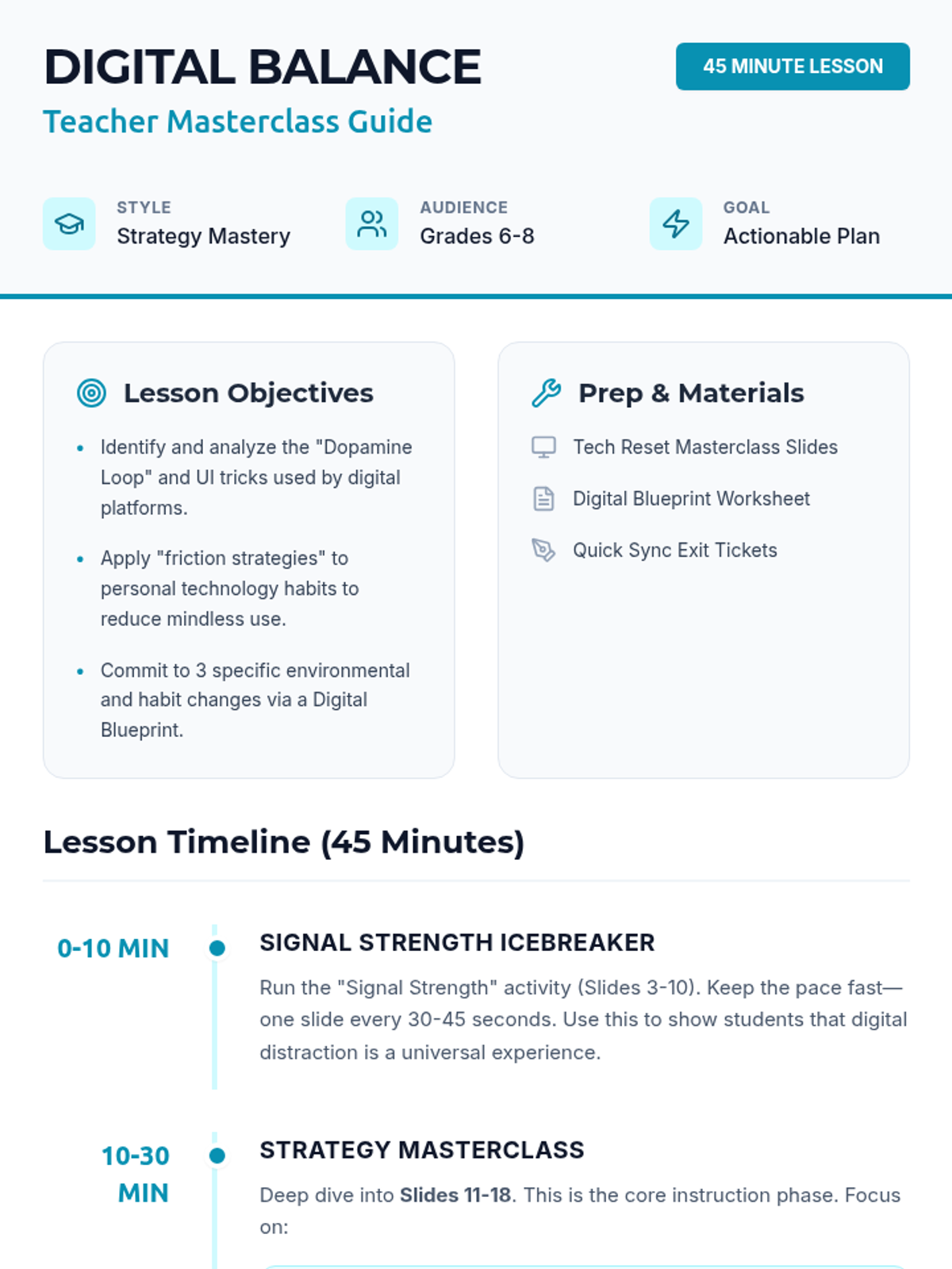 A 45-minute lesson designed for middle schoolers to reflect on their screen time, understand the impact of technology on their well-being, and create a personal plan for digital balance.