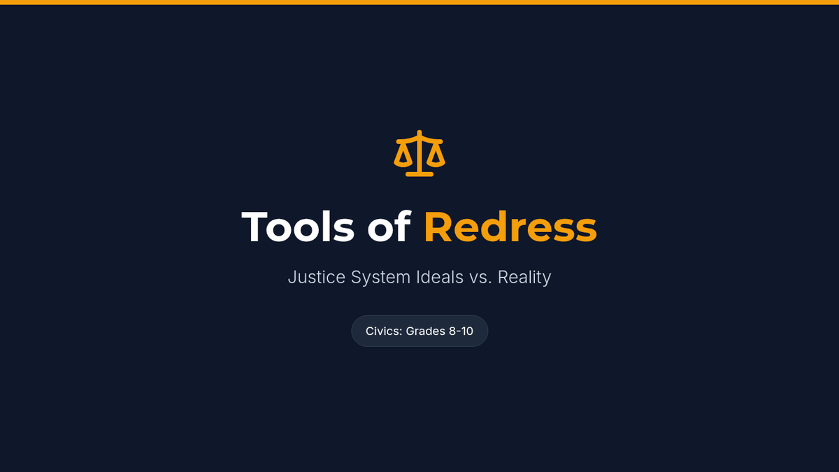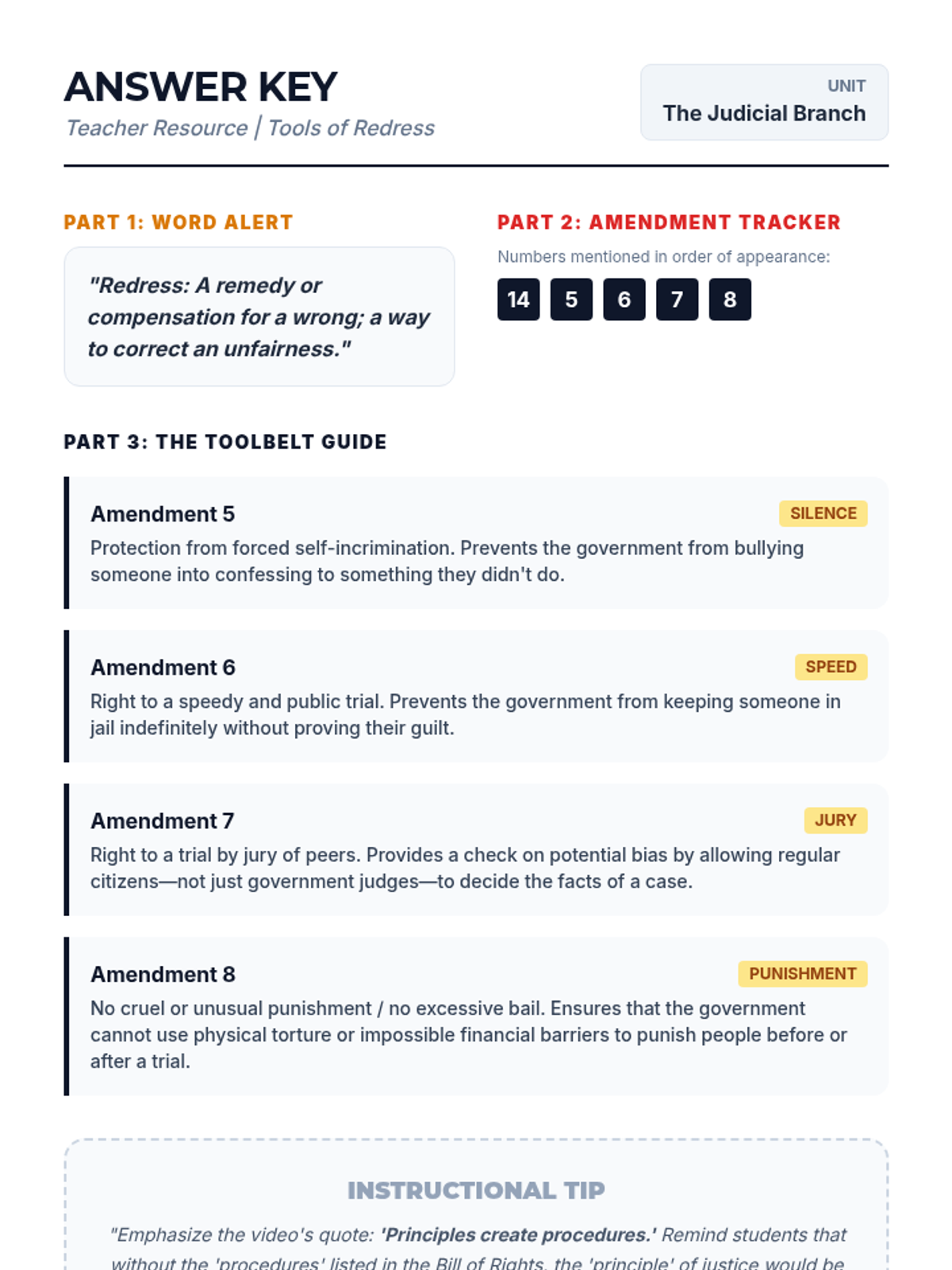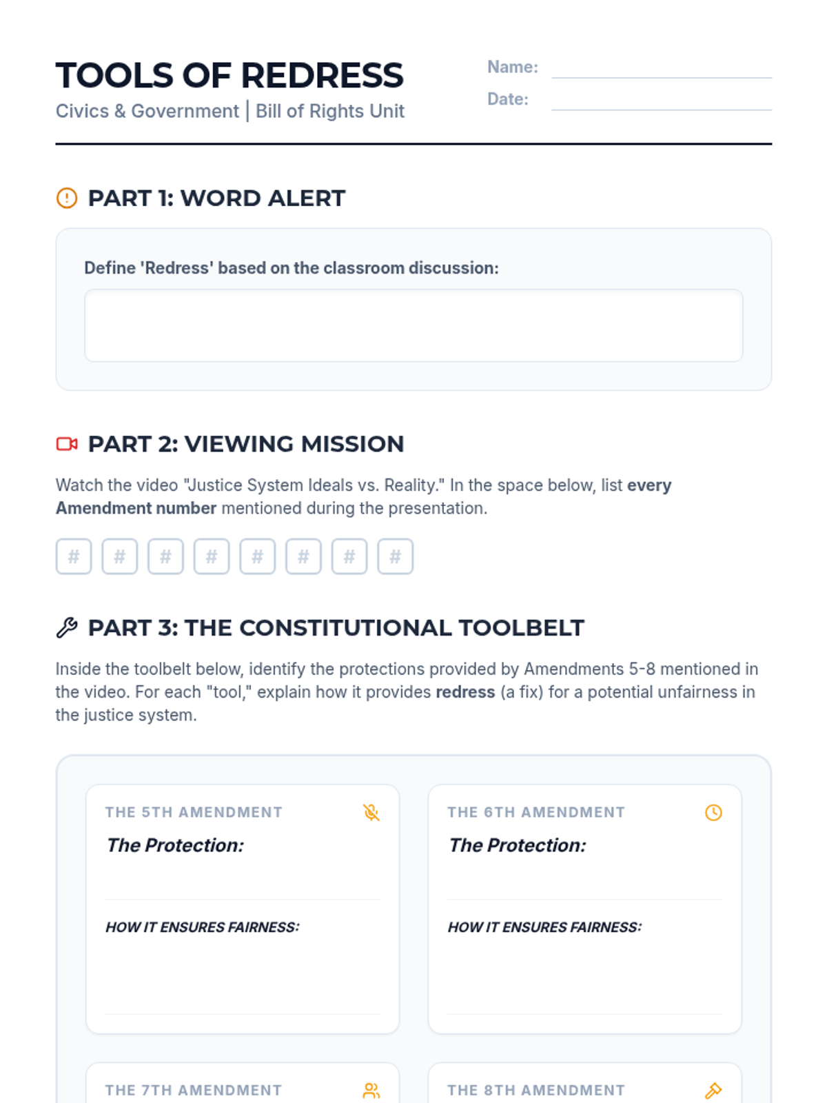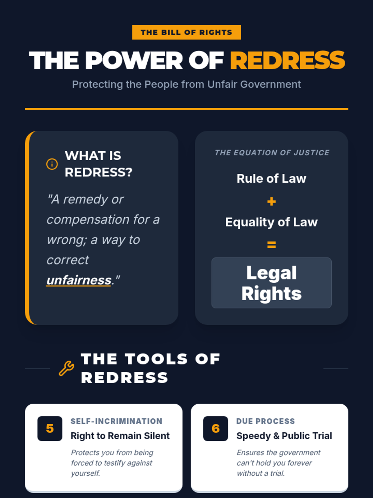 A Civics lesson for grades 8-10 focused on the concept of 'Redress' and the procedural protections of the 5th-8th Amendments. Students explore how constitutional principles translate into specific legal procedures to protect citizens from unfair government action.