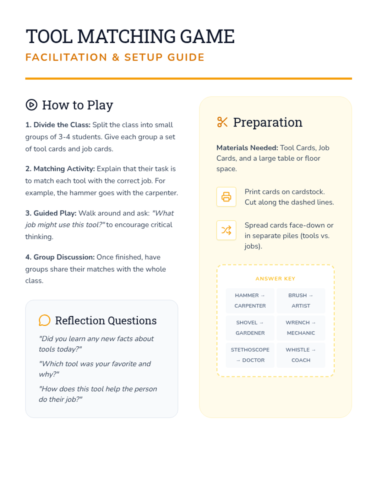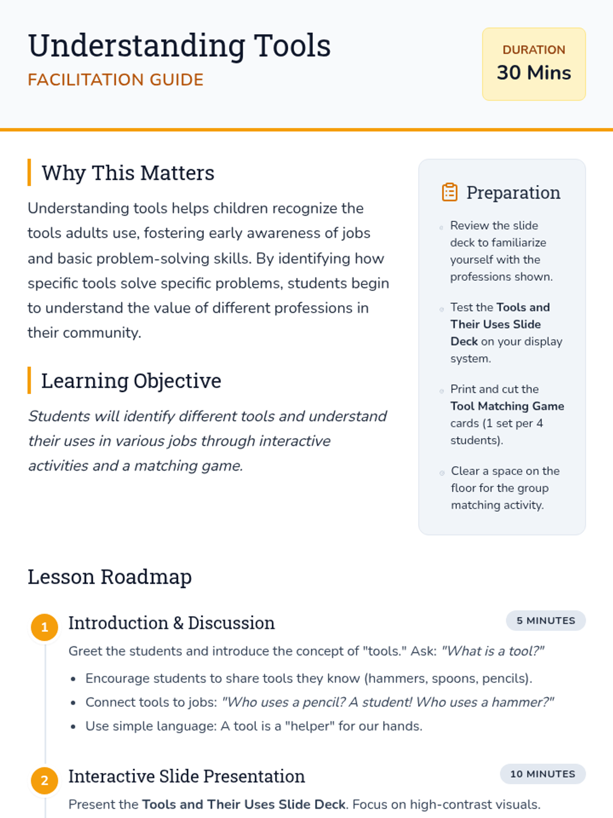 Introduce kindergarten students to the concept of tools and how they are used in various jobs through interactive discussion and matching activities.