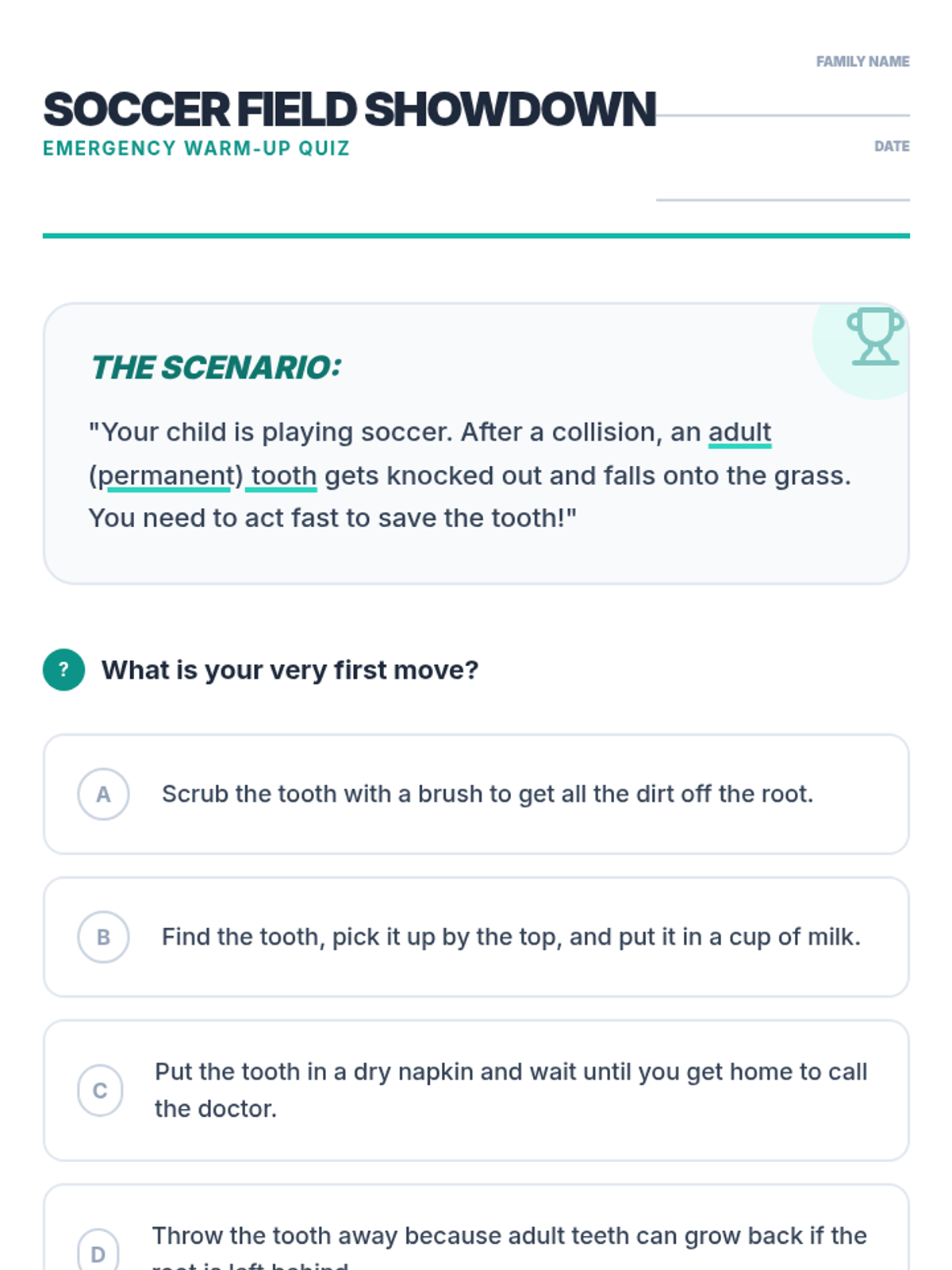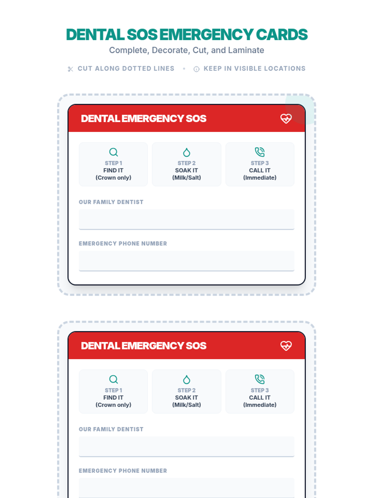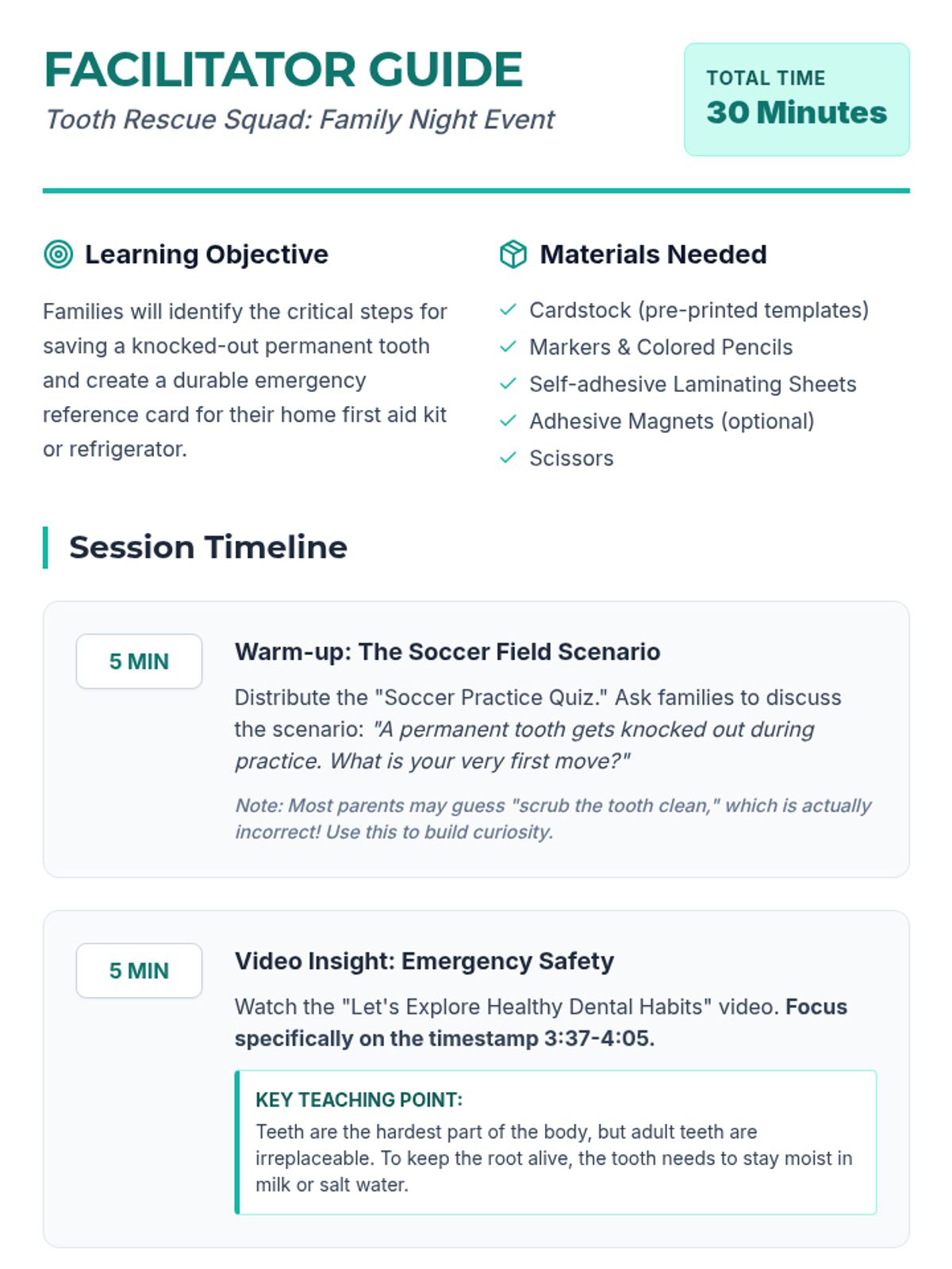 A 30-minute interactive family night session where families learn how to handle dental emergencies and create a 'Dental SOS' reference card for their home.