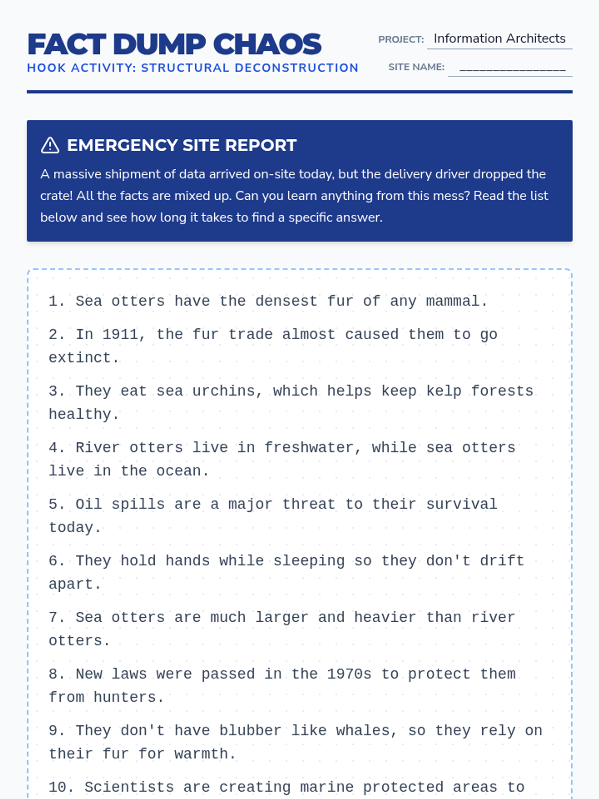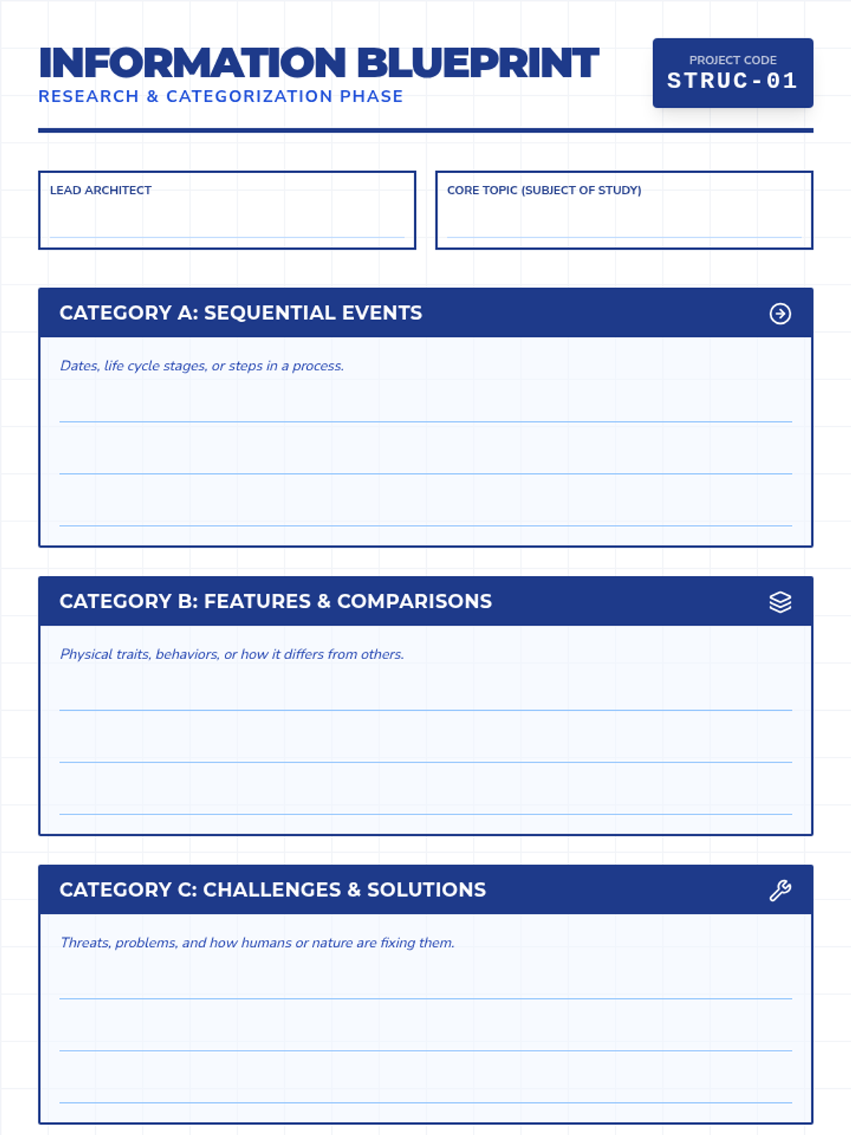 Students select a research topic and gather raw facts, categorizing them into 'events', 'features', and 'issues' to prepare for multi-structural writing.