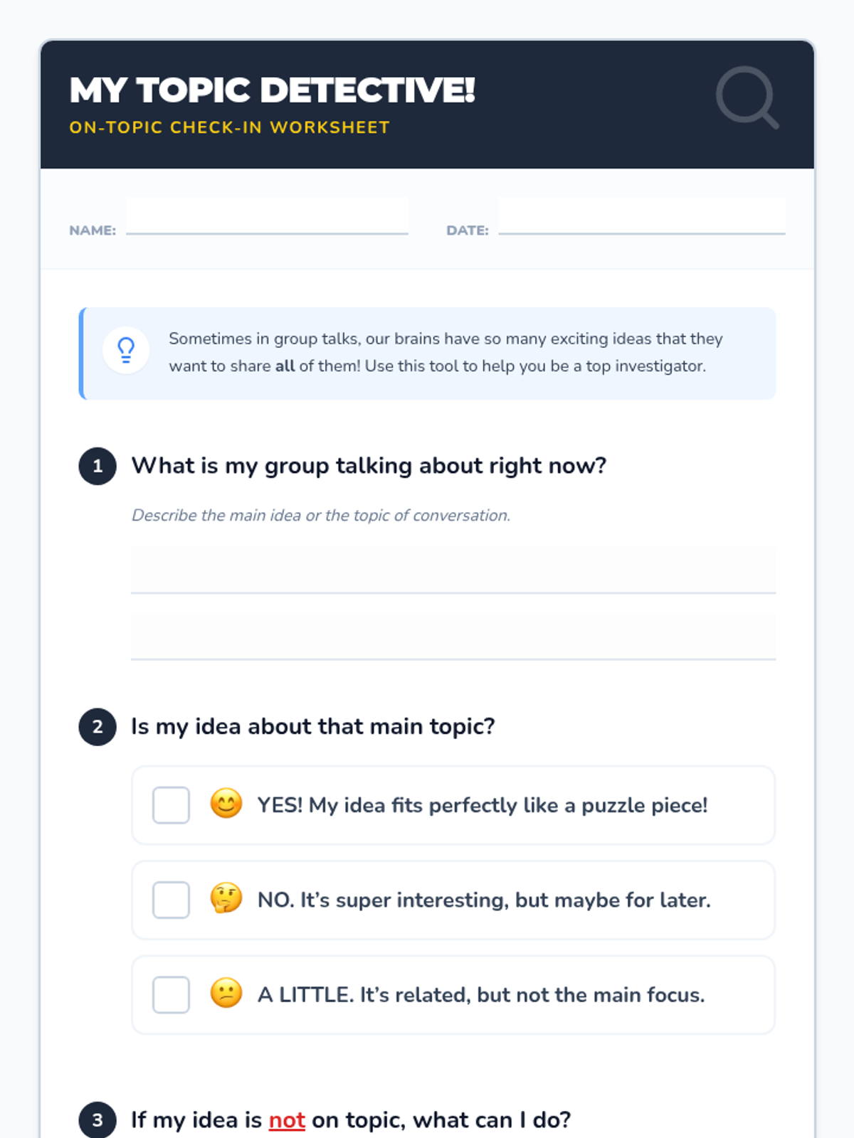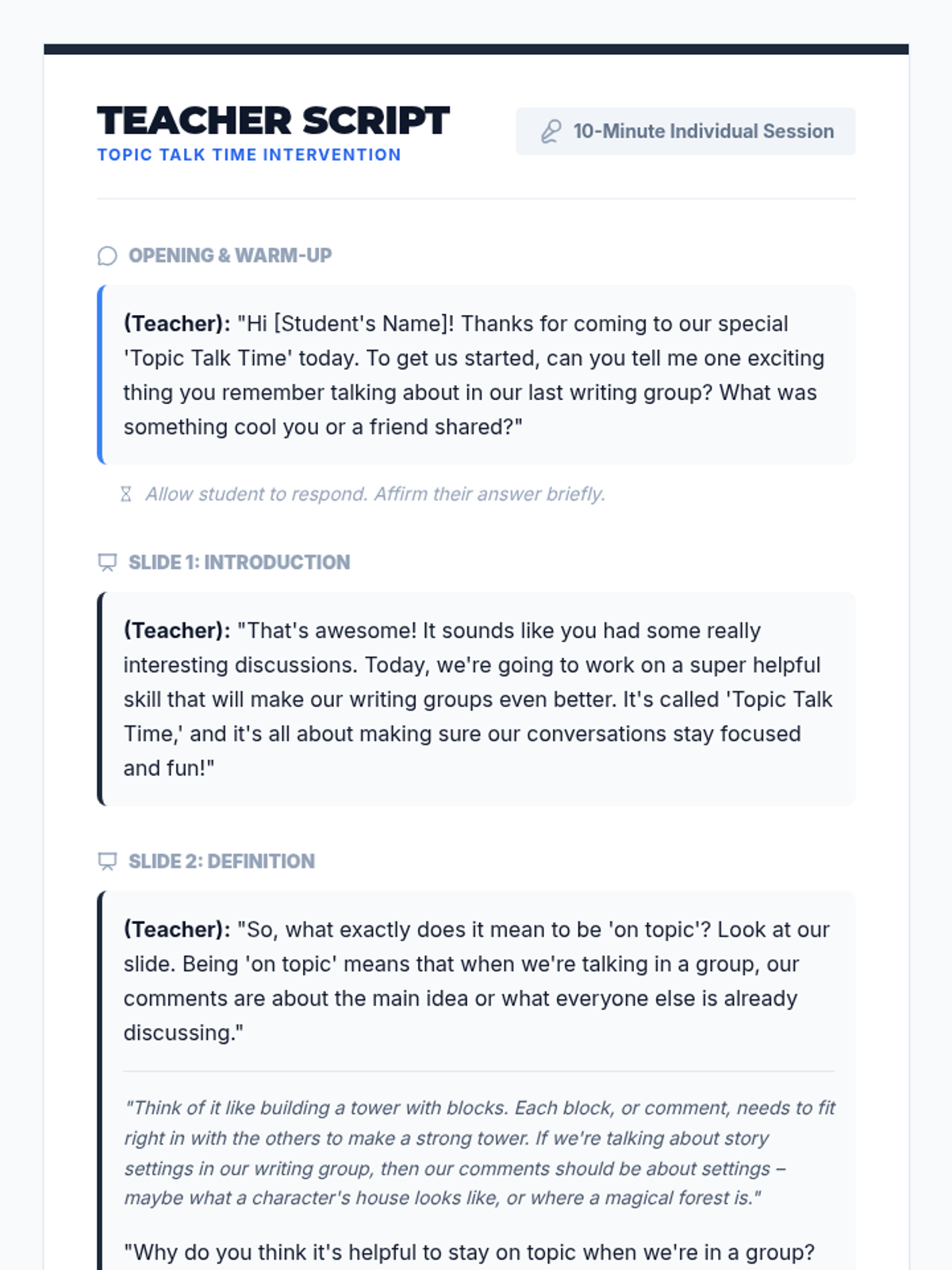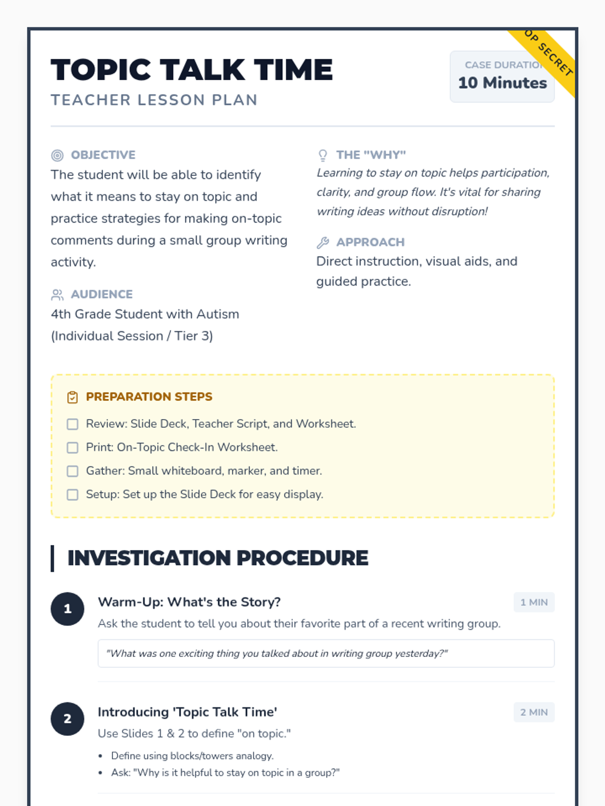 A 10-minute Tier 3 individual lesson for 4th-grade students with autism focused on self-monitoring strategies to stay on topic during small group writing discussions.