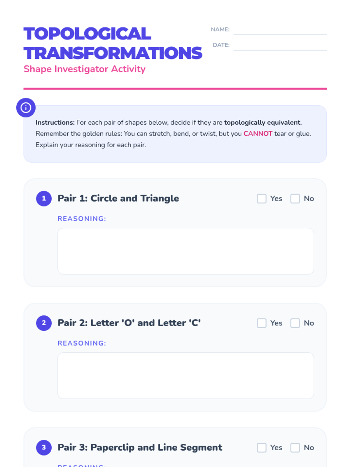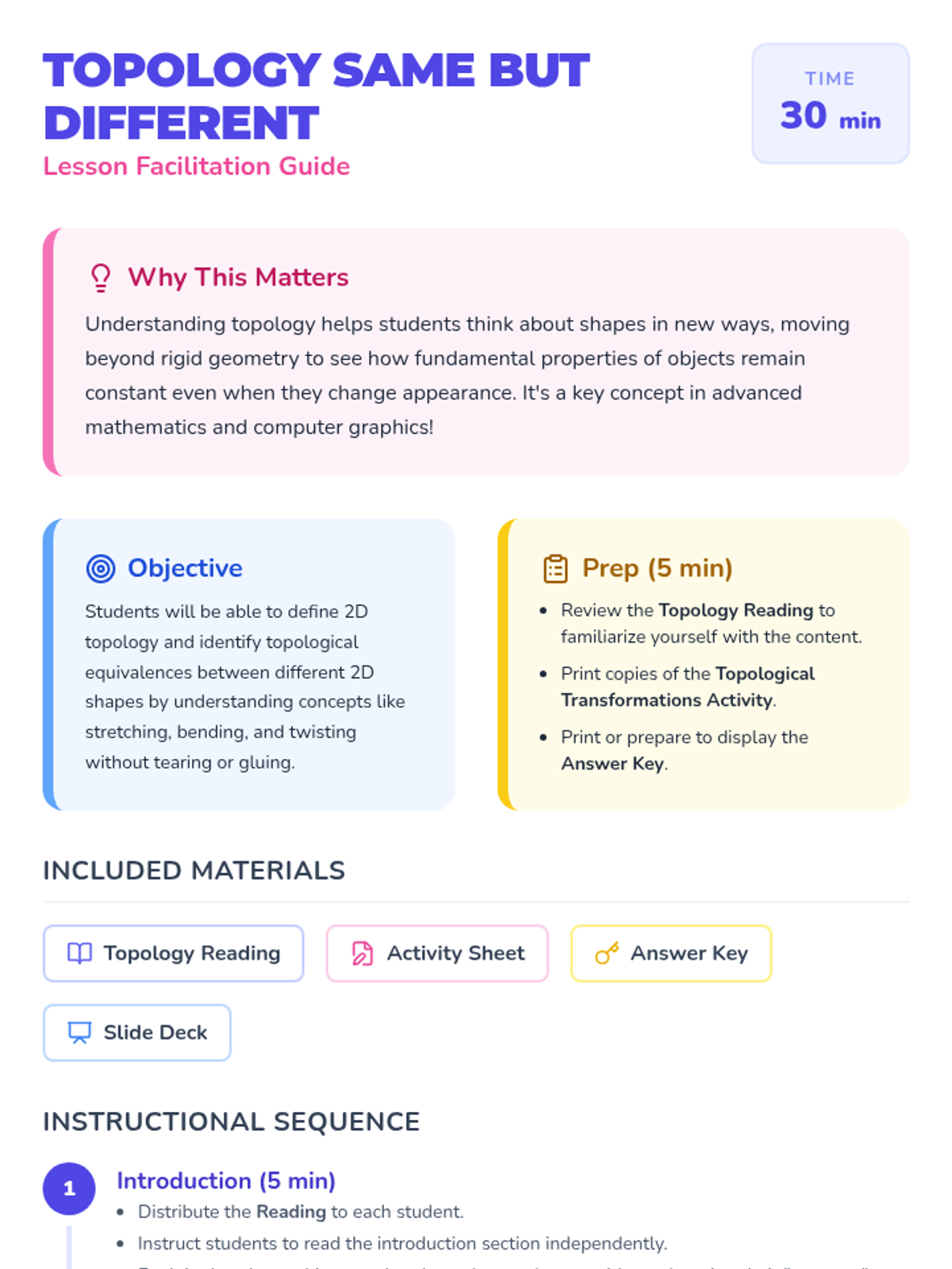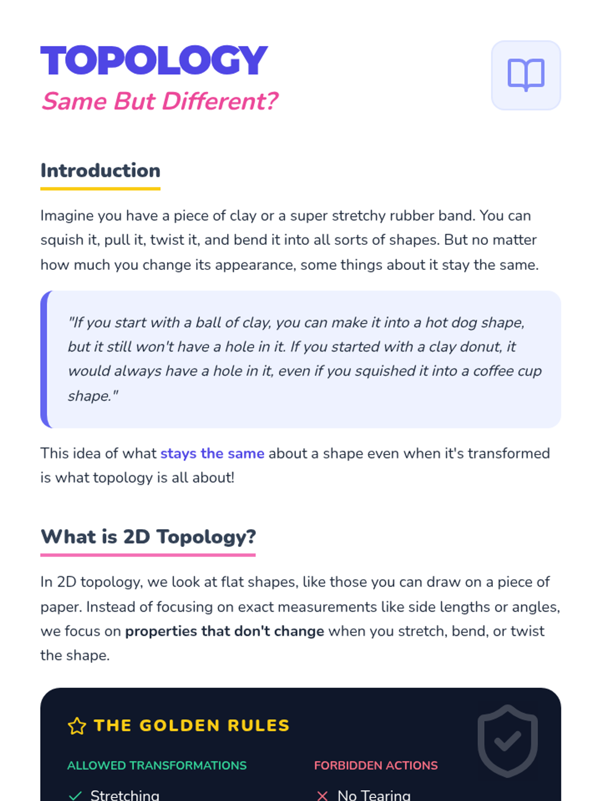 A mind-bending introduction to 2D topology for 7th graders, exploring how shapes can be stretched and twisted without tearing or gluing. Students learn the concept of topological equivalence through guided reading and a hands-on shape transformation activity.