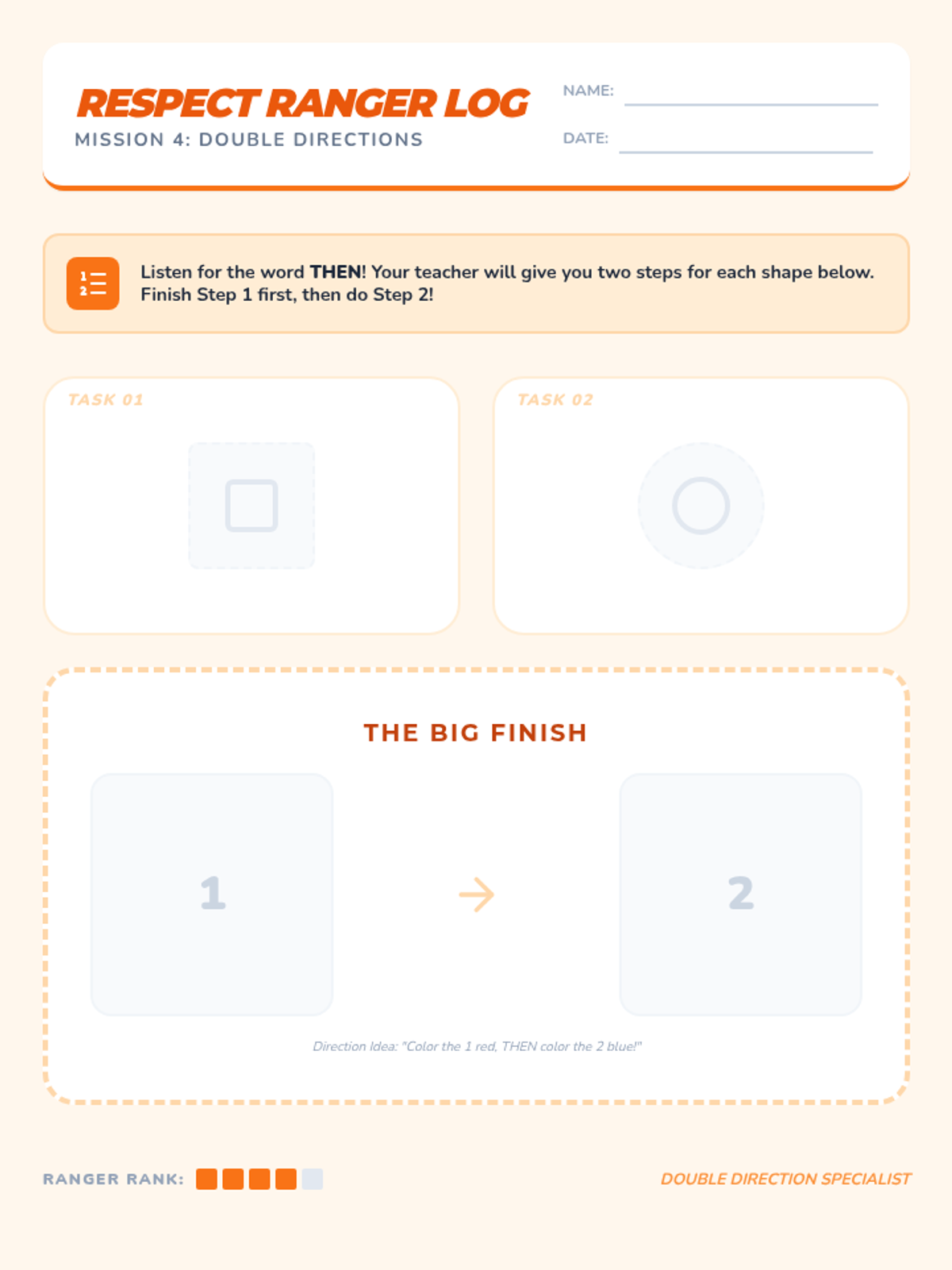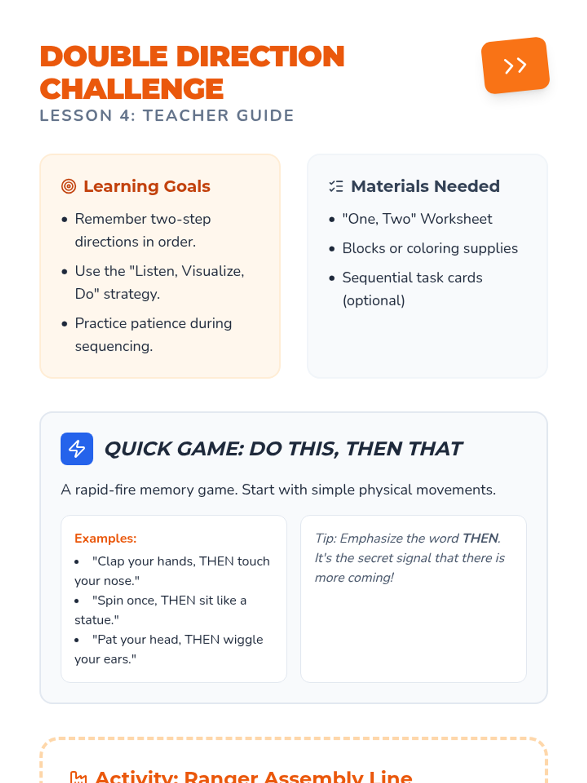 Challenges students to follow two-step directions in sequence. Activities focus on memory and patience while waiting for the full instruction before starting.