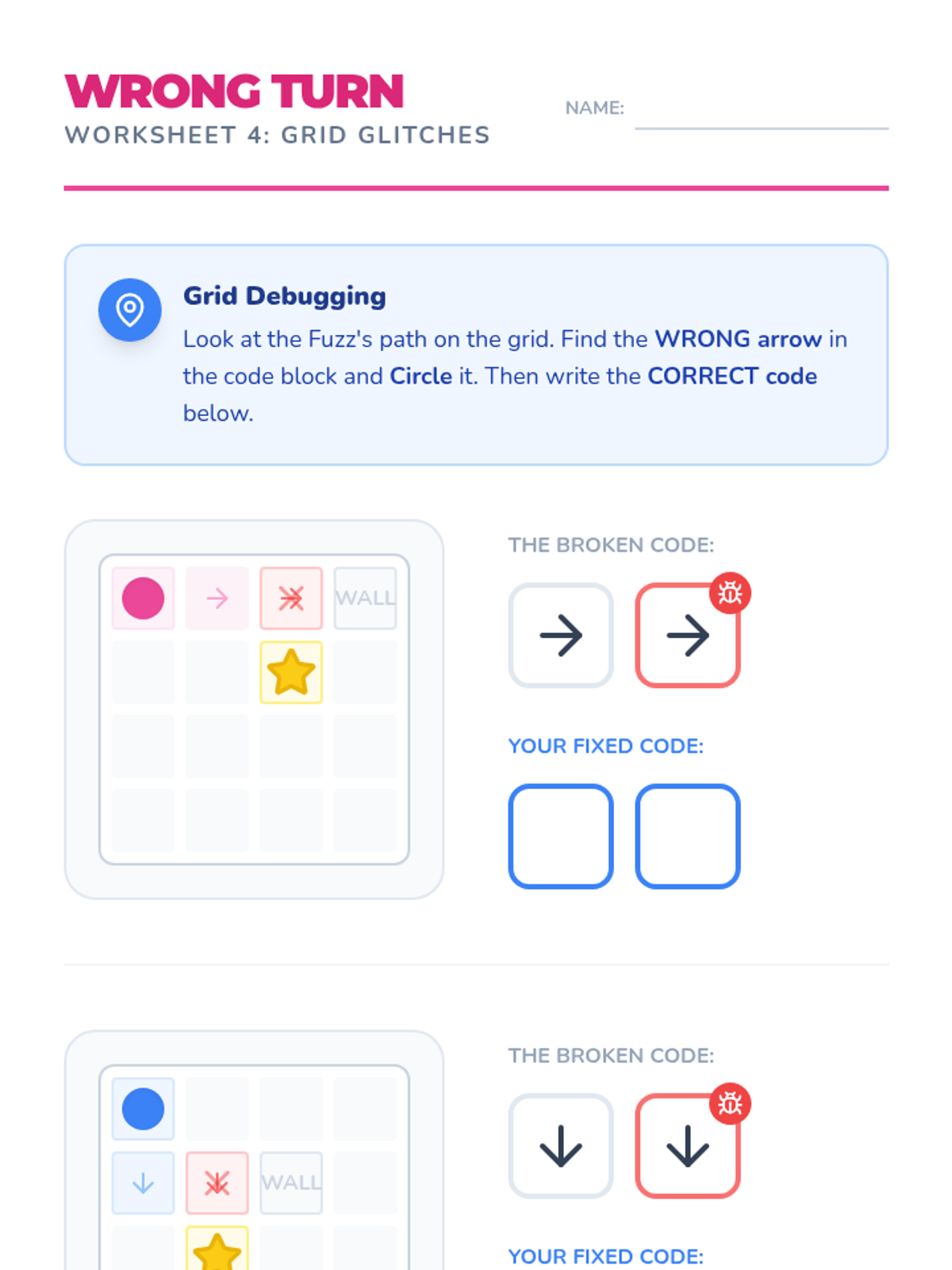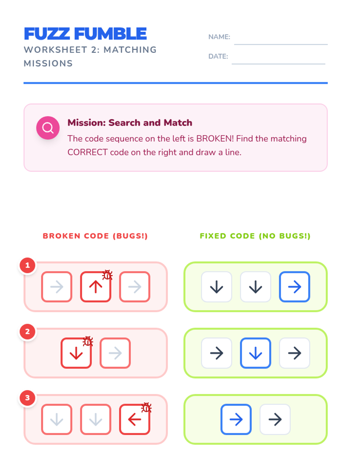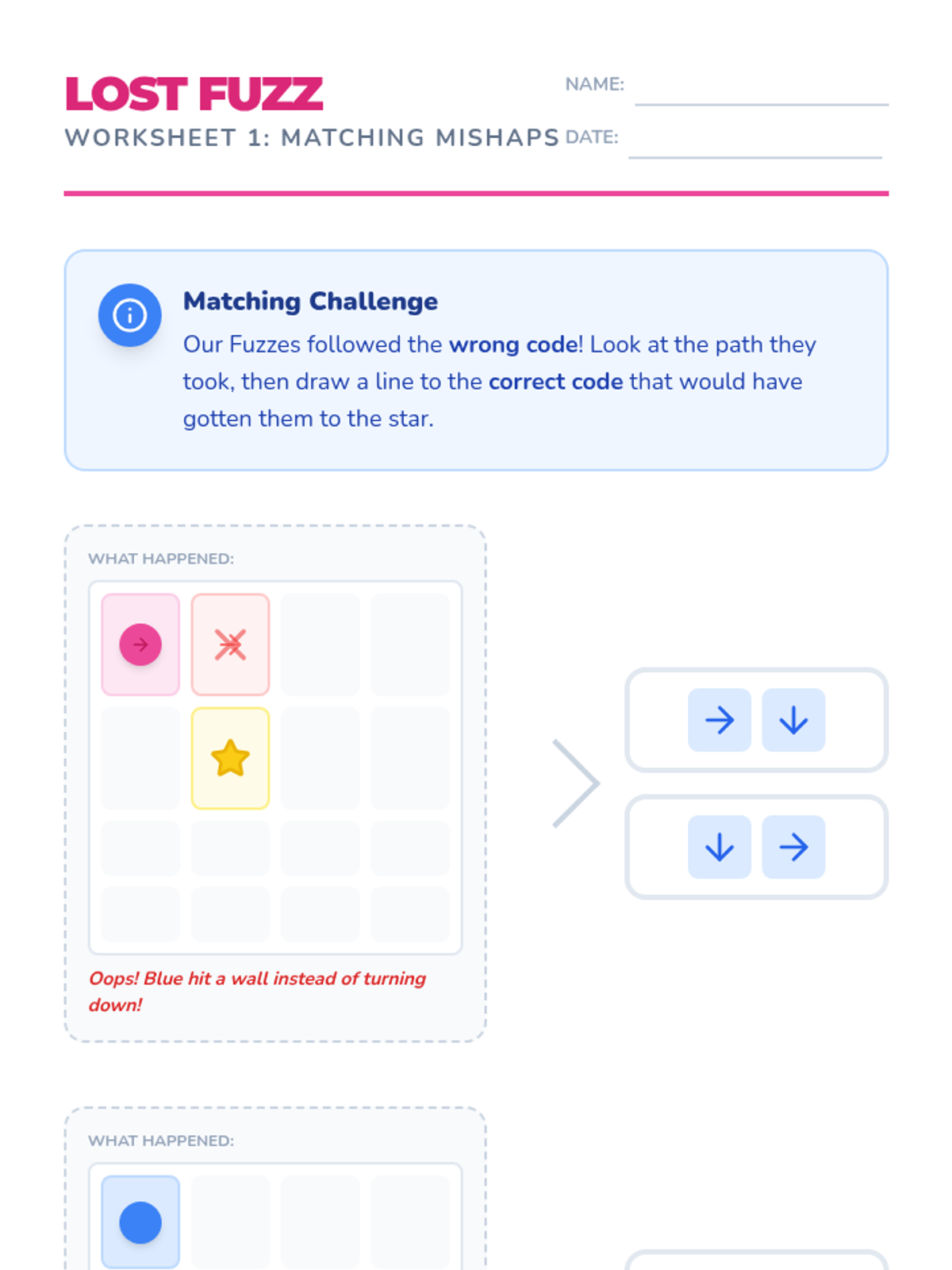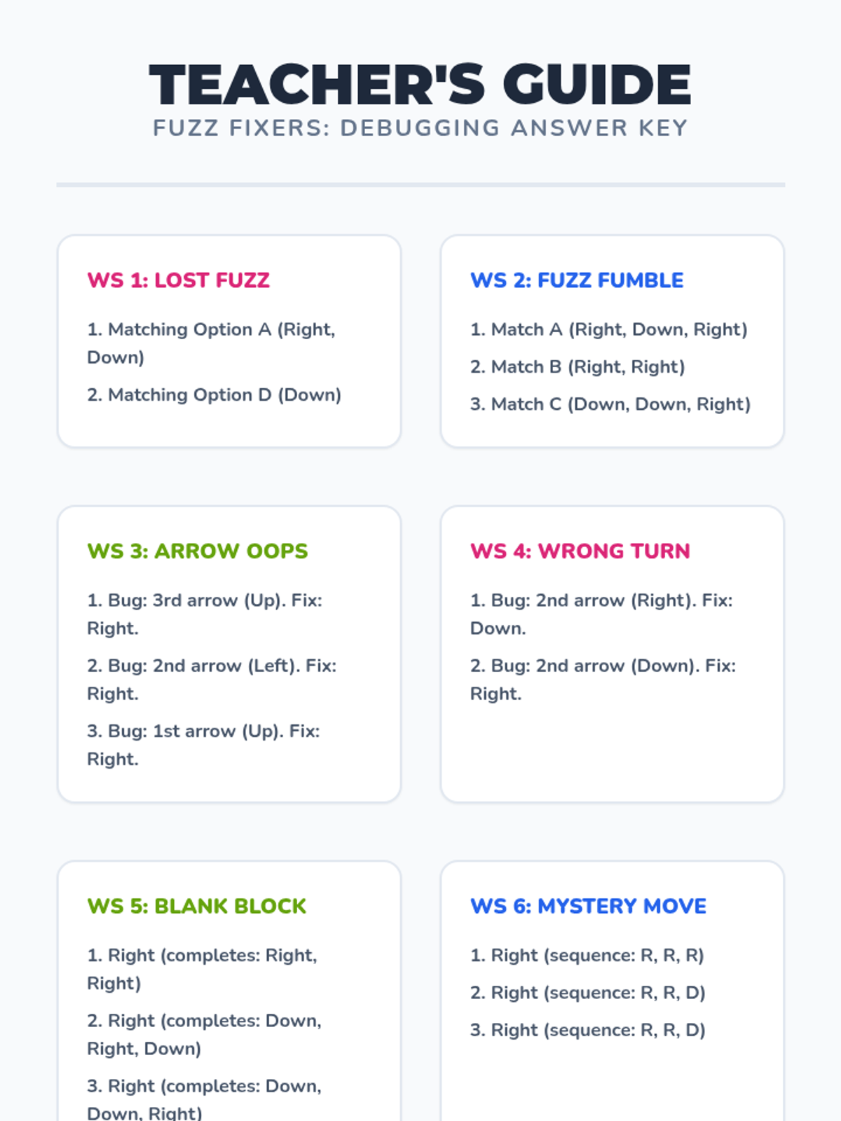 A comprehensive lesson introducing K-1st grade students to debugging through the lens of Kodable. Students identify, circle, and fix errors in directional code sequences to help their Fuzz friends navigate grids.