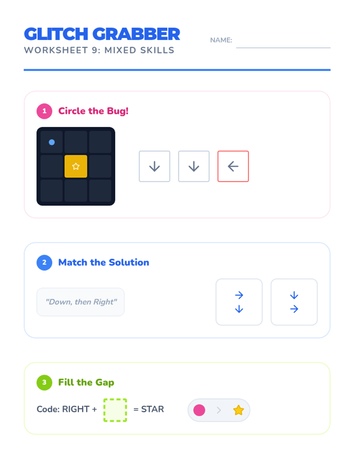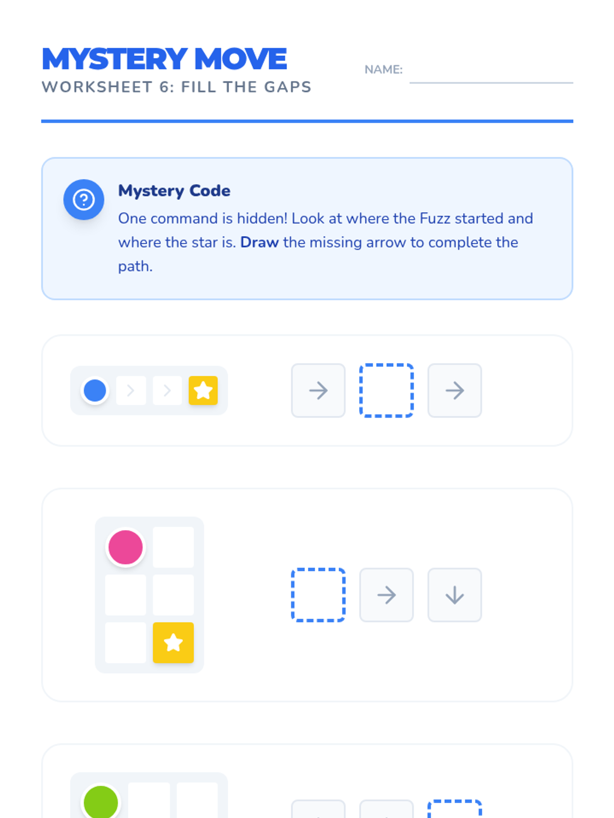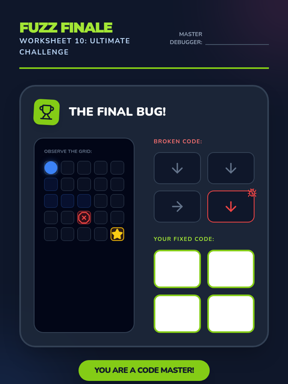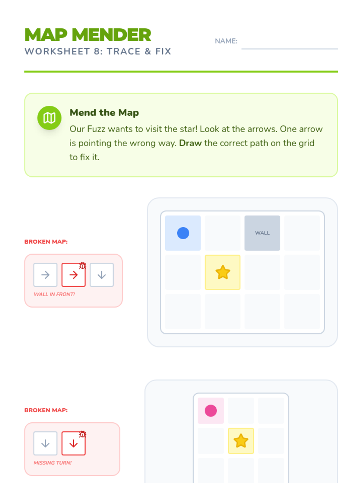 A comprehensive lesson introducing K-1st grade students to debugging through the lens of Kodable. Students identify, circle, and fix errors in directional code sequences to help their Fuzz friends navigate grids.