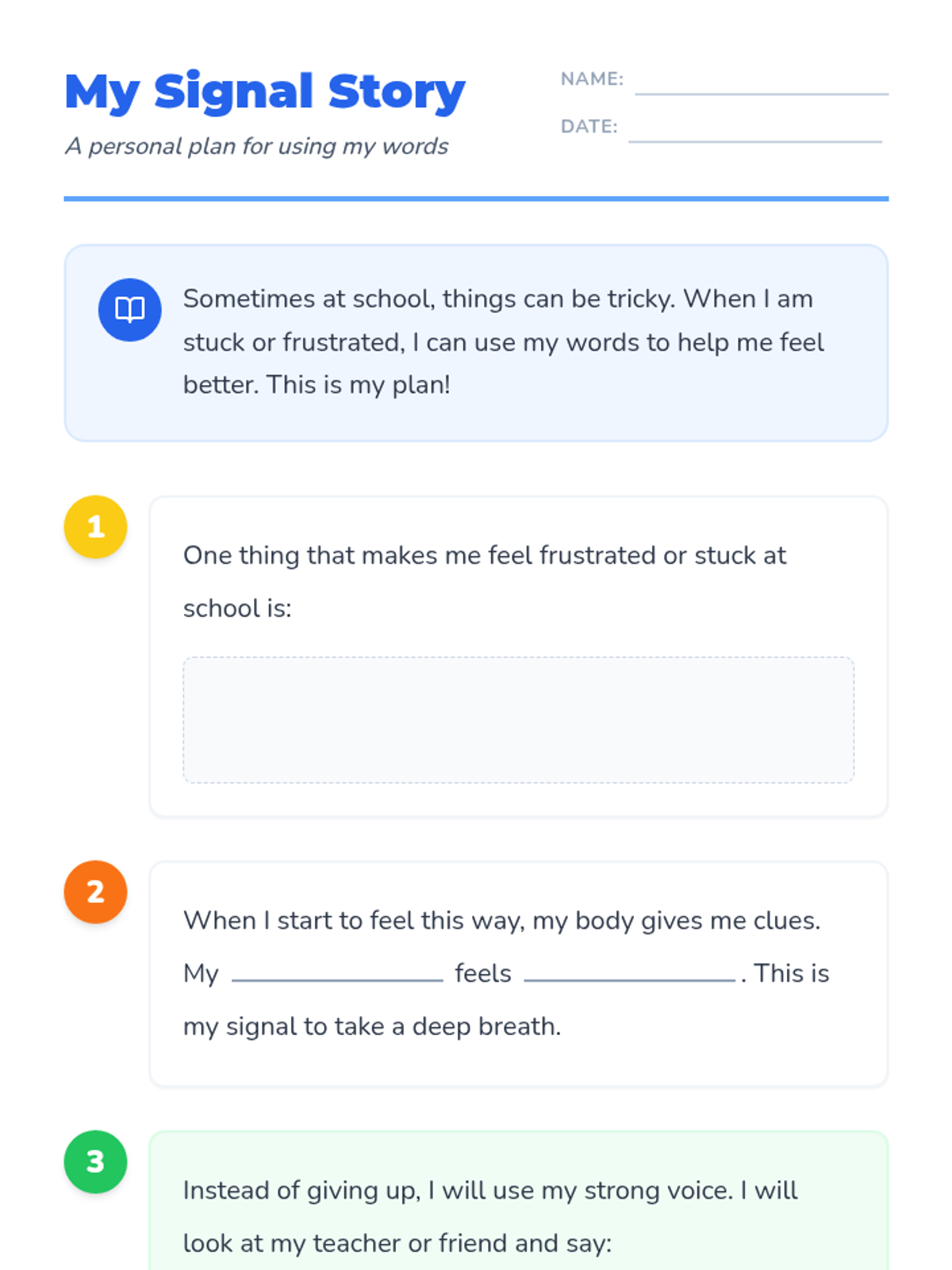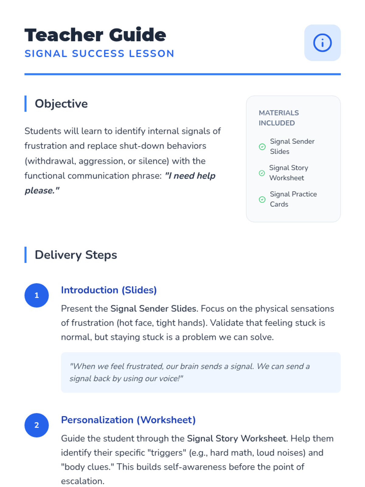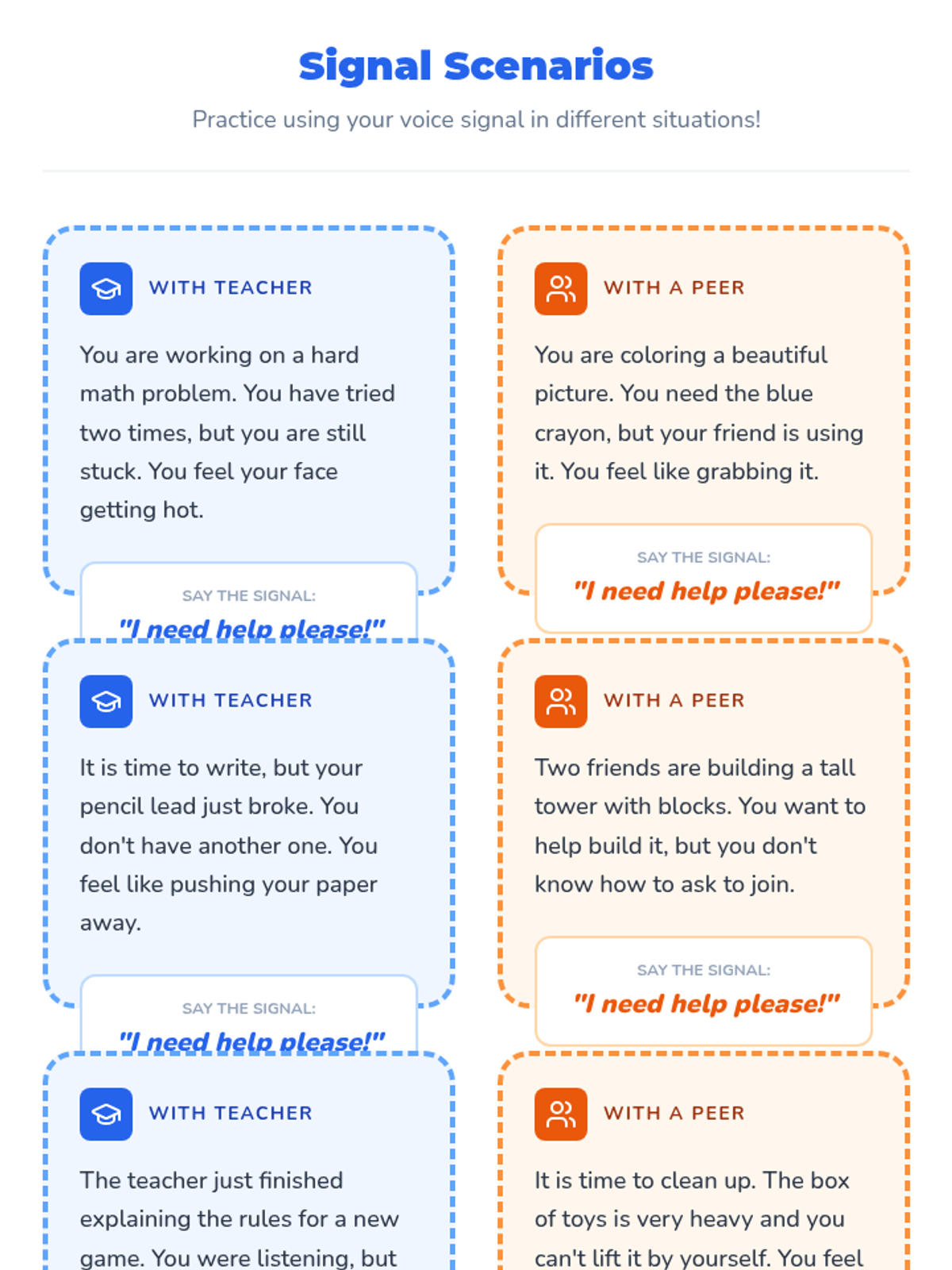 A comprehensive lesson designed to help students master the phrase 'I need help please' when feeling frustrated or stuck with teachers and peers. Includes a visual social story, an interactive worksheet, role-playing cards, and teacher guidance.