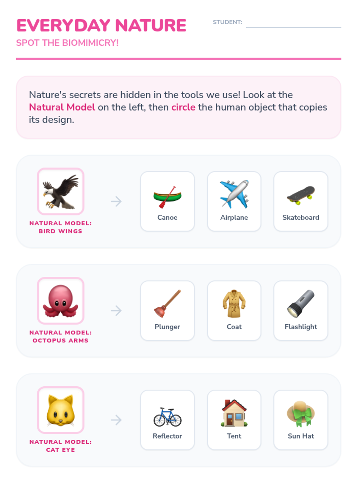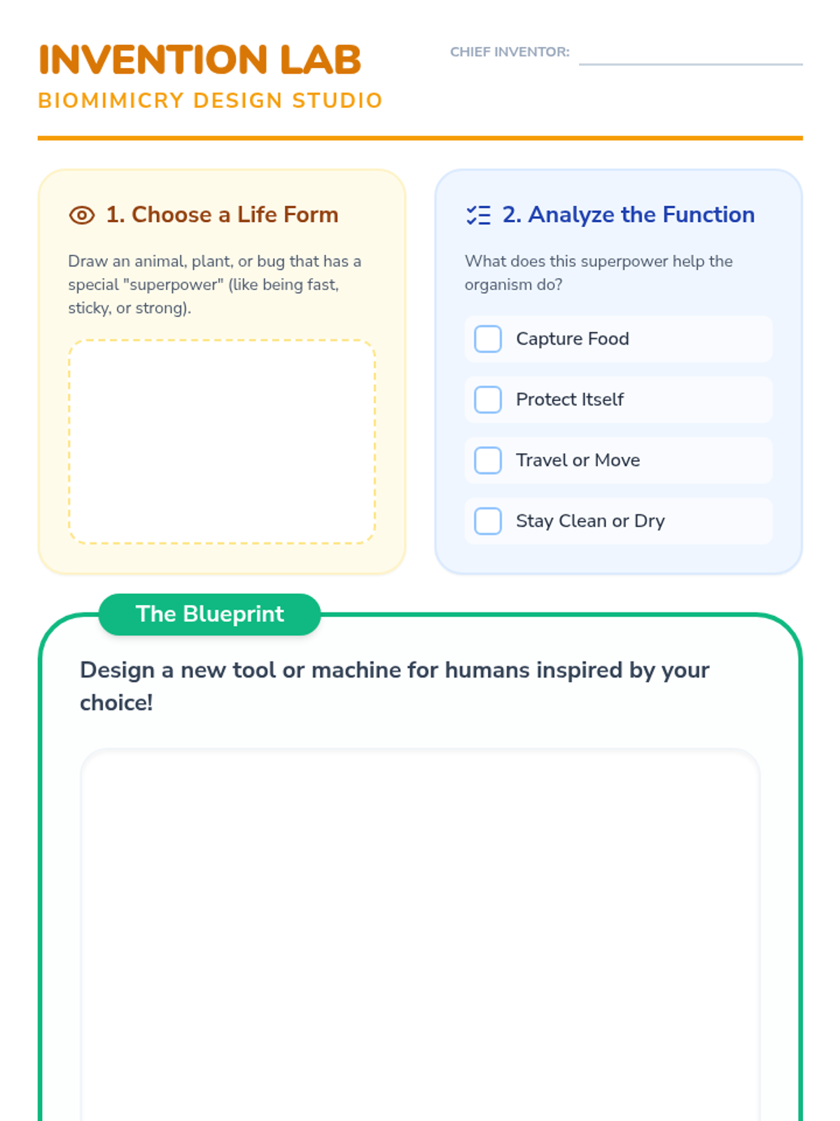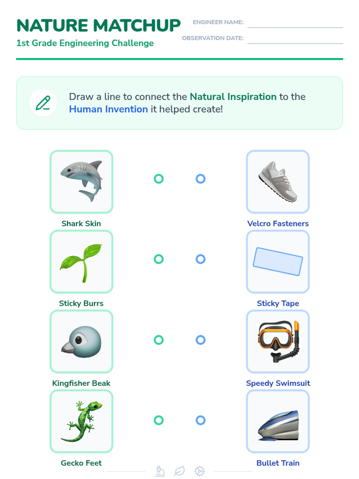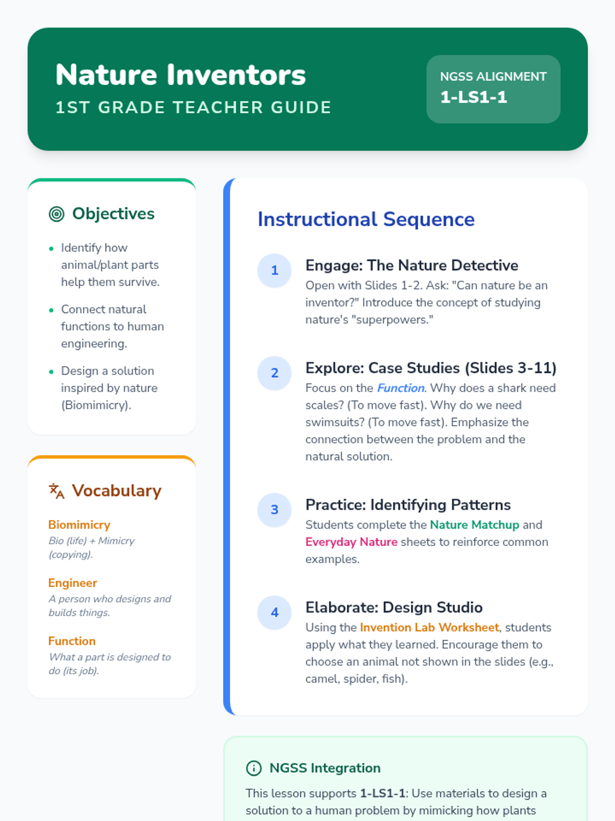 An introduction to biomimicry for 1st Grade students, exploring how plants and animals inspire human inventions through interactive slides and creative worksheets.