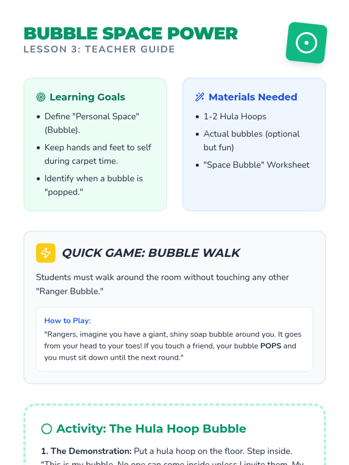 Introduces the concept of 'Personal Space Bubbles' and teaches students how to keep their hands and feet to themselves during transitions and floor time.