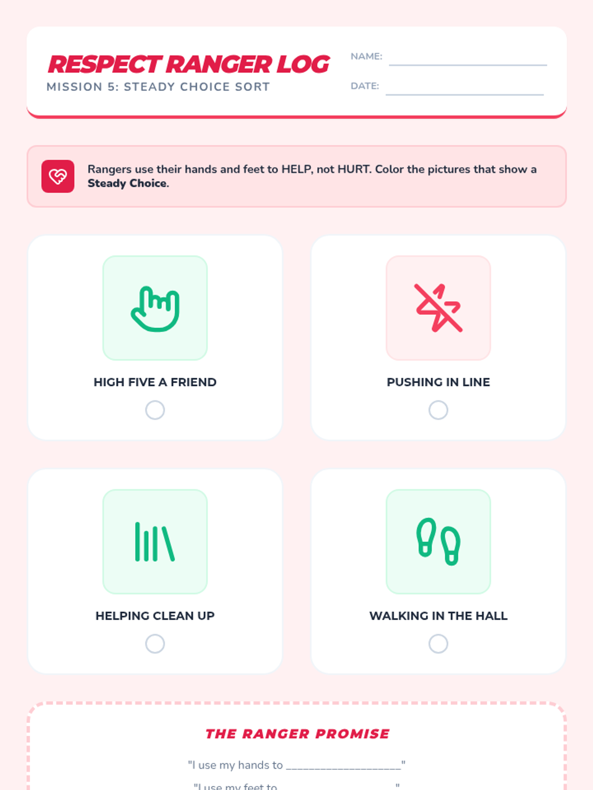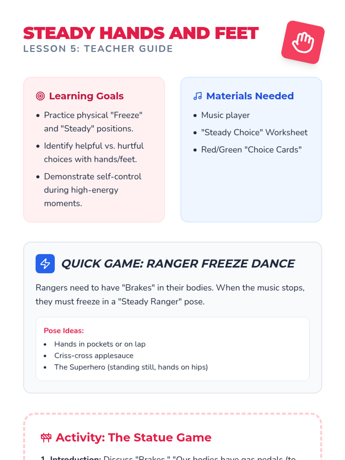 Focuses on physical self-control and 'steady' bodies. Students practice freezing, controlled movements, and making safe choices with their hands and feet.