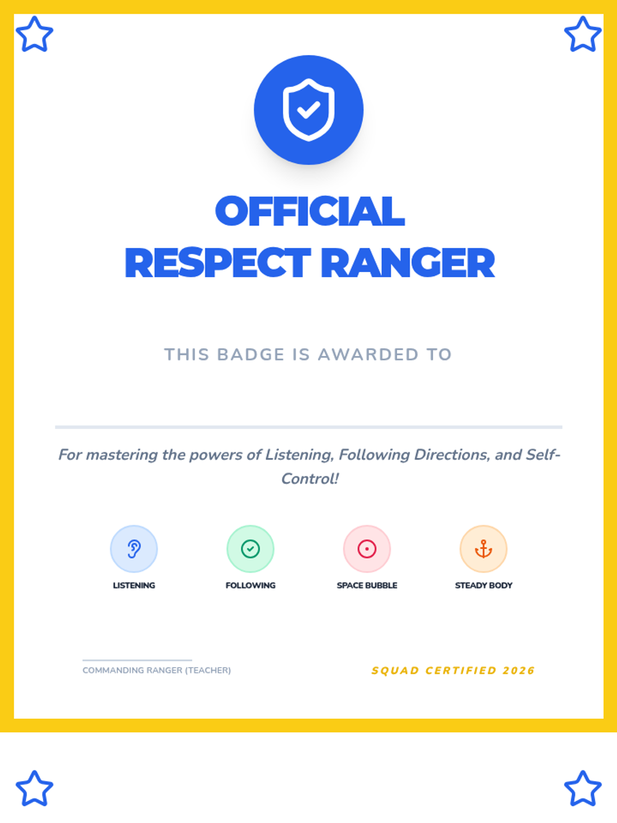 A review of all skills through an obstacle course and celebration. Students reflect on their growth and receive their 'Respect Ranger' badges.