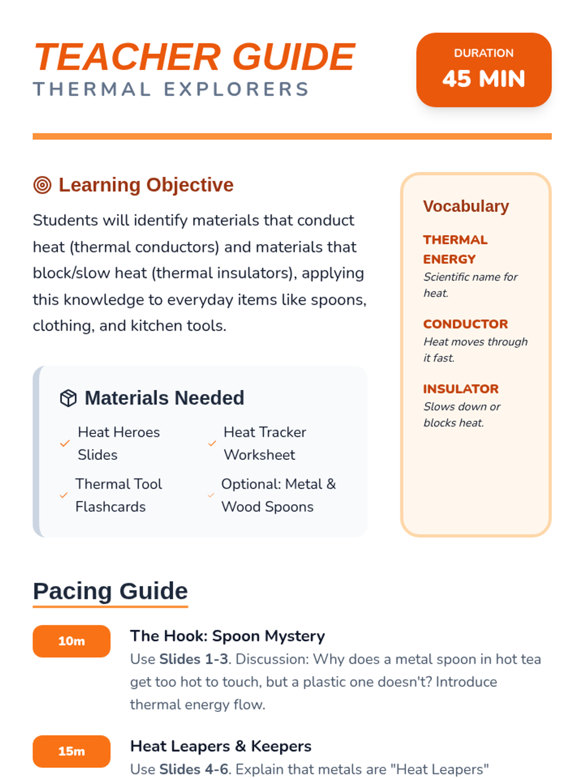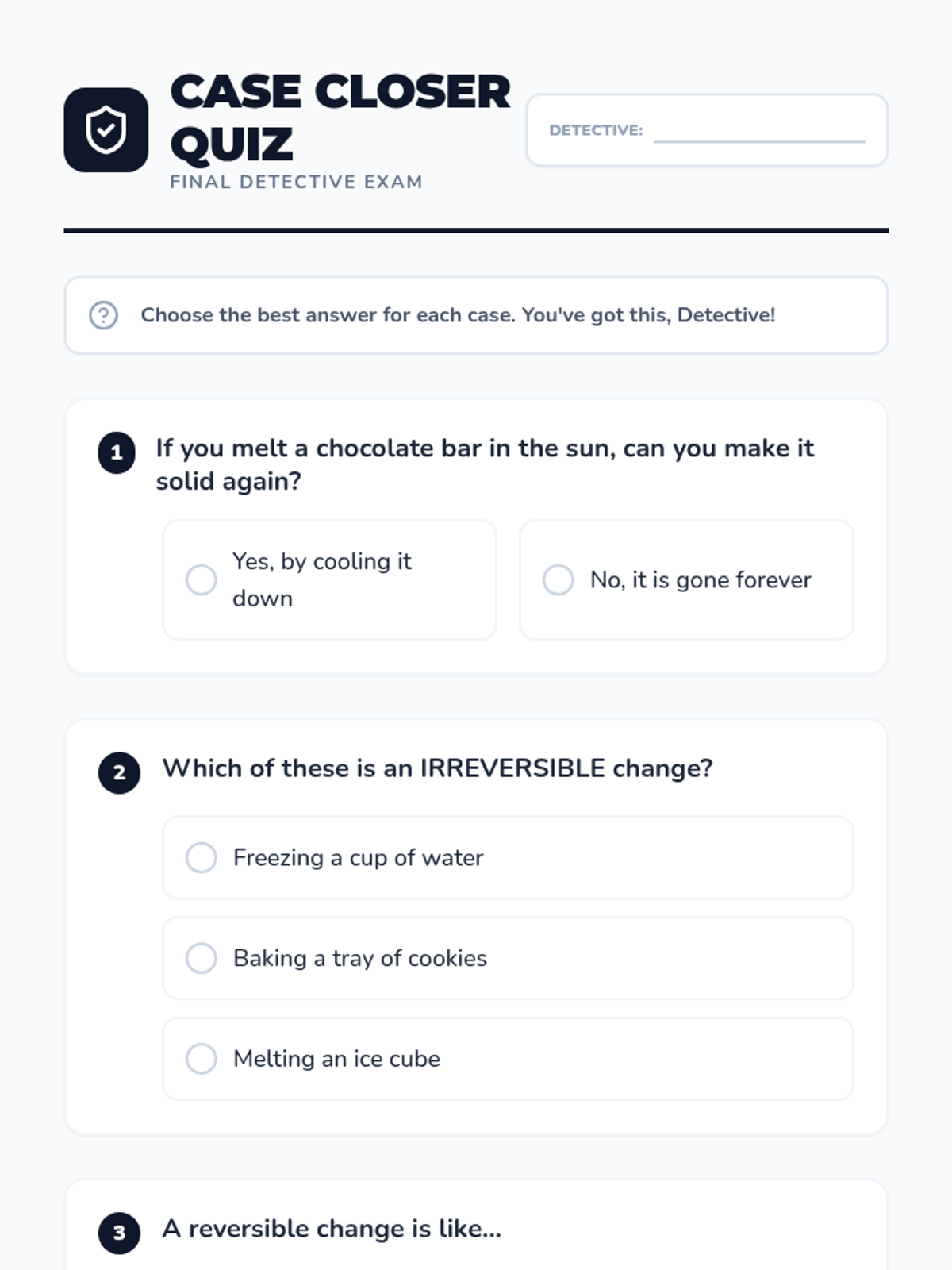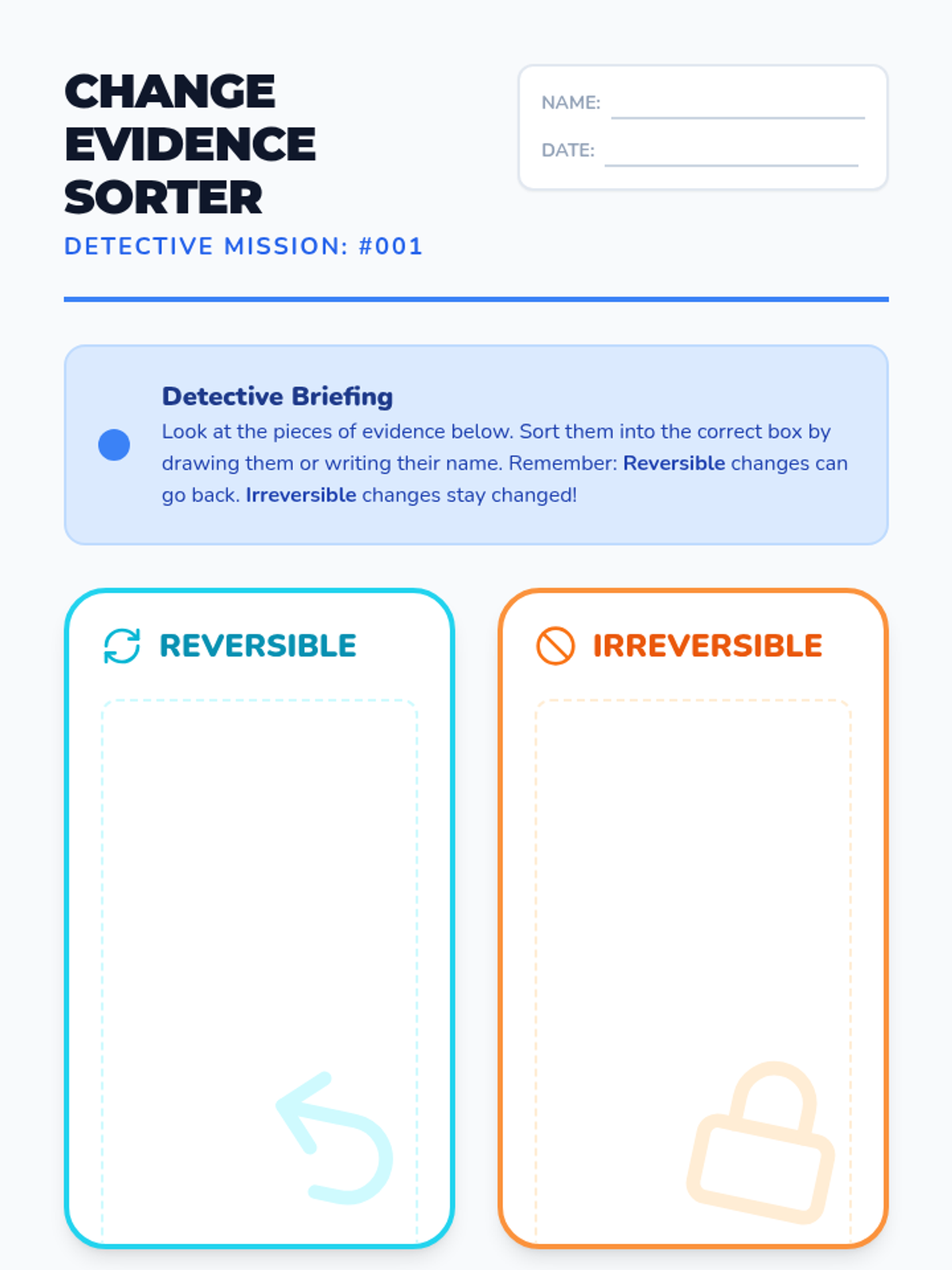 A hands-on exploration of how matter can change through heating and cooling. Students act as 'Change Detectives' to identify which changes can be undone and which are permanent.