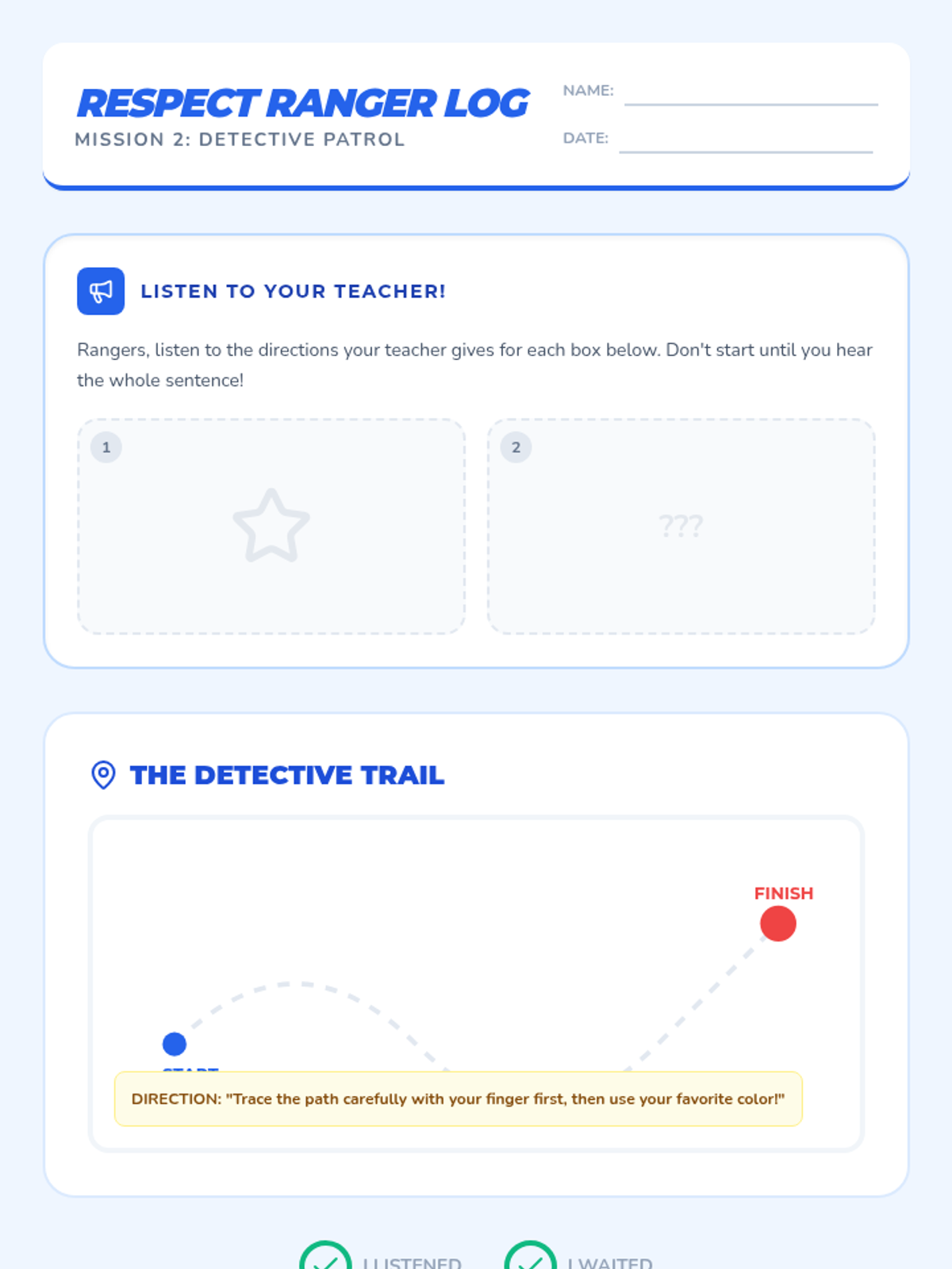 Focuses on accurately following one-step verbal directions through movement and games. Students practice being 'detectives' who catch instructions the first time they are given.