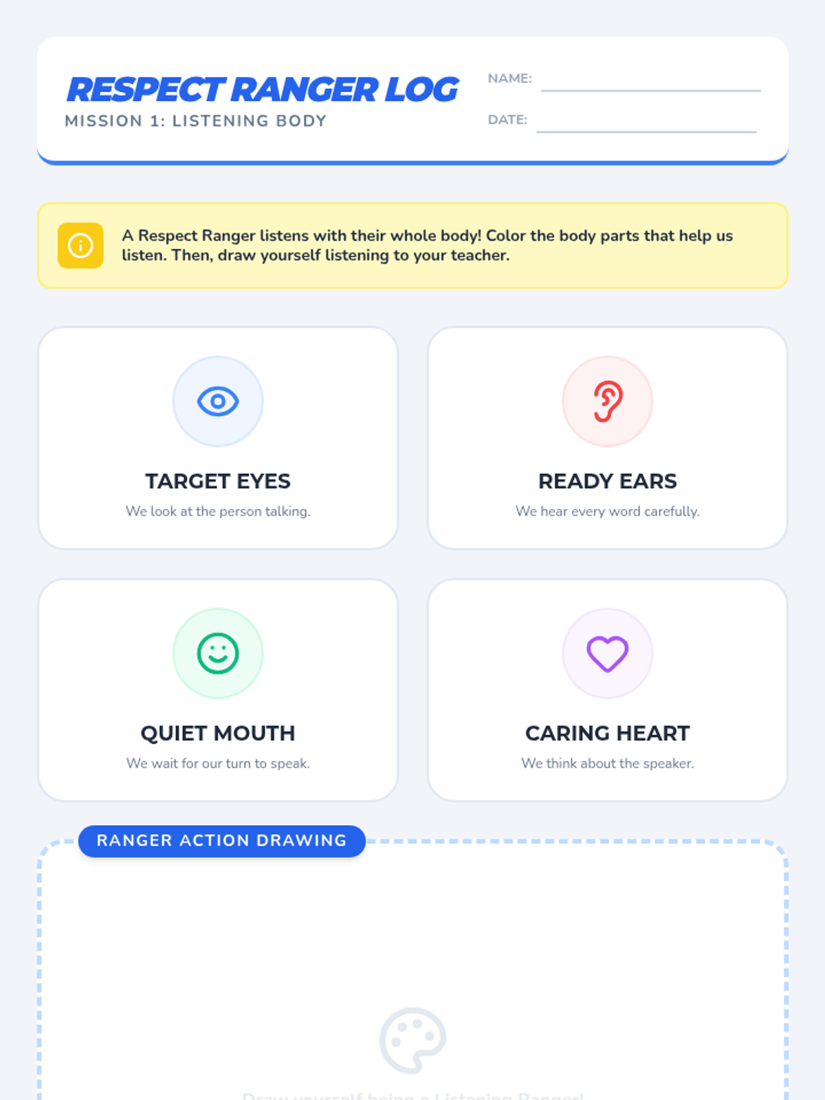 Students learn the components of 'Whole Body Listening,' focusing on using their eyes, ears, and mouths to show they are ready to learn. Includes a 'Simon Says' variation and a 'Sound Scavenger Hunt' activity.