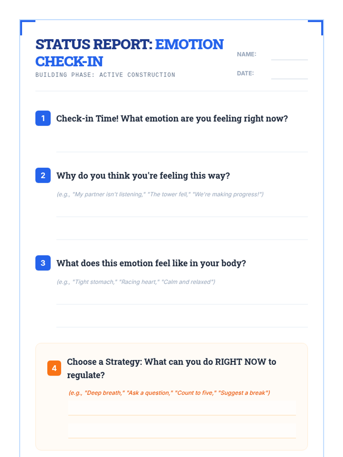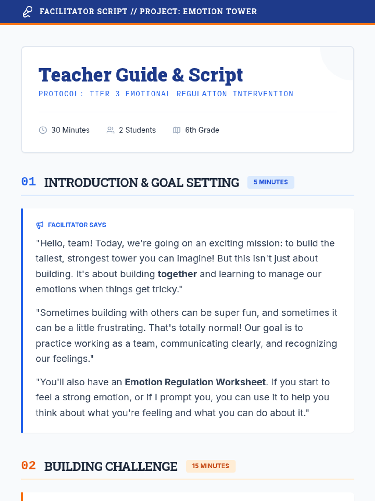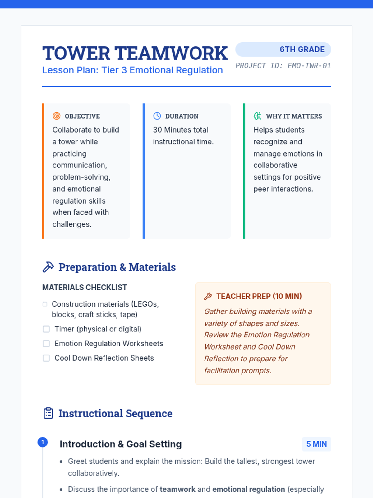 A 30-minute Tier 3 intervention for 6th-grade students to practice emotional regulation and teamwork while collaboratively building a tower.