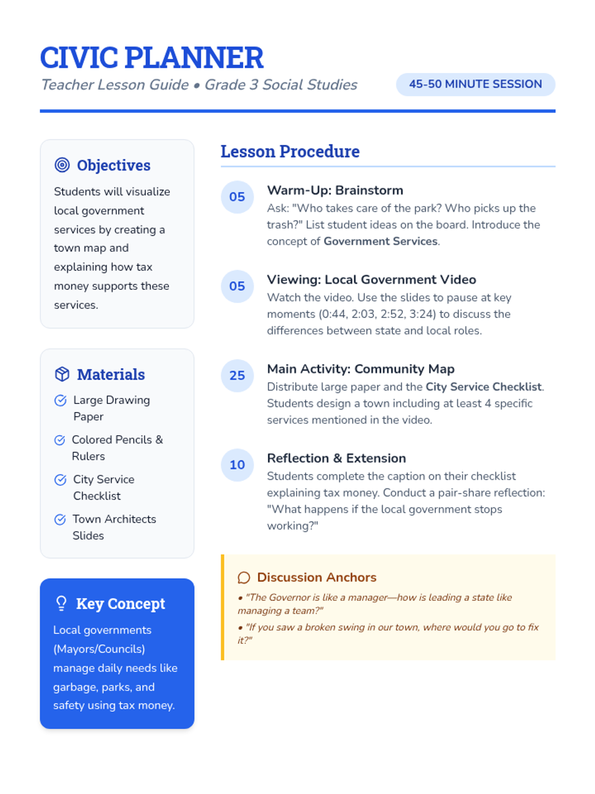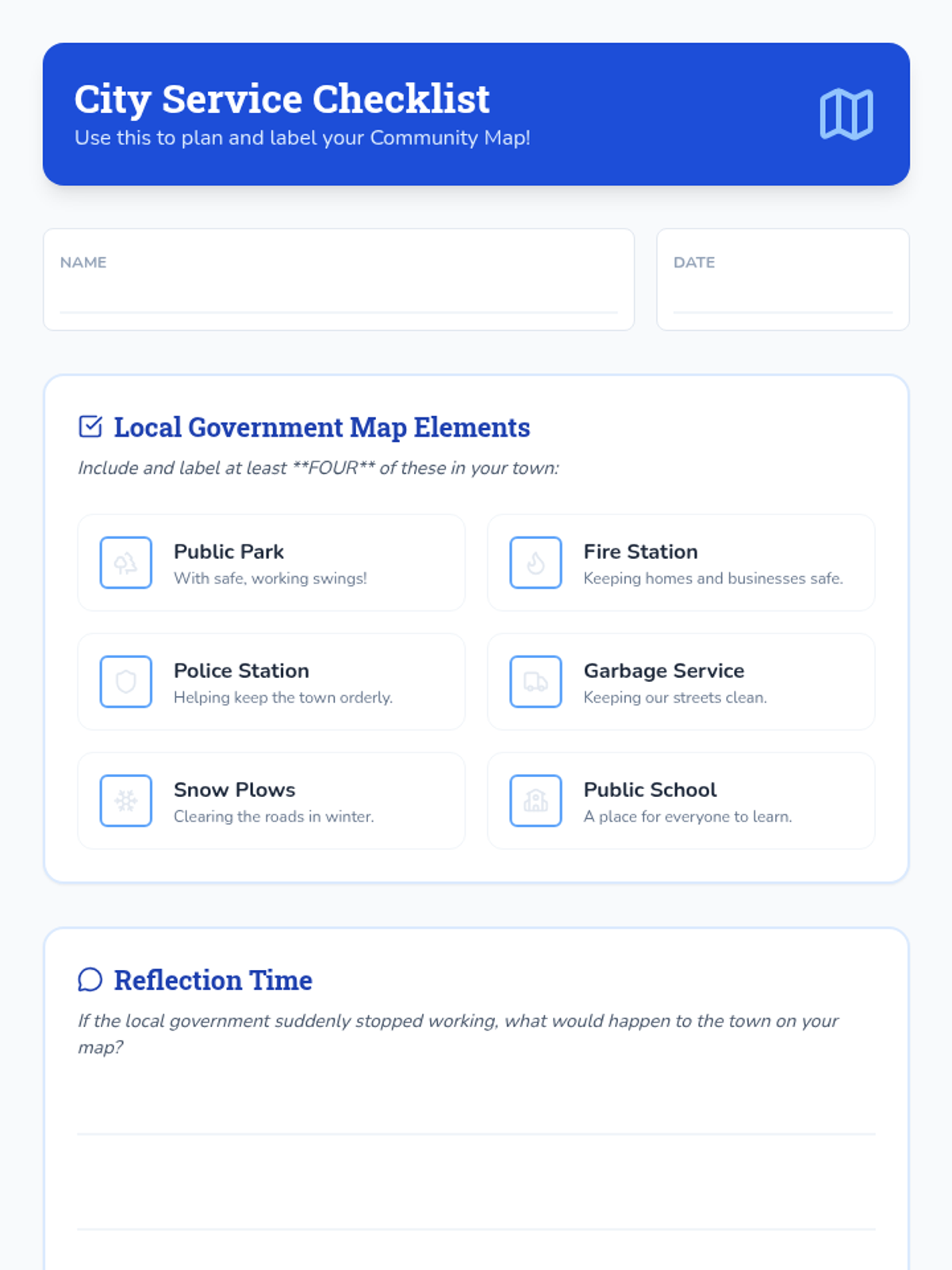 Students will explore how local governments provide essential services to communities. They will watch a video on city and state roles, then design a 'Community Map' to visualize services like fire stations, parks, and waste management, concluding with a reflection on the importance of civic infrastructure.