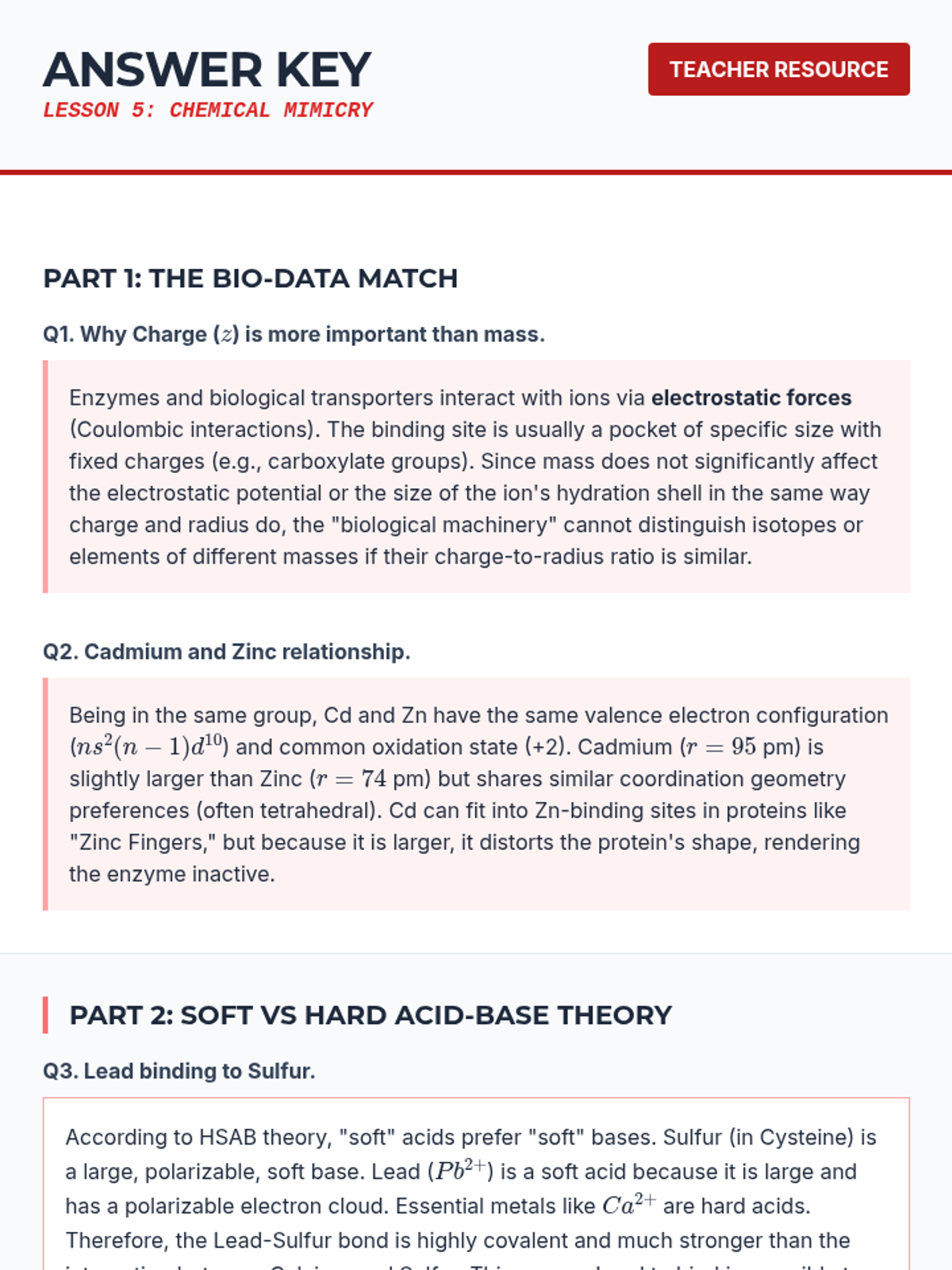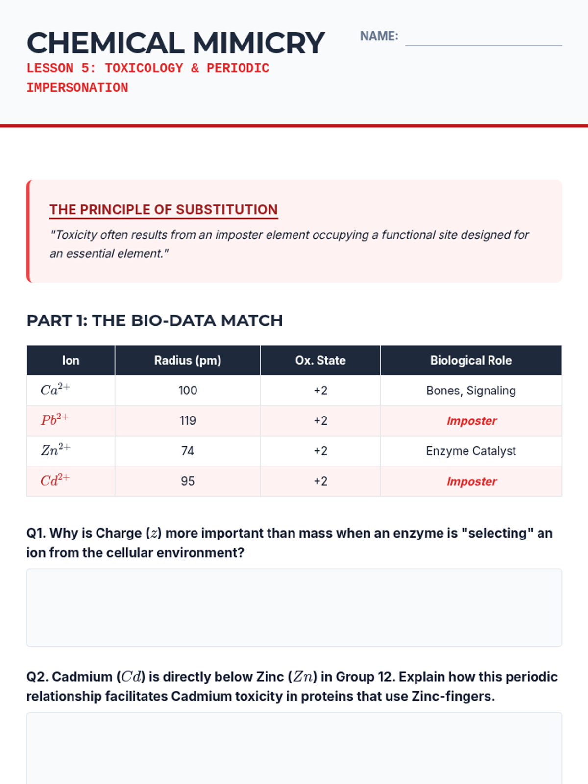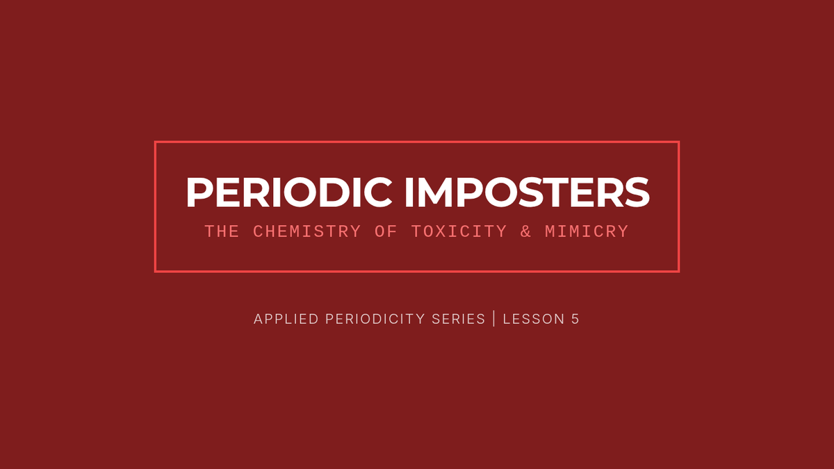 The sequence concludes by examining how heavy metals (Pb, Cd, Tl) mimic essential elements (Ca, Zn, K) due to similar periodic properties, leading to biological toxicity.