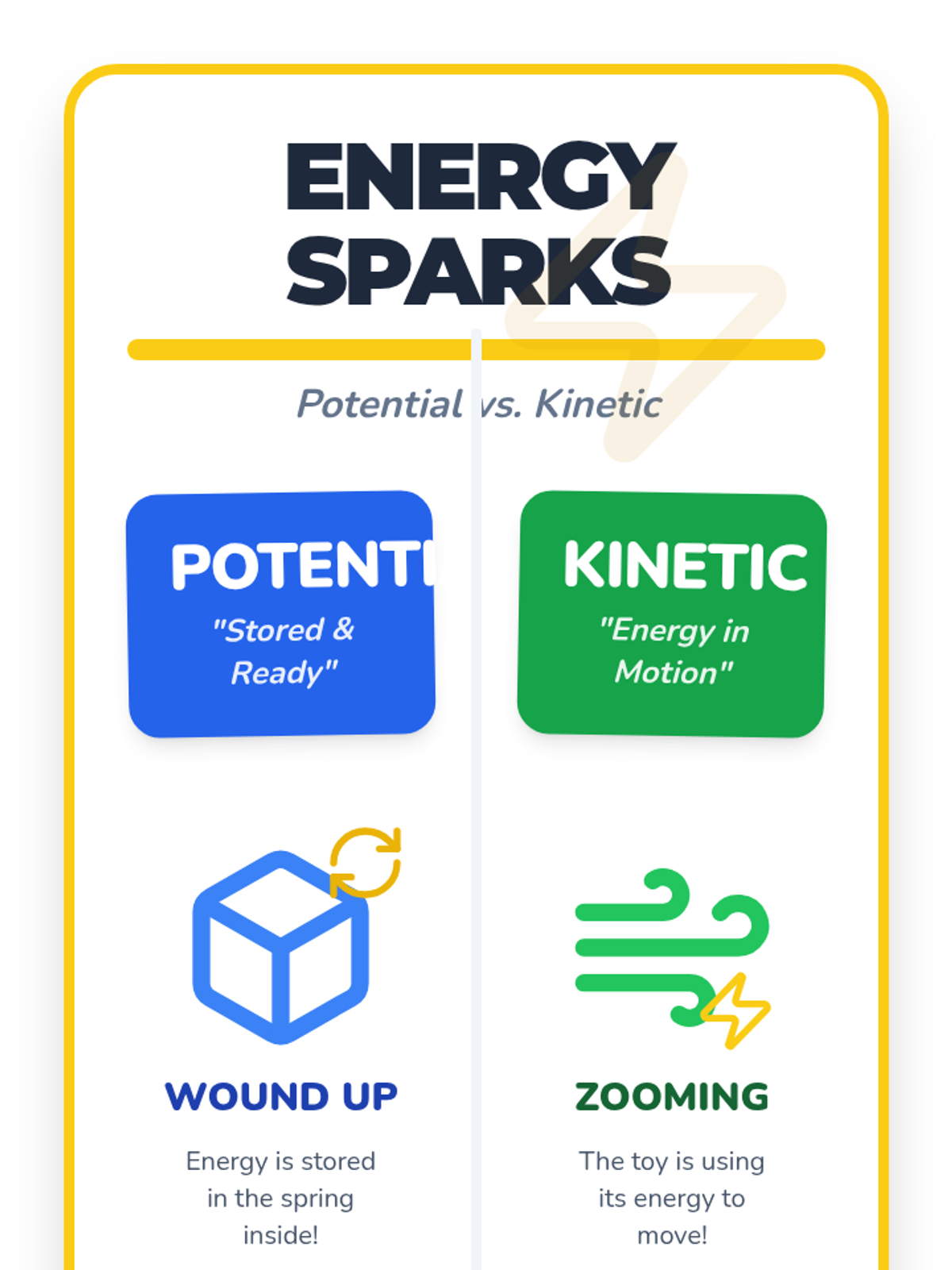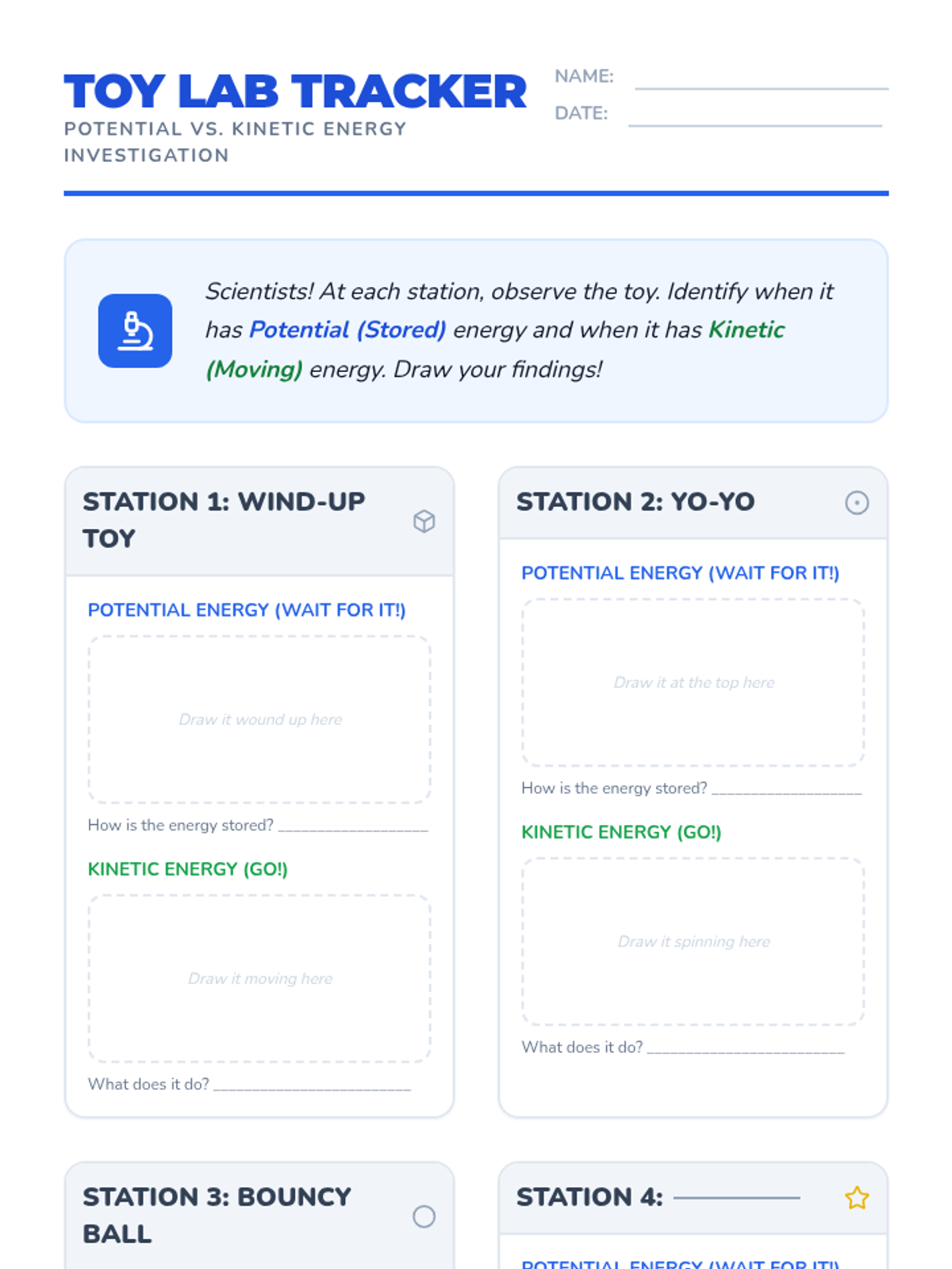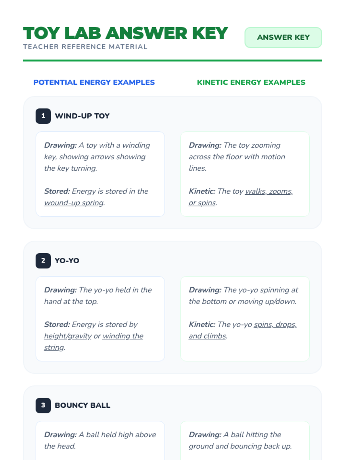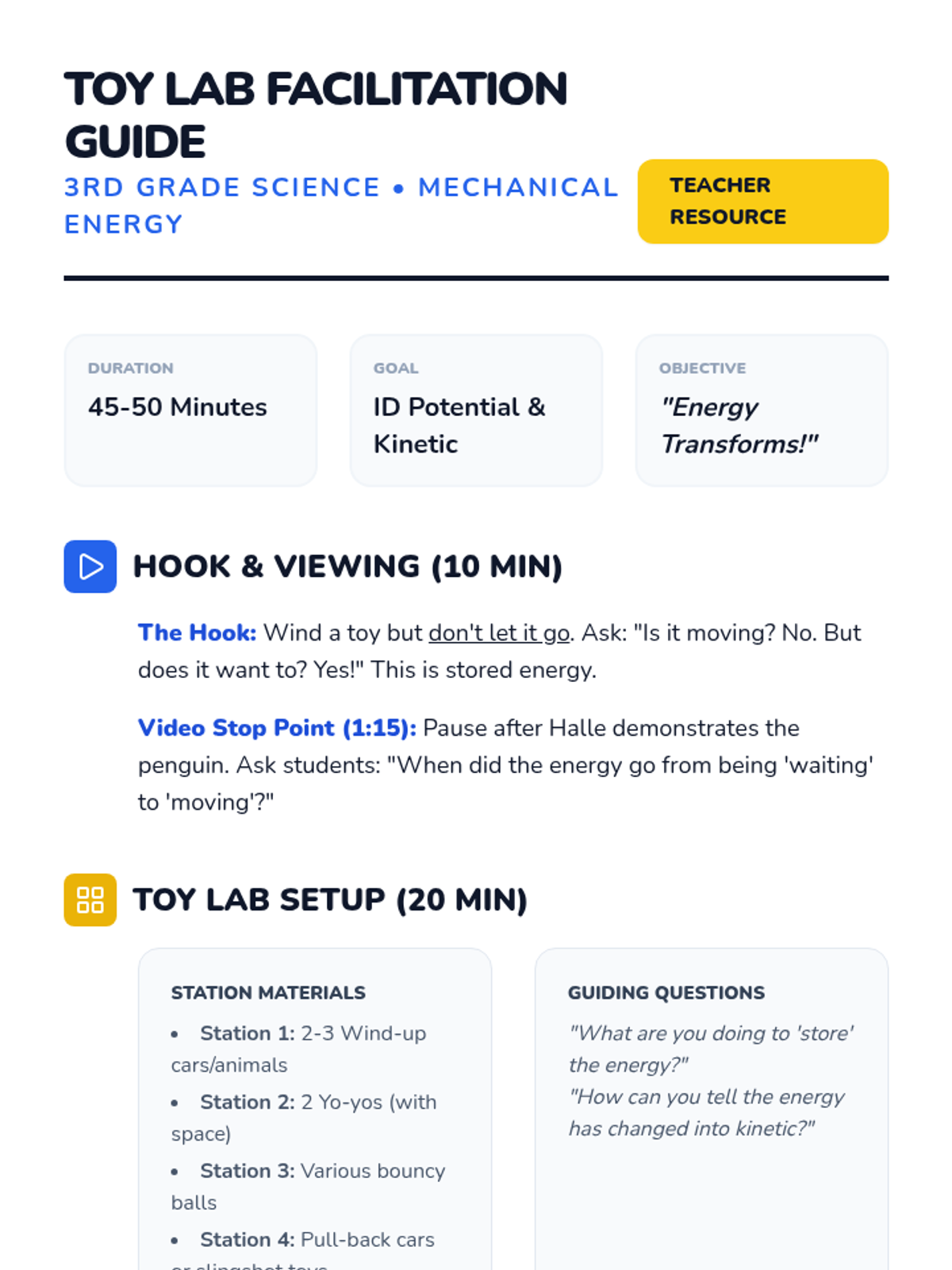 A 3rd-grade science lesson where students explore the concepts of potential (stored) and kinetic (moving) energy through hands-on interaction with everyday toys like wind-up cars, yo-yos, and bouncy balls.