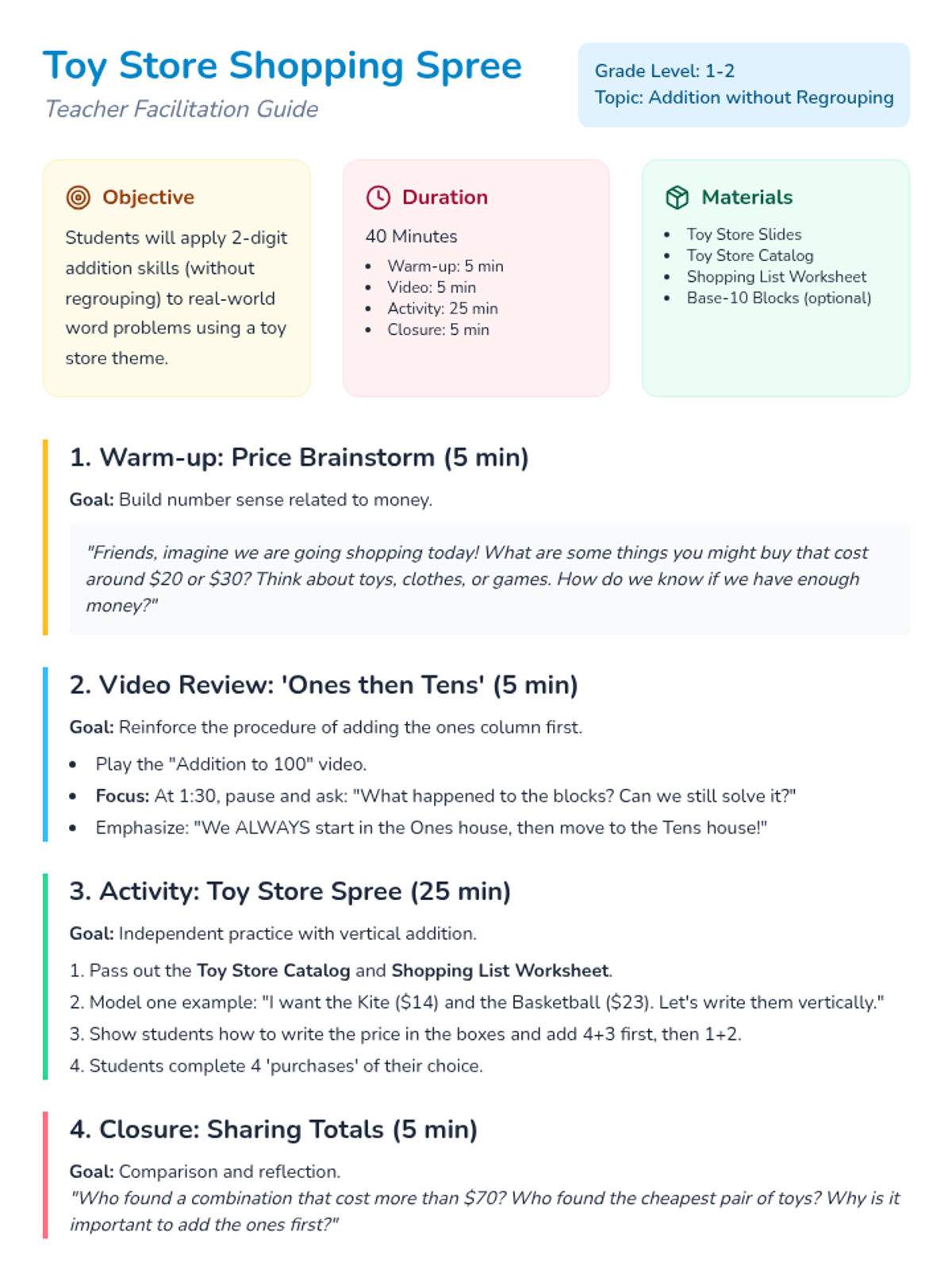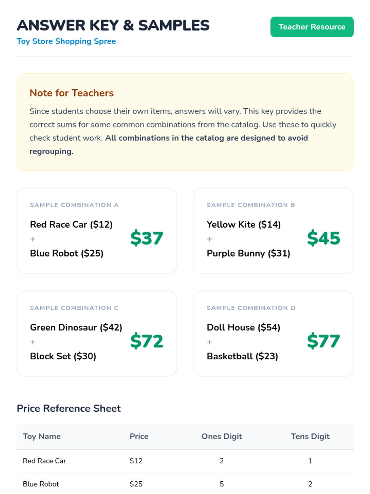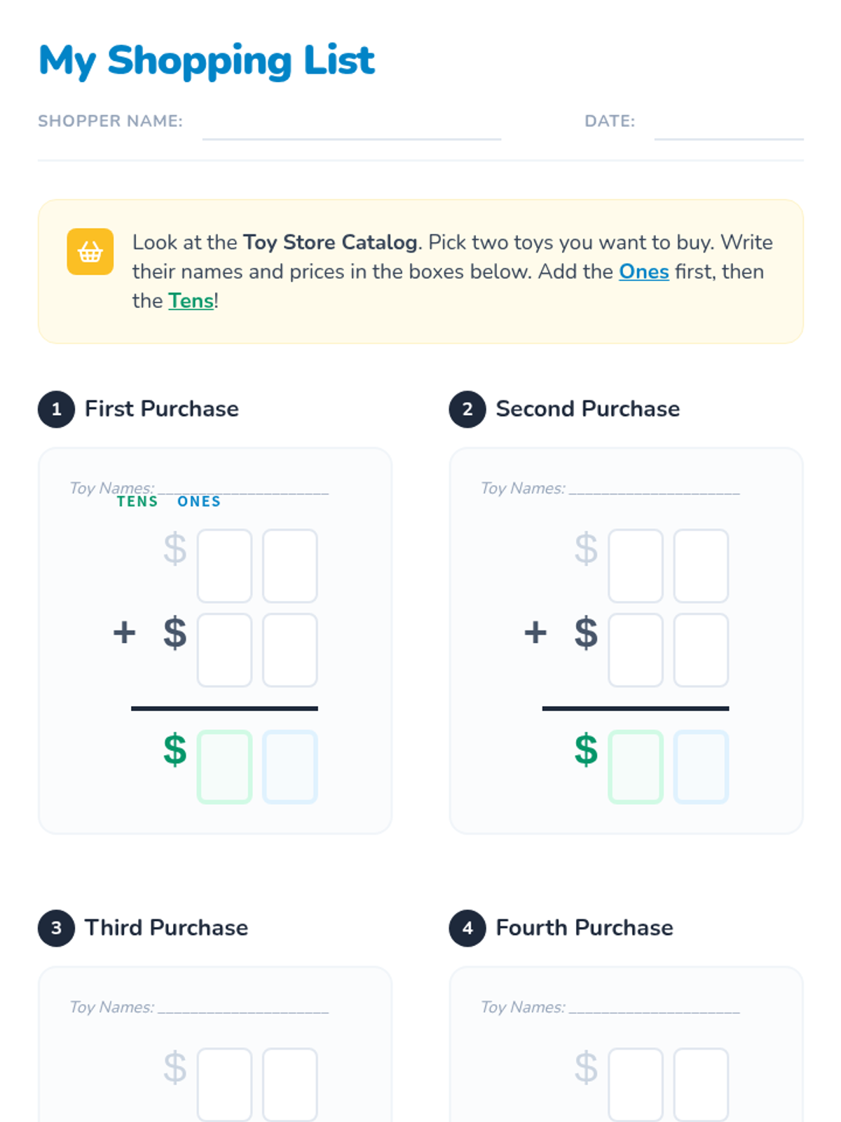 A fun, hands-on math lesson where students practice 2-digit addition without regrouping by 'shopping' for toys in a catalog. Students will use vertical addition to calculate totals for their favorite toy combinations.