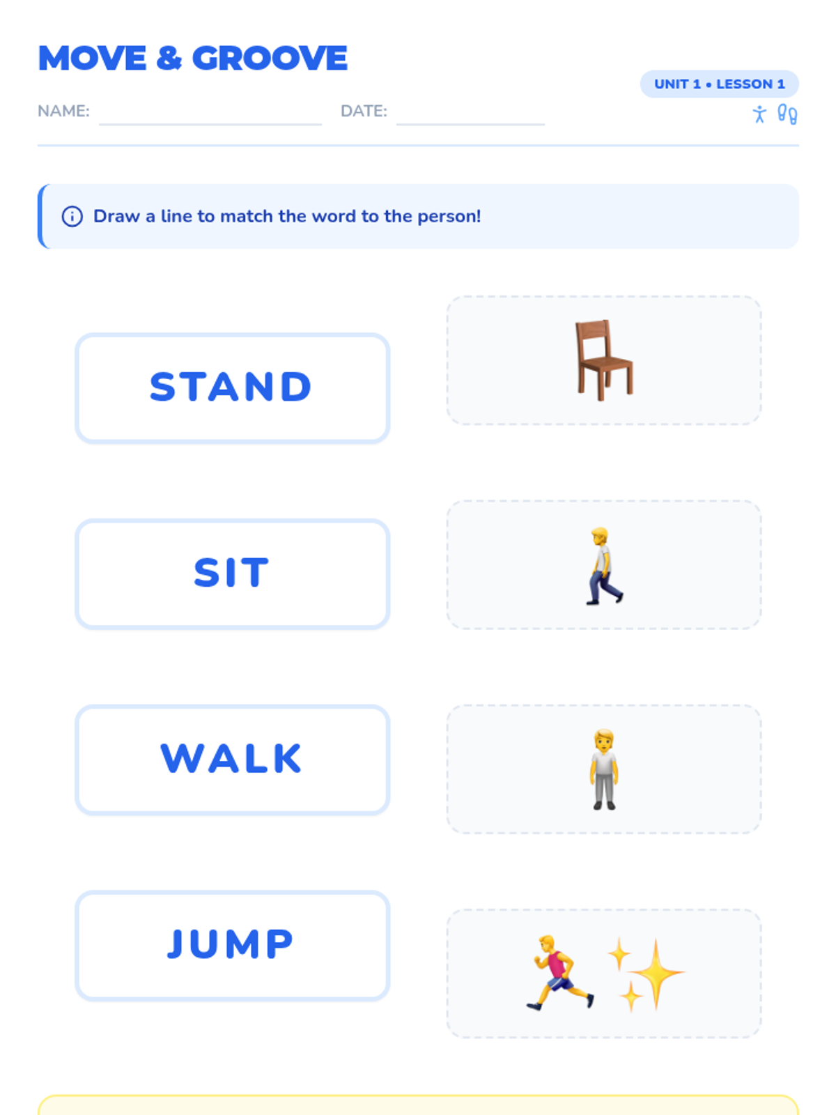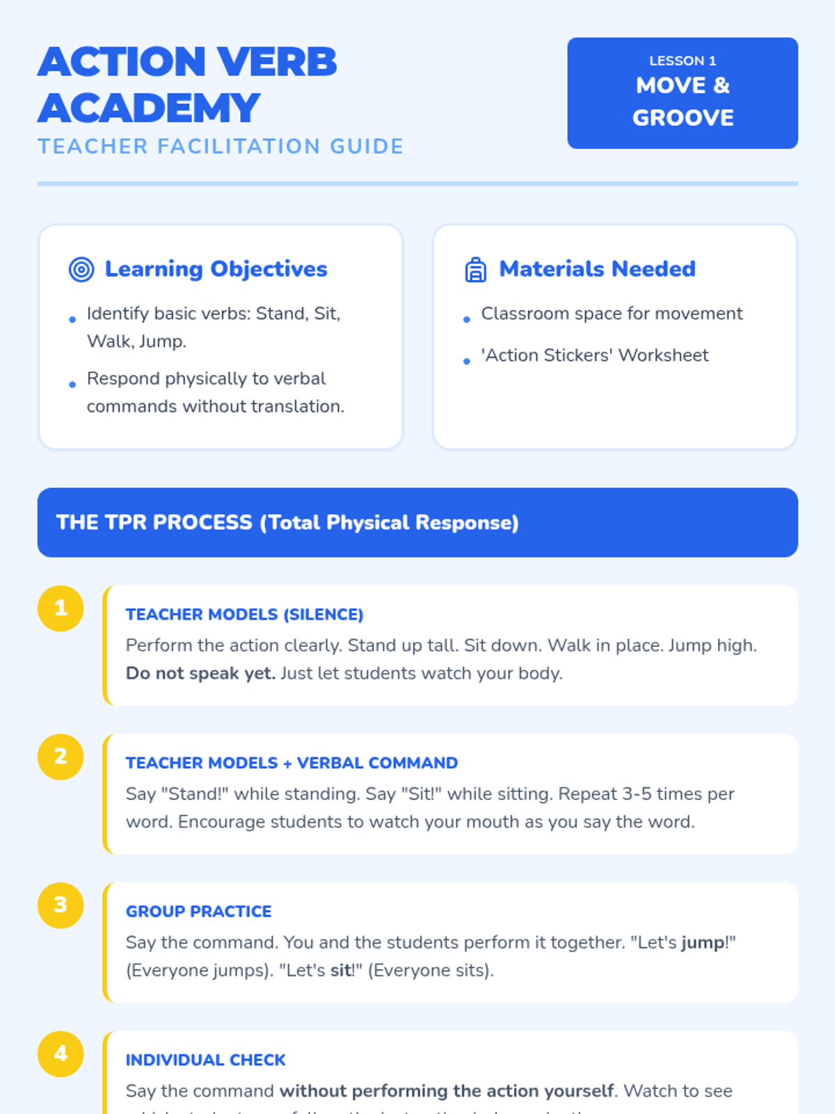 Students learn basic movement verbs (stand, sit, walk, jump) by mimicking the teacher's actions through TPR.