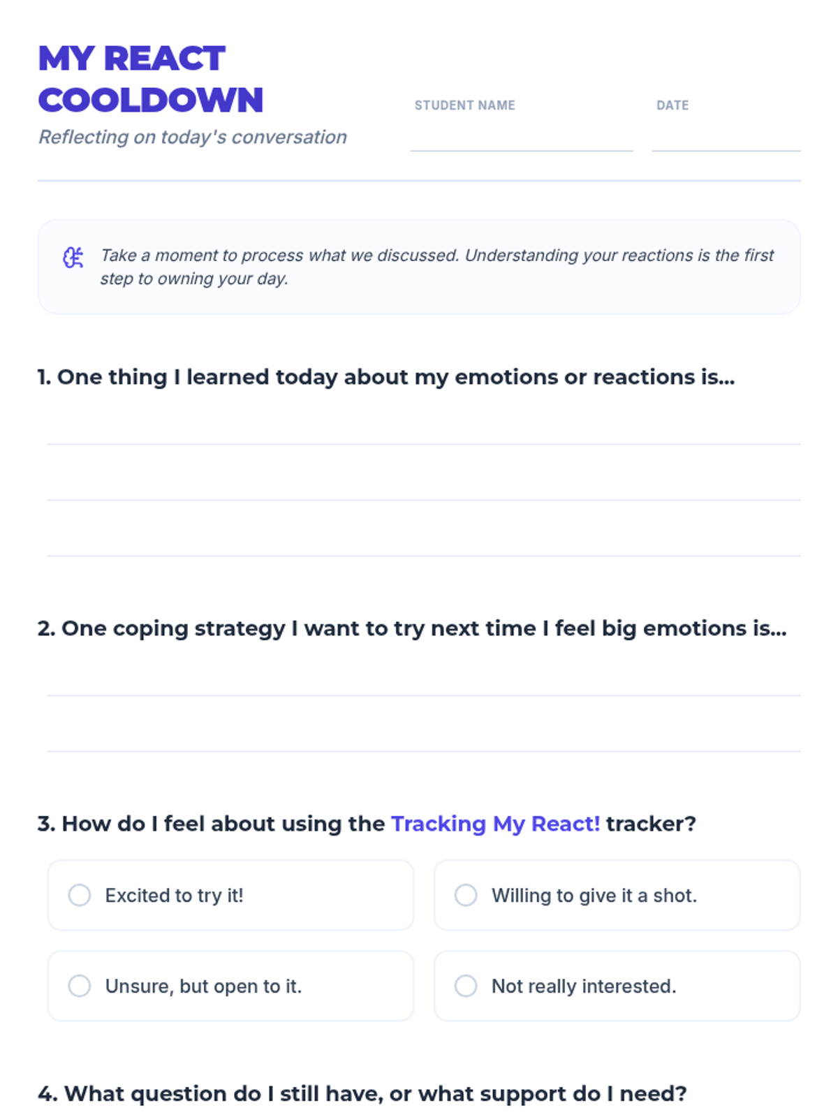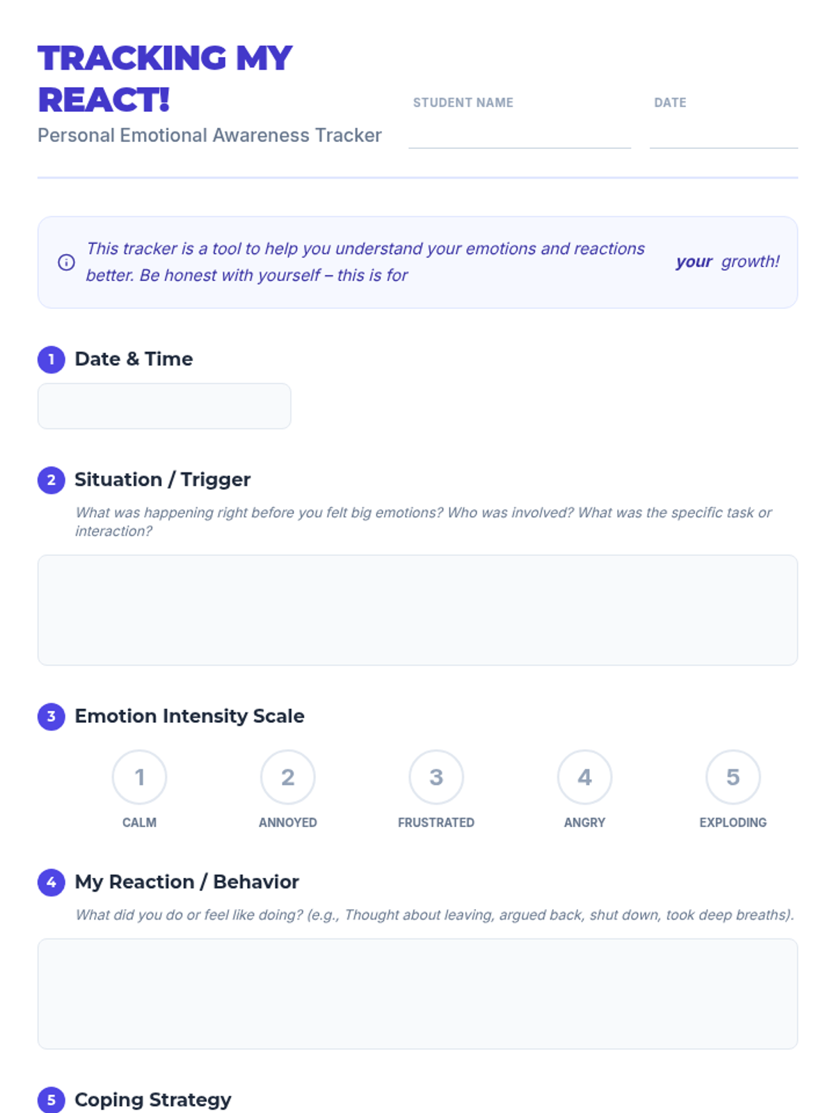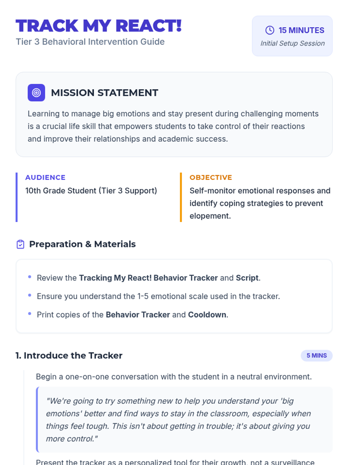 A Tier 3 behavioral intervention for 10th-grade students to track emotional responses, identify triggers, and develop coping strategies to prevent elopement and escalation.