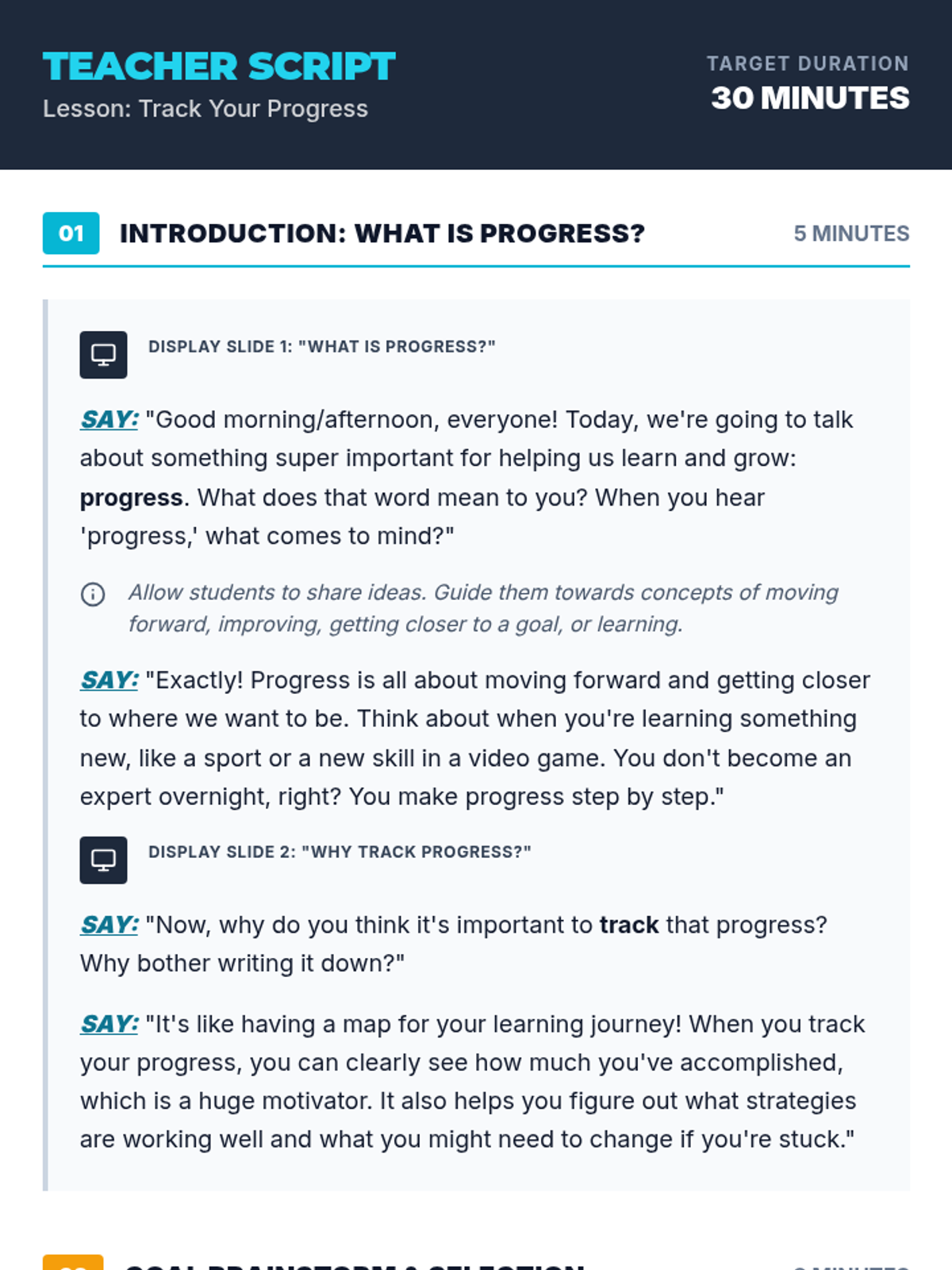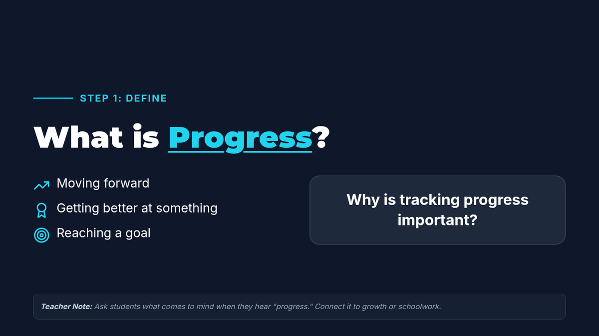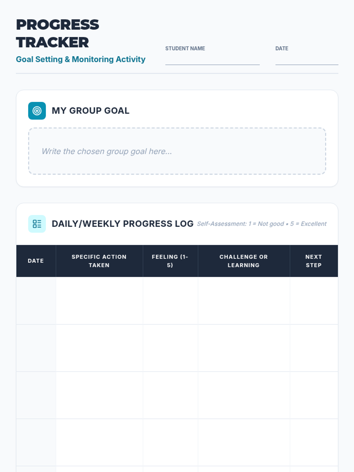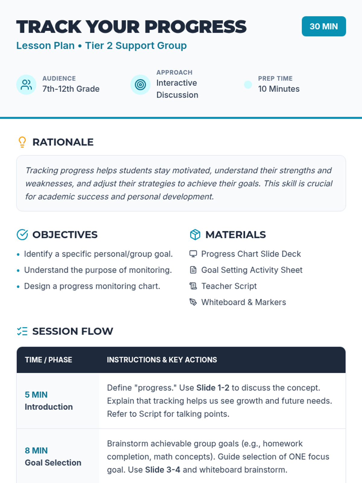 A 30-minute Tier 2 small group lesson for grades 7-12 focused on the importance of tracking progress toward goals, featuring collaborative chart design and goal setting.