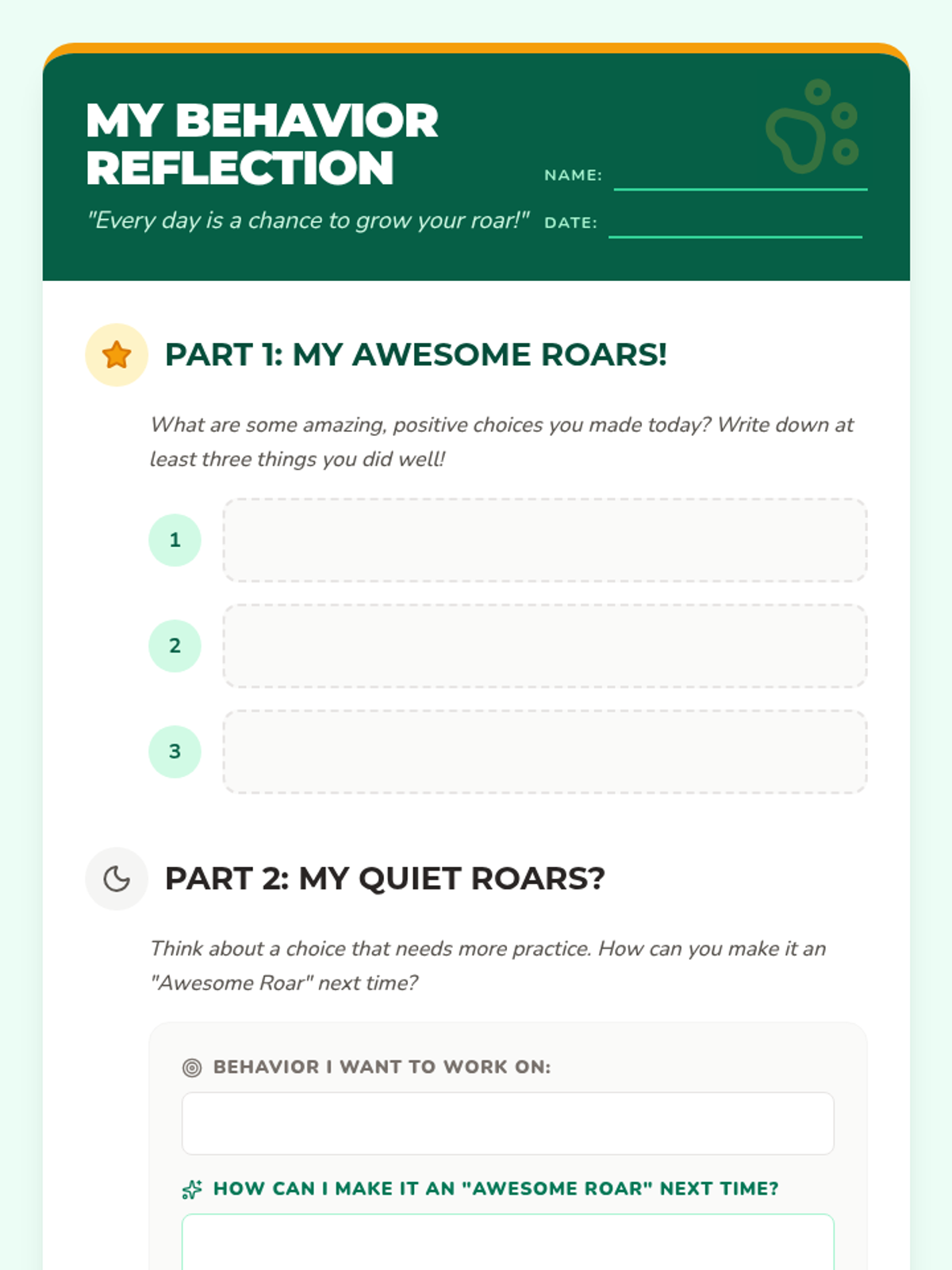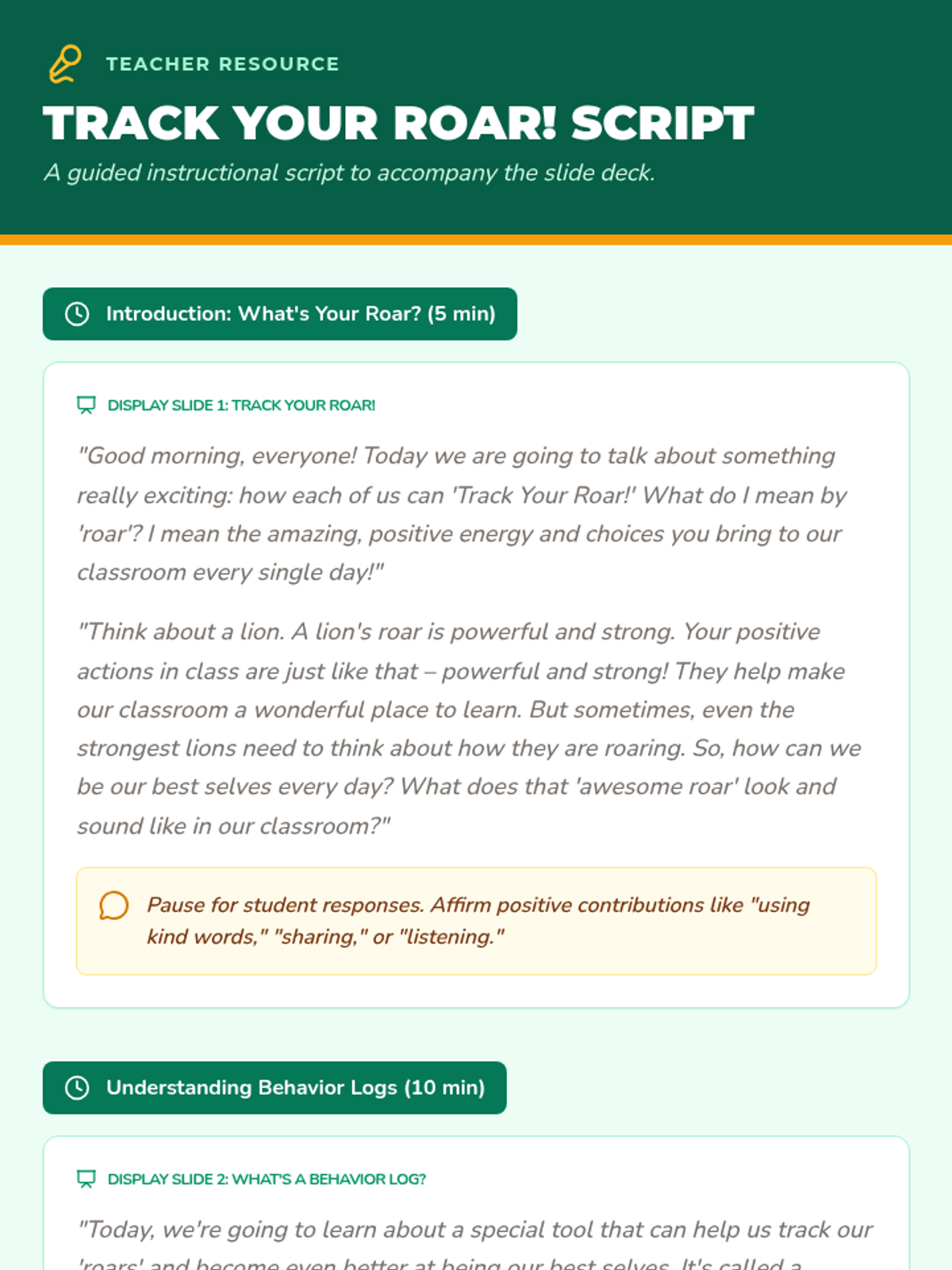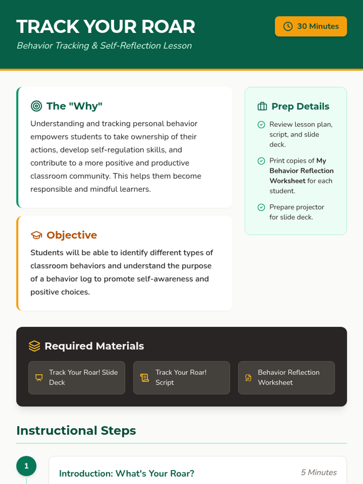 A 30-minute Tier 1 lesson for 3rd graders focusing on self-regulation and behavior tracking using a 'lion' metaphor to encourage positive classroom choices.