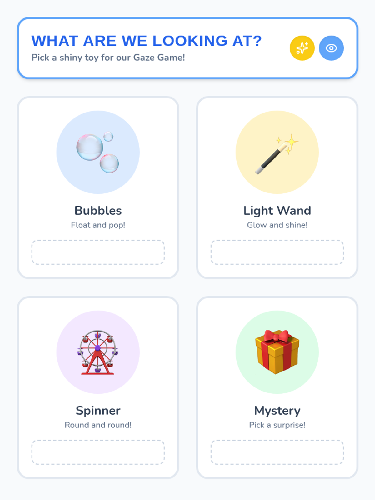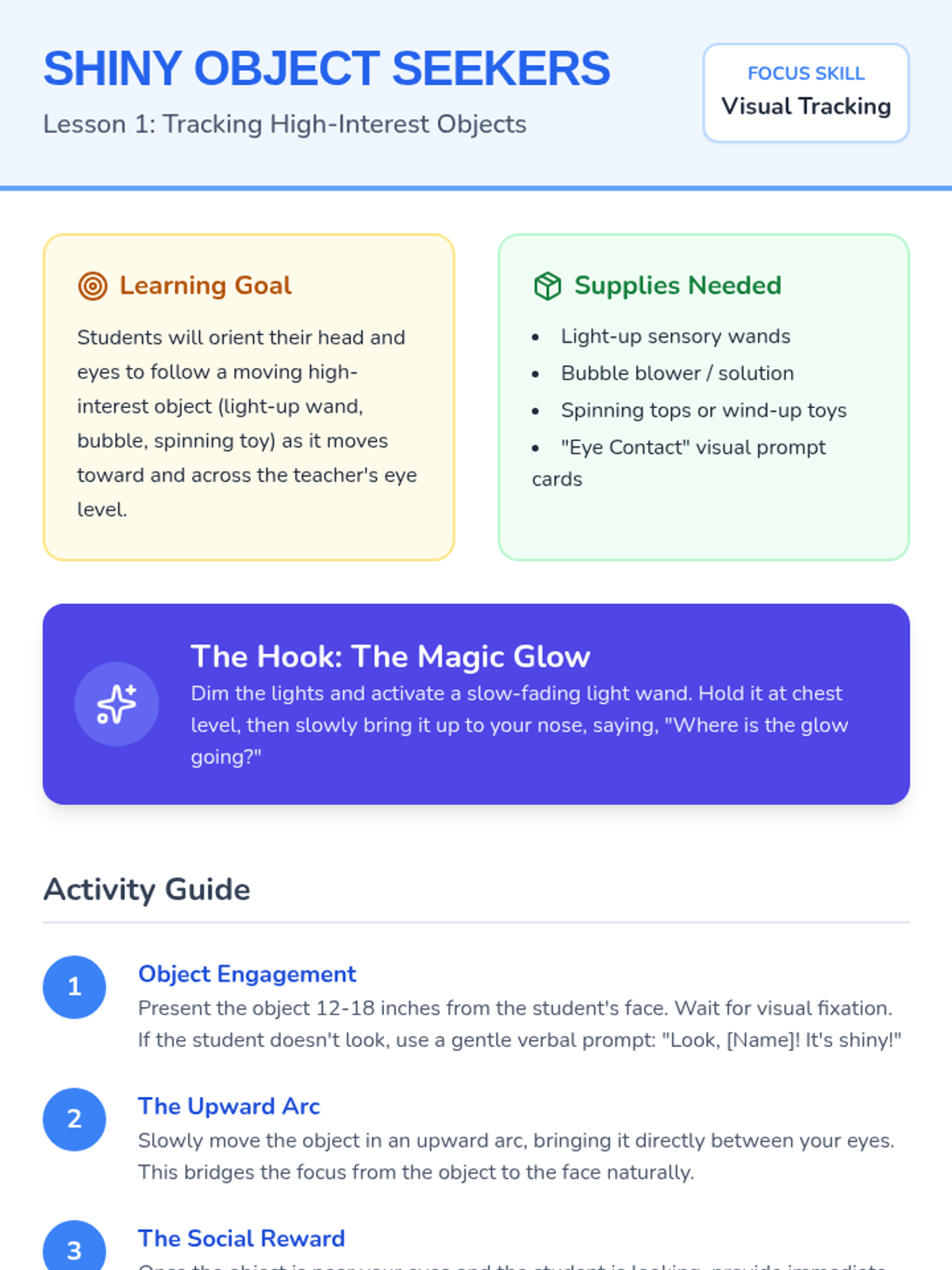 Students practice visual tracking and orientation by following brightly colored or light-up objects moved near the teacher's eyes, bridging the gap between looking at toys and looking at faces.